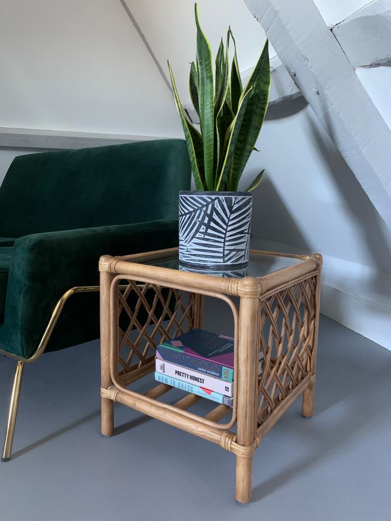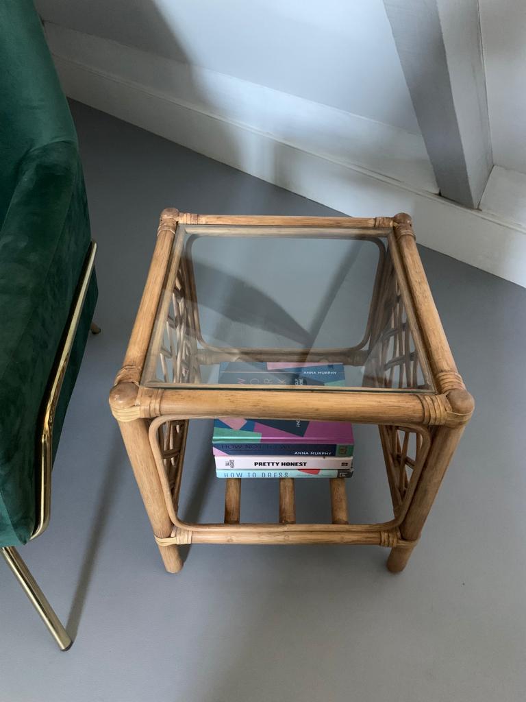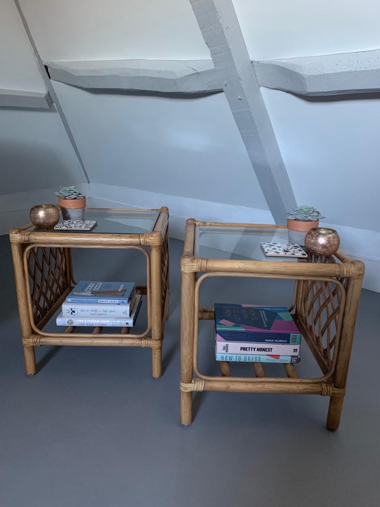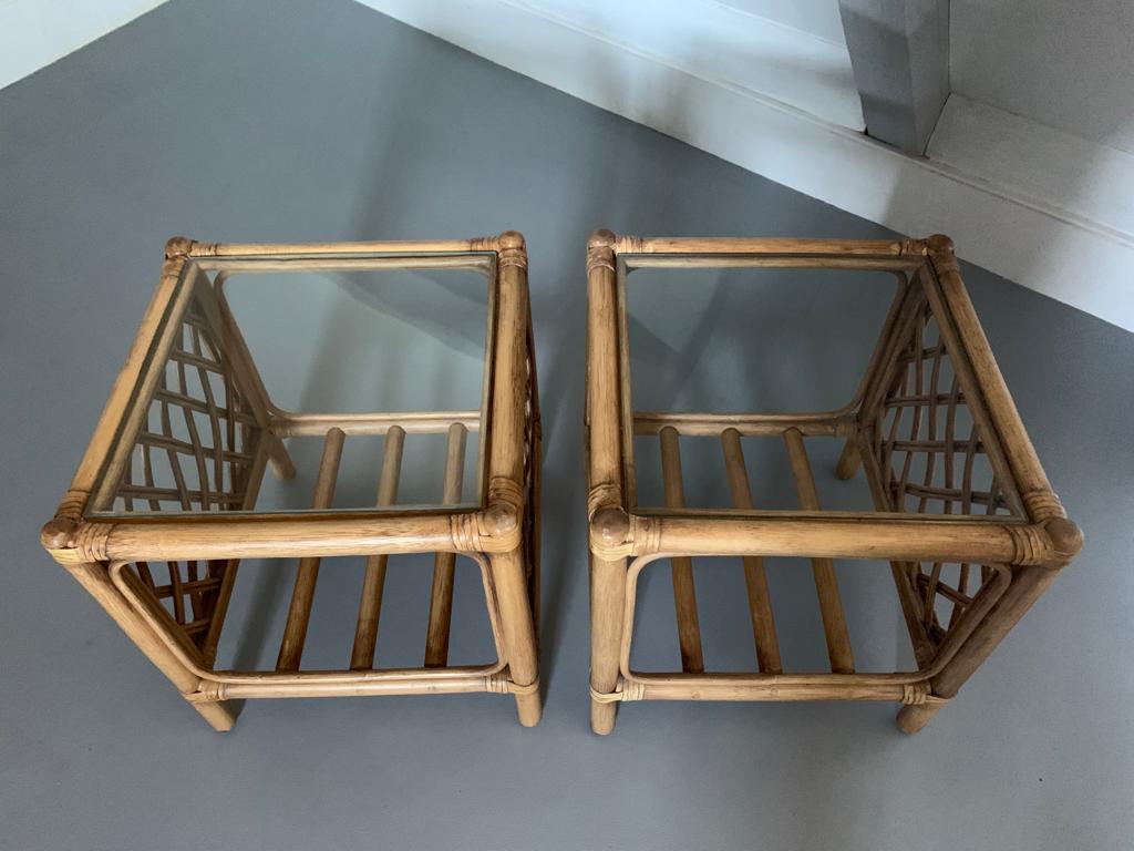 A gorgeous pair of vintage cane bamboo side tables with glass tops which are a great size and style for either side tables or bedside tables. They have a lovely retro boho feel to them and feature two open sides, two lattice sides, a shelf on the bottom and glass on top. The cane bamboo is in excellent vintage condition with no damage and we have put in new glass on both tables. Price £115 (for pair)