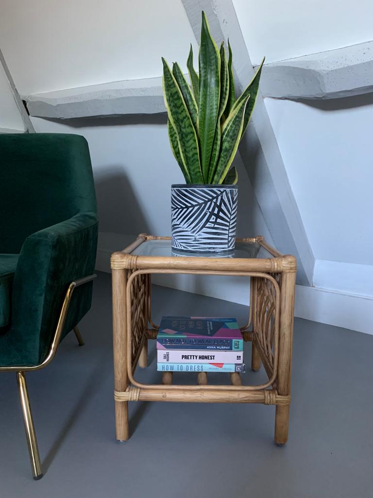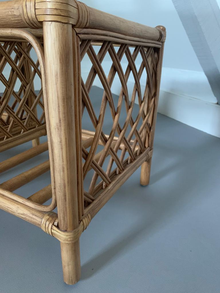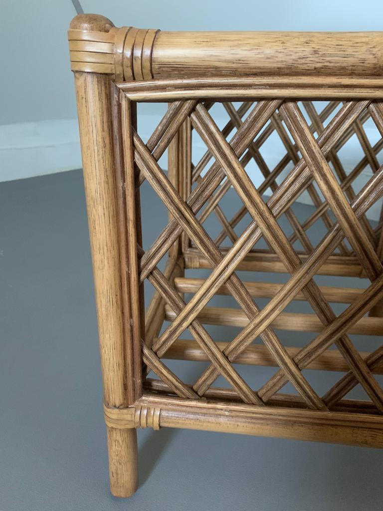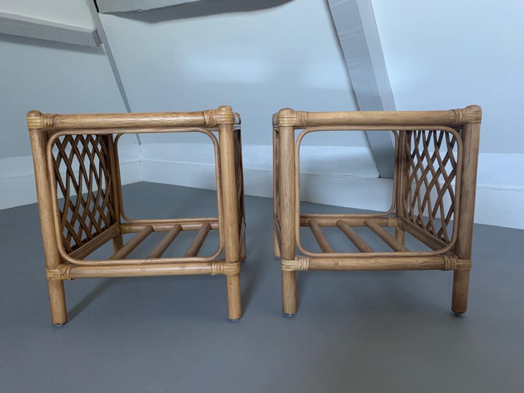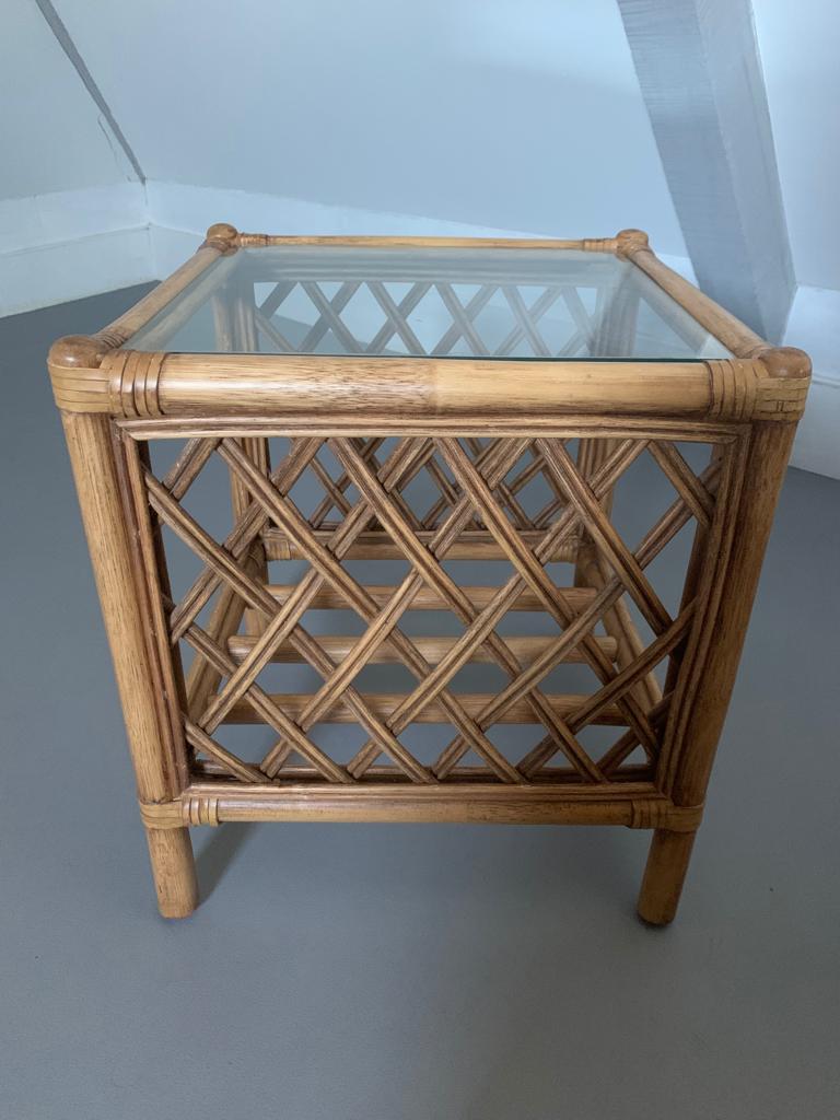 A gorgeous pair of vintage cane bamboo side tables with glass tops which are a great size and style for either side tables or bedside tables. They have a lovely retro boho feel to them and feature two open sides, two lattice sides, a shelf on the bottom and glass on top. The cane bamboo is in excellent vintage condition with no damage and we have put in new glass on both tables. Price £115 (for pair)