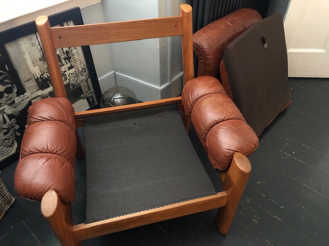 Condition – structurally sound and condition consistent with age and use. Seat cushion has a hole in the rear section which is tucked away out of sight when in place. One minor split in leather seat cushion (see pictures) – item is priced accordingly.