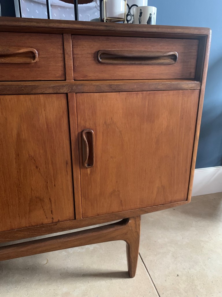This beautifully designed and crafted teak sideboard dating back to the 1960s, was designed by Viktor Wilkins for British manufacturers G Plan. We have lovingly restored this piece to excellent condition and finished with several coats of varnish for a sleek, rich and protected finish. It features a large central cupboard, two small cupboards, a large central sectioned drawer and two small drawers. The swooping legs are a beautiful design feature. This is a stunning piece for a modern hallway, living room, study. kitchen or bedroom.