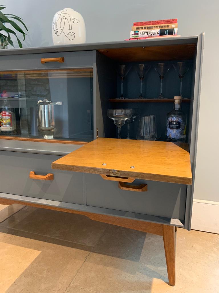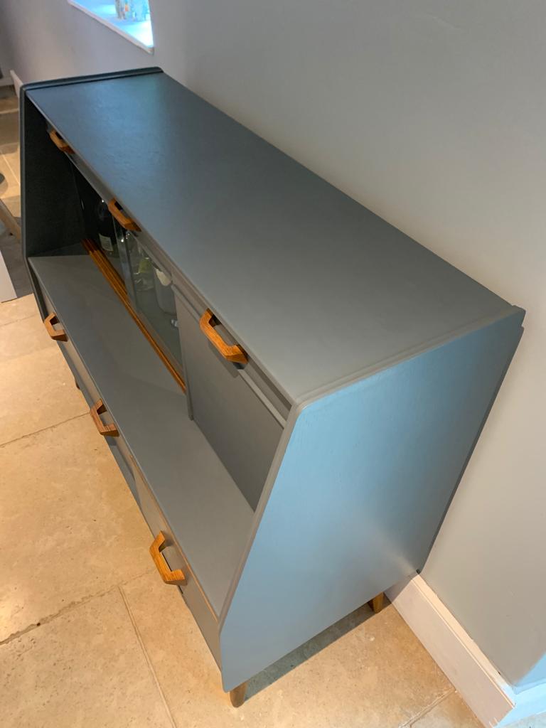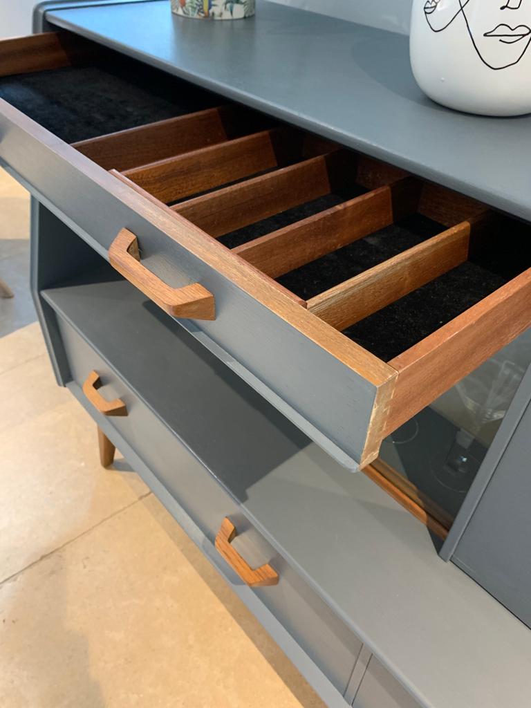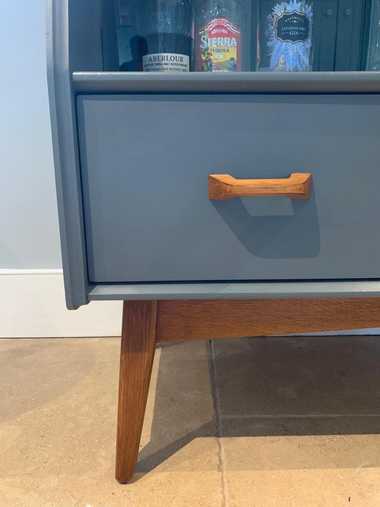 This handsome refurbished mid century side board display cocktail cabinet manufactured by British furniture makers G Plan for the Brandon collection, is such a great piece for today’s home. We have transformed what was quite a tired once loved sideboard when we found it, into an immaculate and unique drinks cabinet and/or sideboard/TV unit/storage, ideal for so many purposes and in any room of the home. The unit features a large top drawer with two compartments and a cutlery tray/divider, a smaller top drawer, a pull down cocktail cabinet with shelf, a double glass door display cabinet and two large lower drawers. We have lovingly refurbished the unit, painting the majority of the teak wood, in a contemporary dark grey paint with a hint of blue, and leaving the legs, handles, interior shelf and door and the glass sliding track in the original wood finish and added a layer of varnish. This gives a contrasting and eye catching finish. SOLD