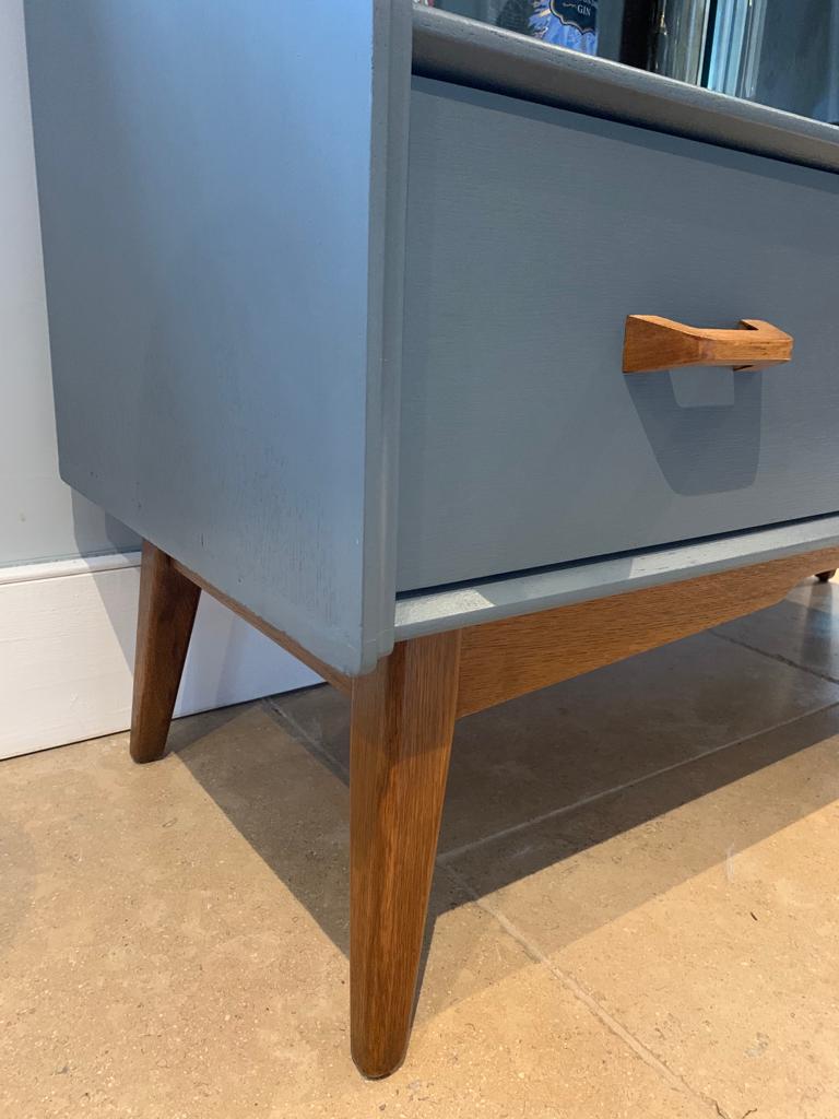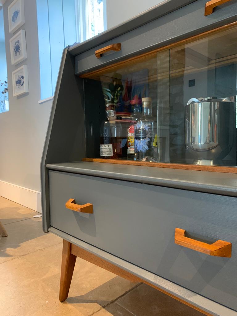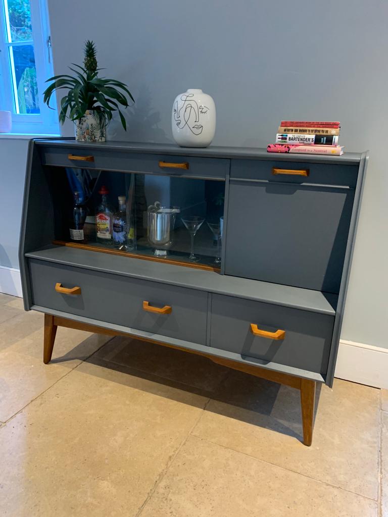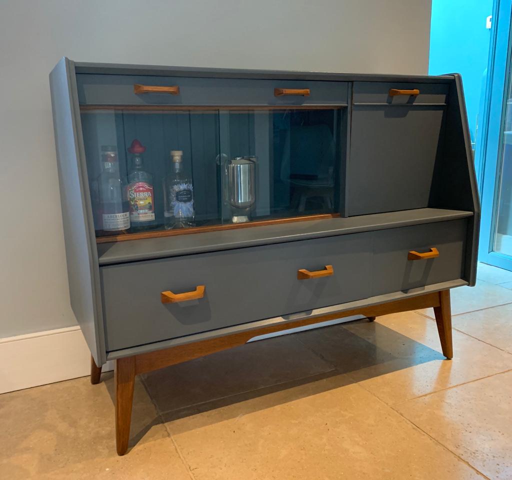 This handsome refurbished mid century side board display cocktail cabinet manufactured by British furniture makers G Plan for the Brandon collection, is such a great piece for today’s home. We have transformed what was quite a tired once loved sideboard when we found it, into an immaculate and unique drinks cabinet and/or sideboard/TV unit/storage, ideal for so many purposes and in any room of the home. The unit features a large top drawer with two compartments and a cutlery tray/divider, a smaller top drawer, a pull down cocktail cabinet with shelf, a double glass door display cabinet and two large lower drawers. We have lovingly refurbished the unit, painting the majority of the teak wood, in a contemporary dark grey paint with a hint of blue, and leaving the legs, handles, interior shelf and door and the glass sliding track in the original wood finish and added a layer of varnish. This gives a contrasting and eye catching finish. SOLD