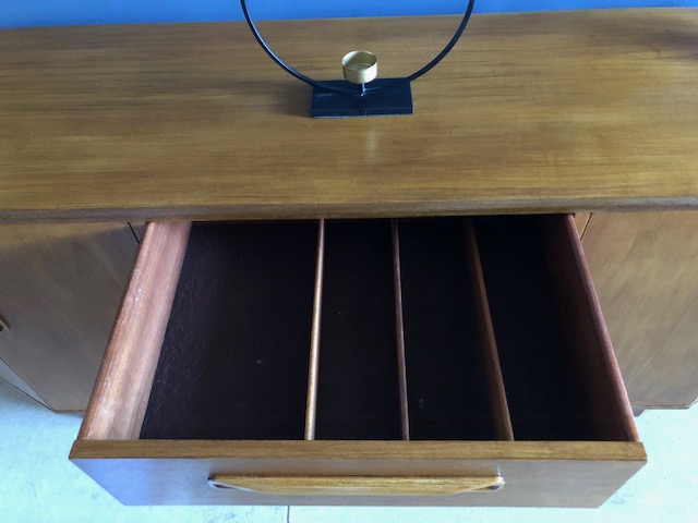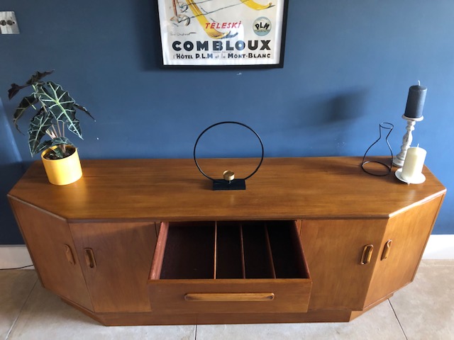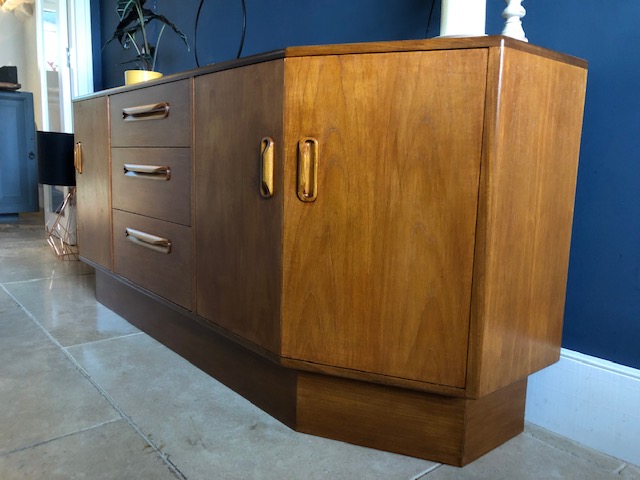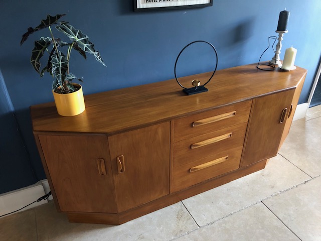 Handsome mid century modern teak sideboard designed by Victor Wilkins for British furniture manufacturers G-Plan. Part of the highly desirable 1960s ‘Fresco’ range, this more rare piece features 2 unique angled side cupboards and 3 middle drawers. Fully restored to immaculate condition. With makers mark.