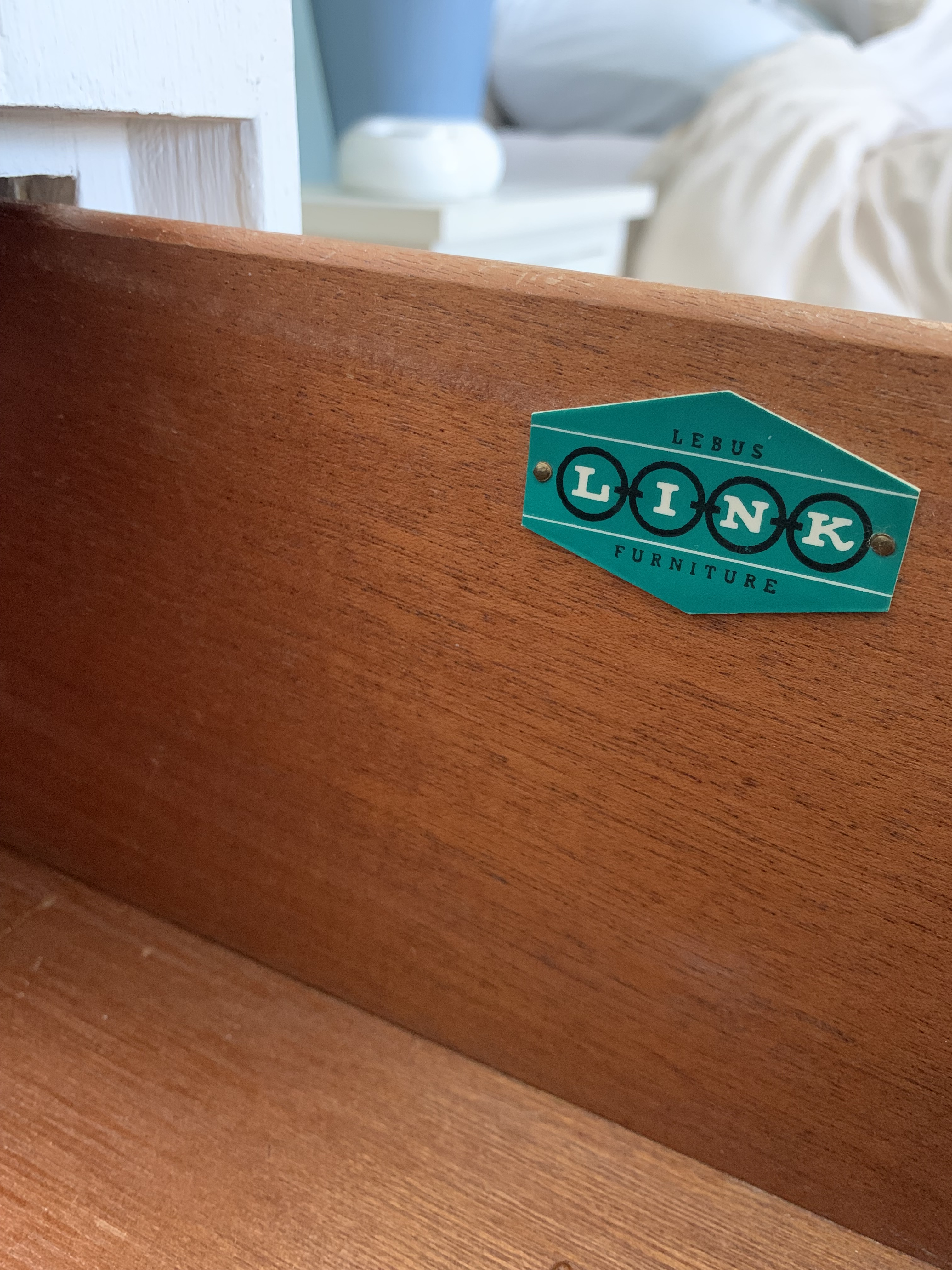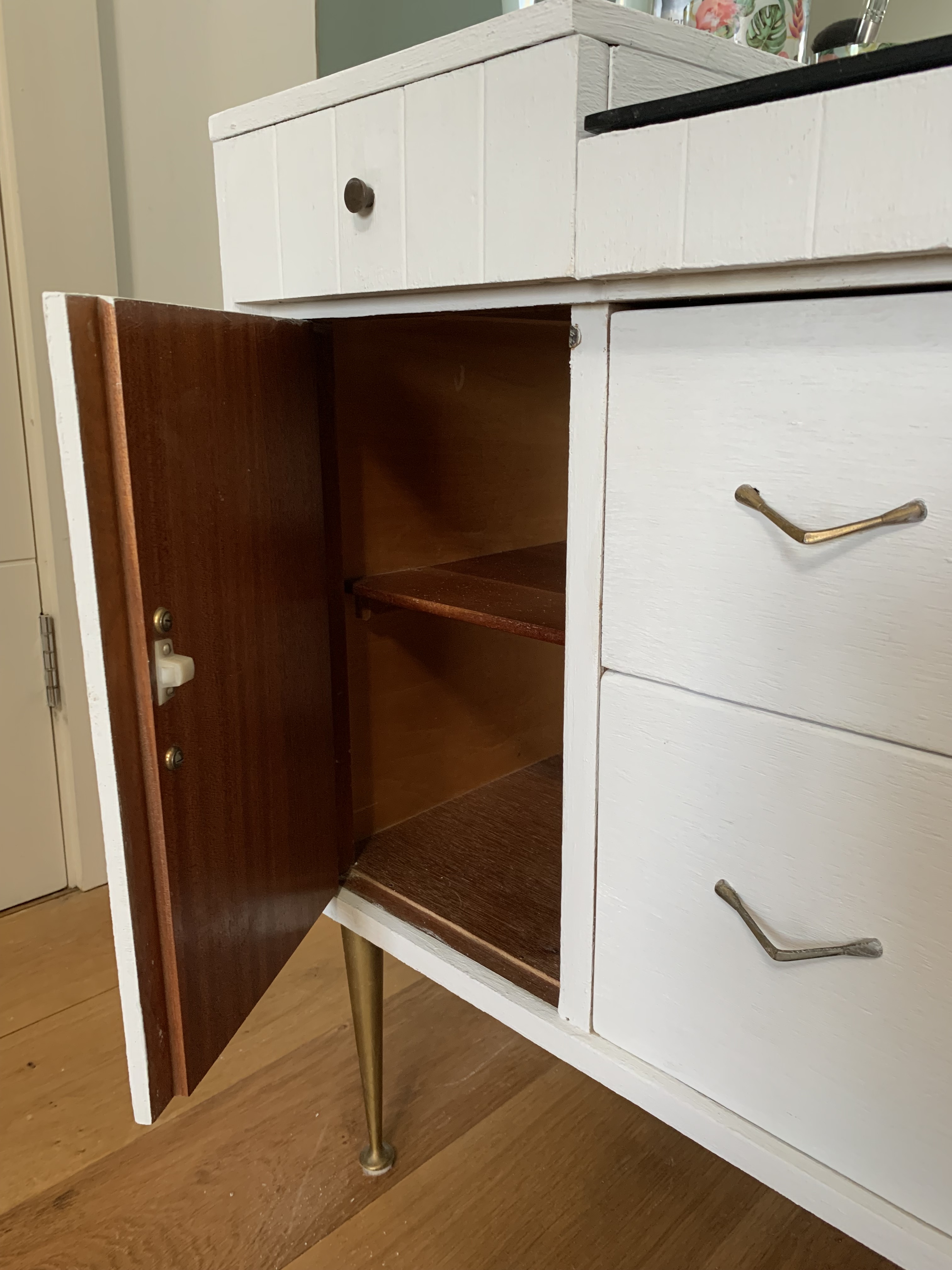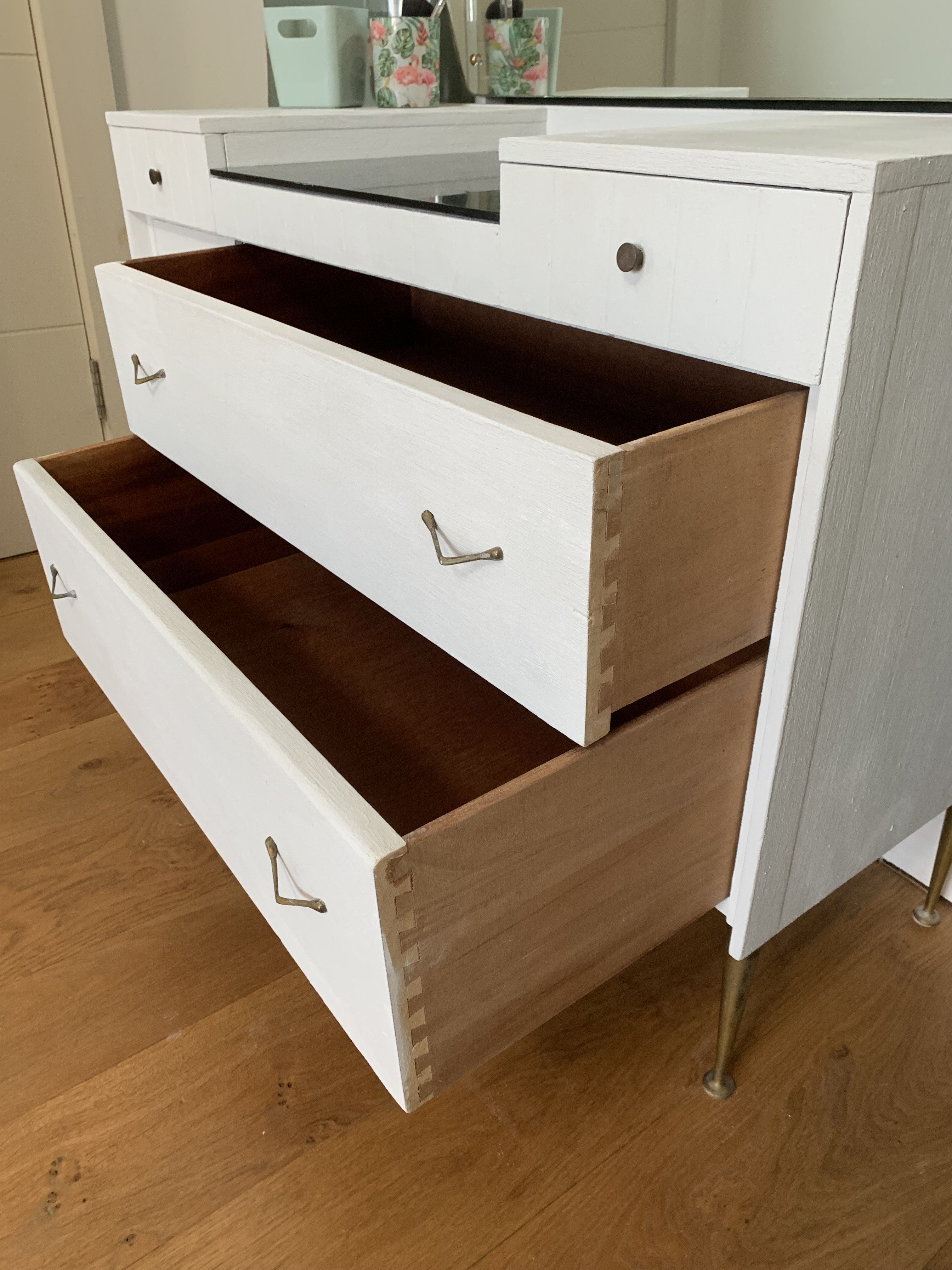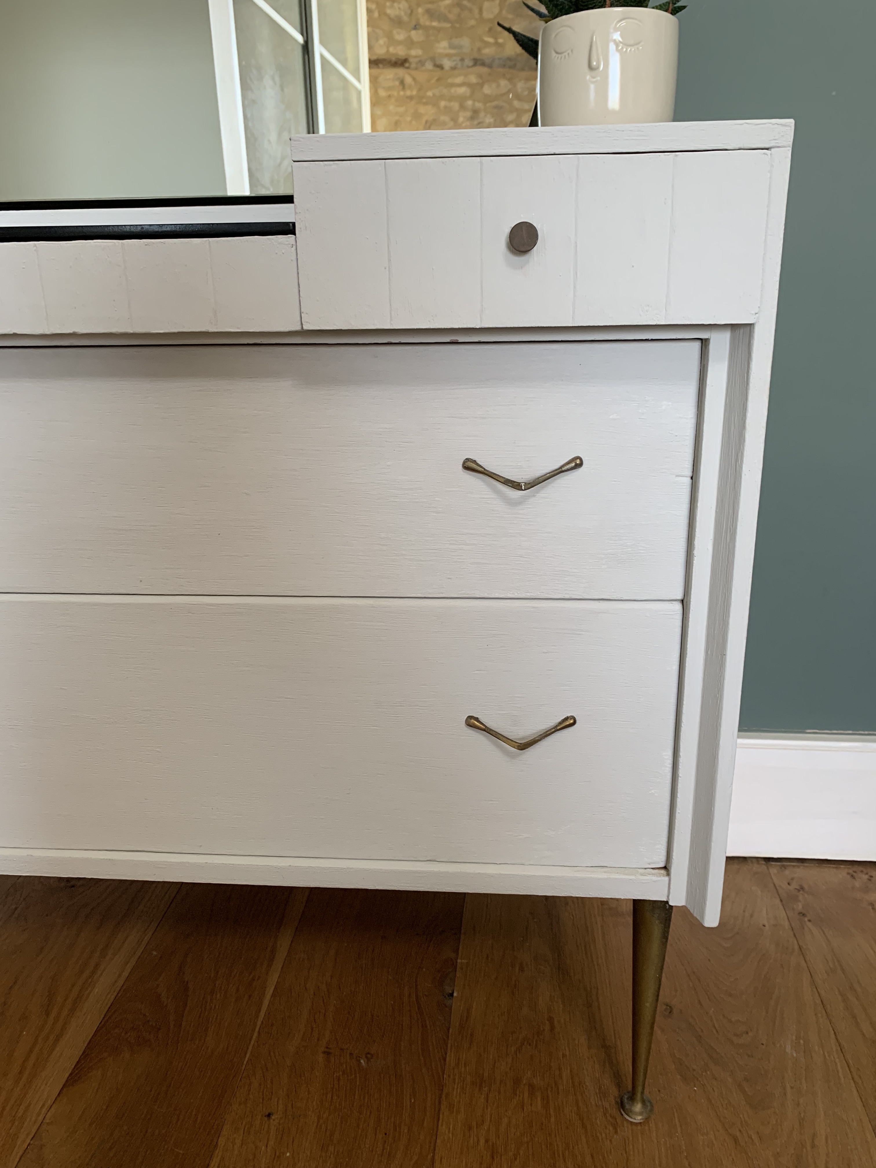 A gorgeous refurbished dressing table and mirror by London furniture Lebus for their 1960s Link collection. Originally a pale wood, we decided to update the unit and have given it a fresh modern look with a soft grey finish, but keeping the original brass hairpin legs and handles. It features a large detachable mirror, part black glass top, 2 large drawers, 2 small drawers and 1 cupboard with shelf. It is in beautiful condition, with makers mark.
