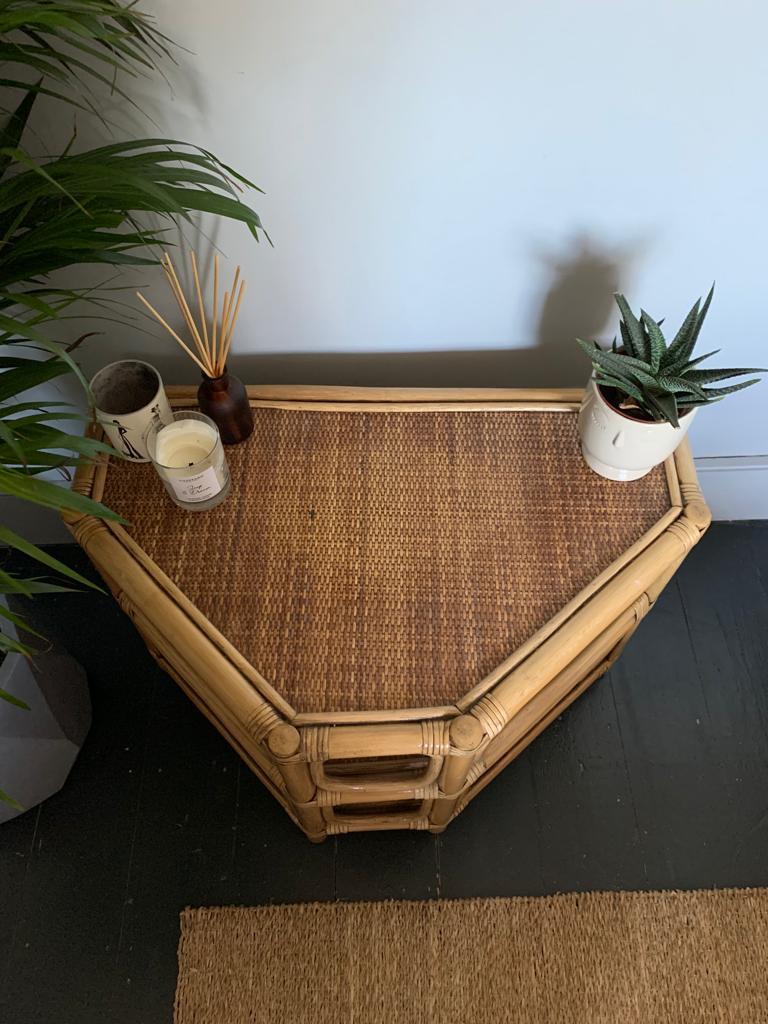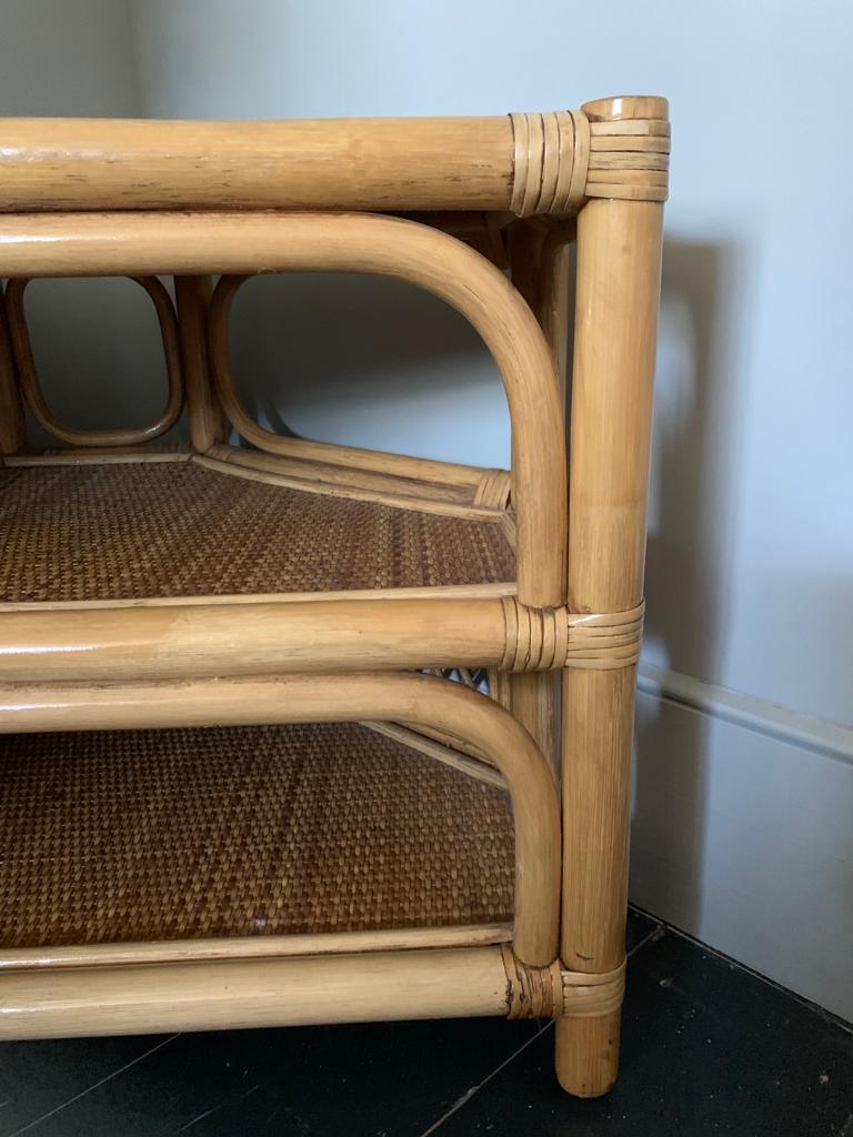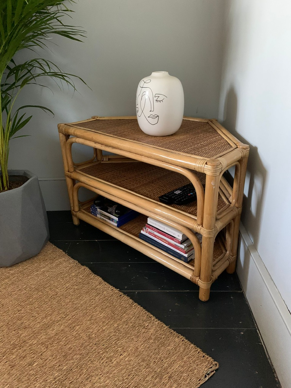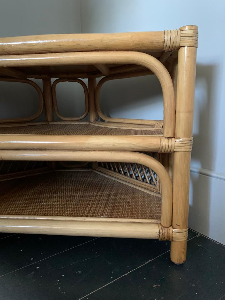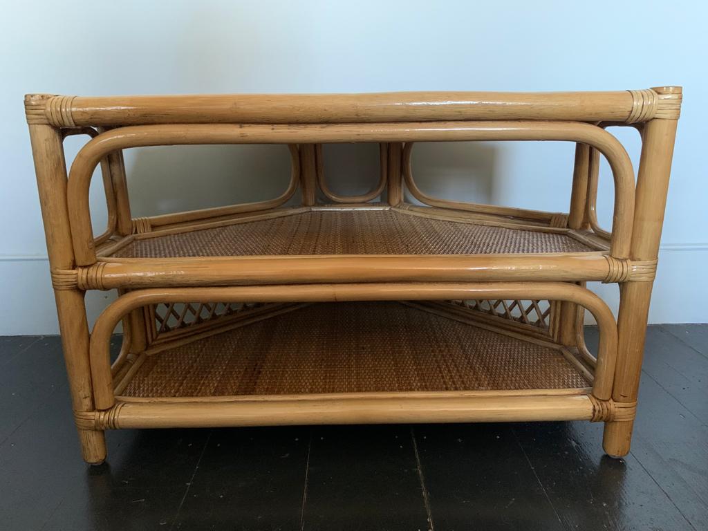 A superb condition cane bamboo corner unit with a lovely retro feel (circa 1970s) which likely began life as a TV unit with two storage shelves, but also looks great as a low rise corner display unit and shelving or in reverse, as a low rise wall unit, showing off the beautiful bamboo design and triangular structure. All the bamboo is in excellent condition with no damage. There is a very slight discolouration to a central part of the woven cane top but this is barely visible. We also have matching side tables available (see other listings). SOLD