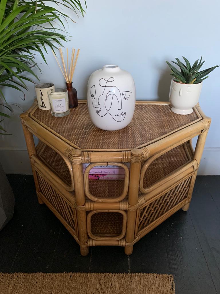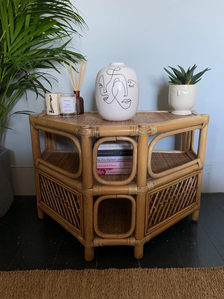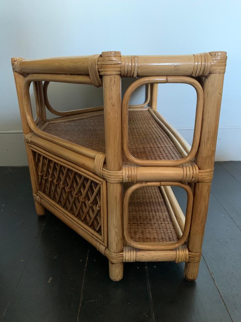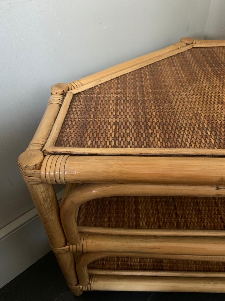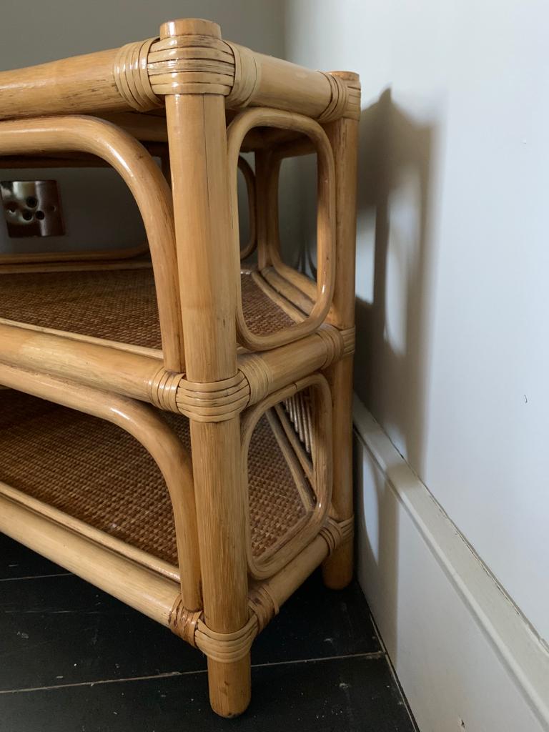 A superb condition cane bamboo corner unit with a lovely retro feel (circa 1970s) which likely began life as a TV unit with two storage shelves, but also looks great as a low rise corner display unit and shelving or in reverse, as a low rise wall unit, showing off the beautiful bamboo design and triangular structure. All the bamboo is in excellent condition with no damage. There is a very slight discolouration to a central part of the woven cane top but this is barely visible. We also have matching side tables available (see other listings). SOLD