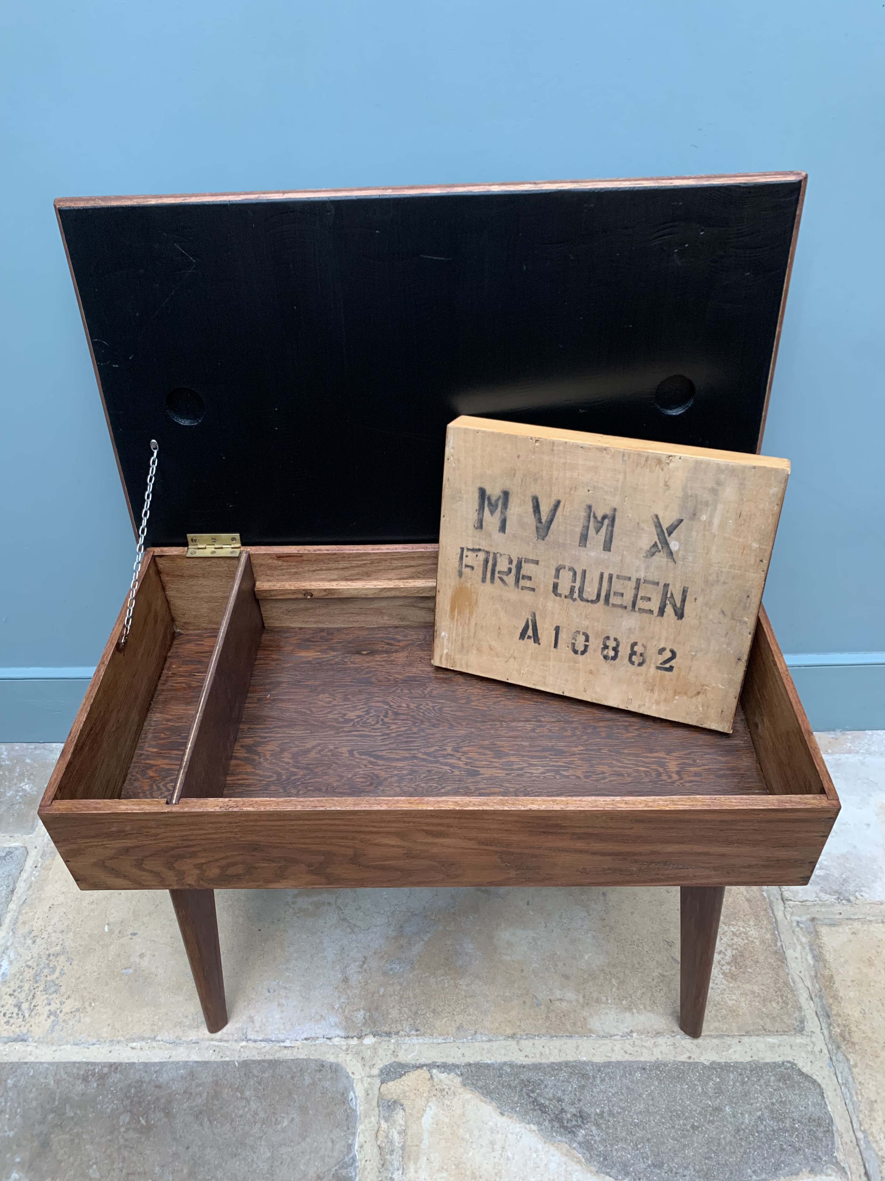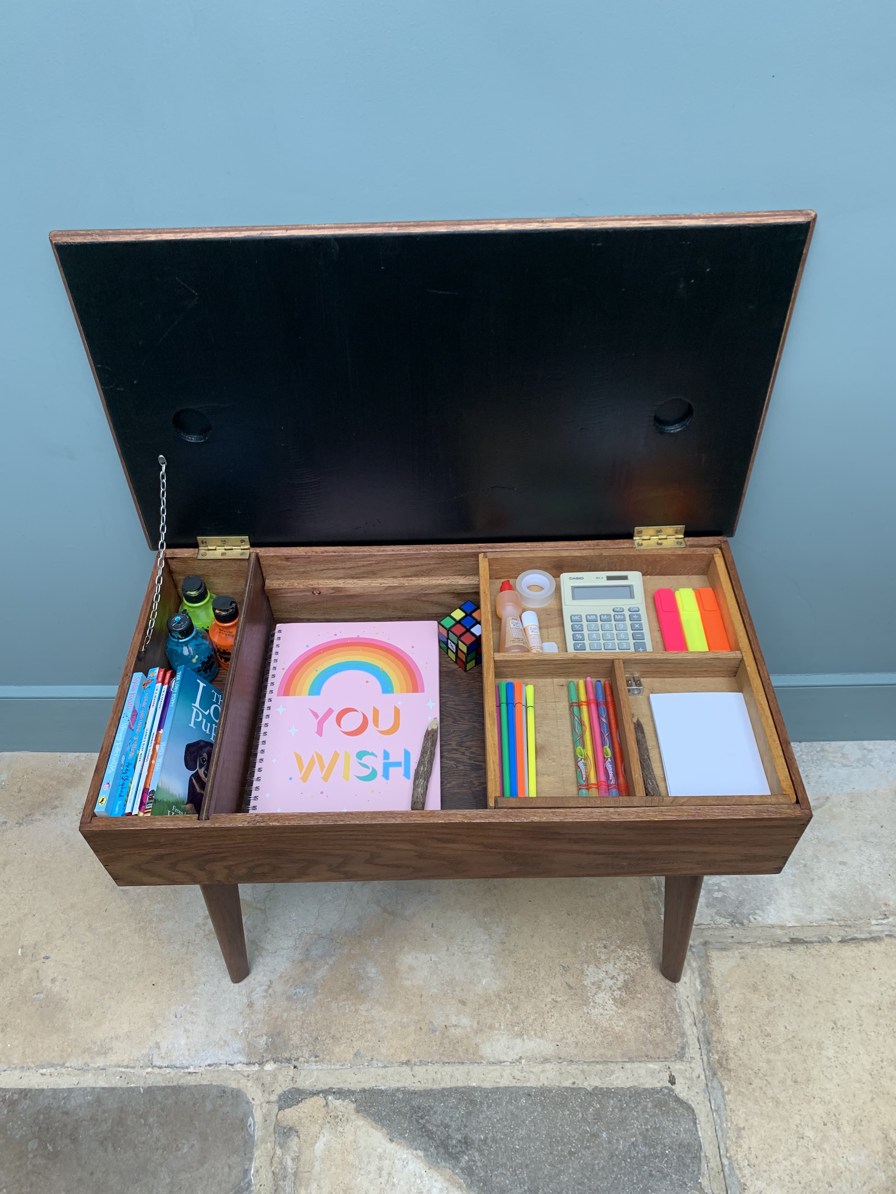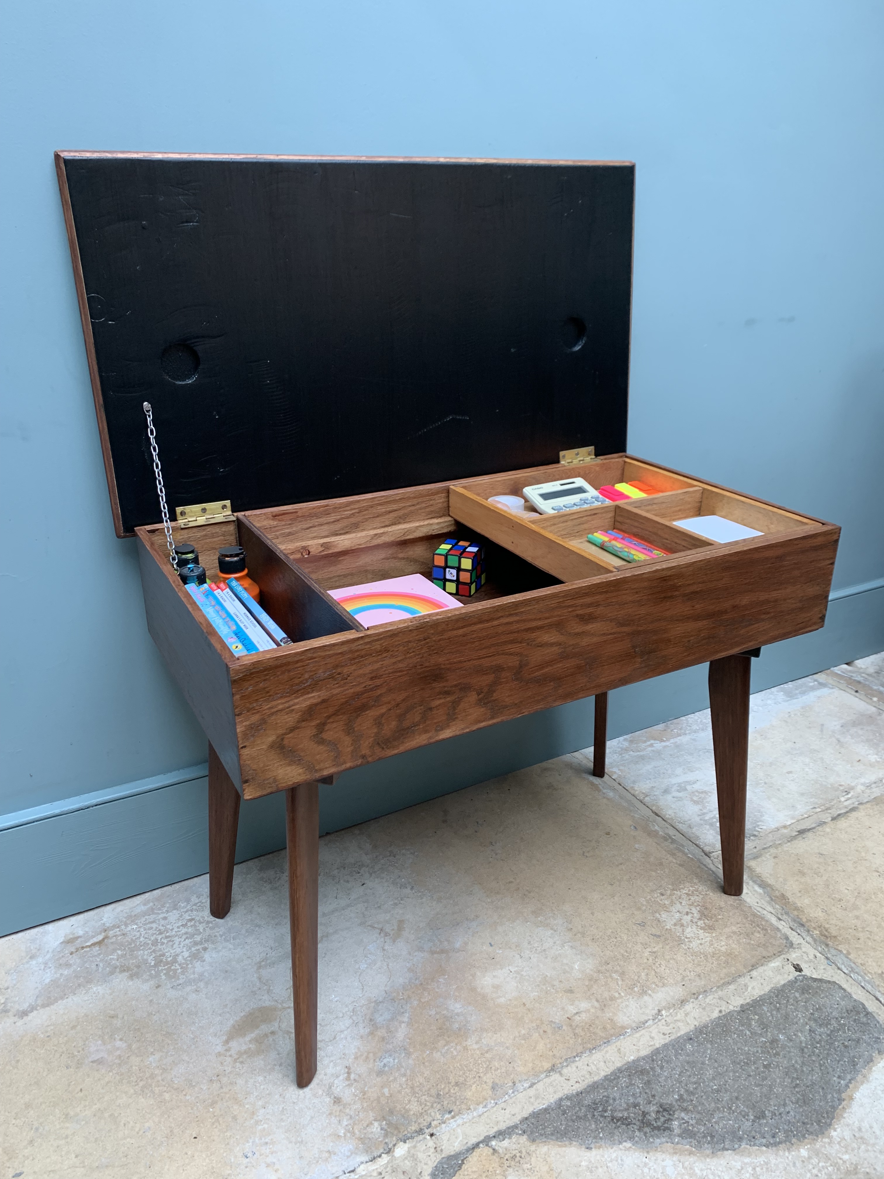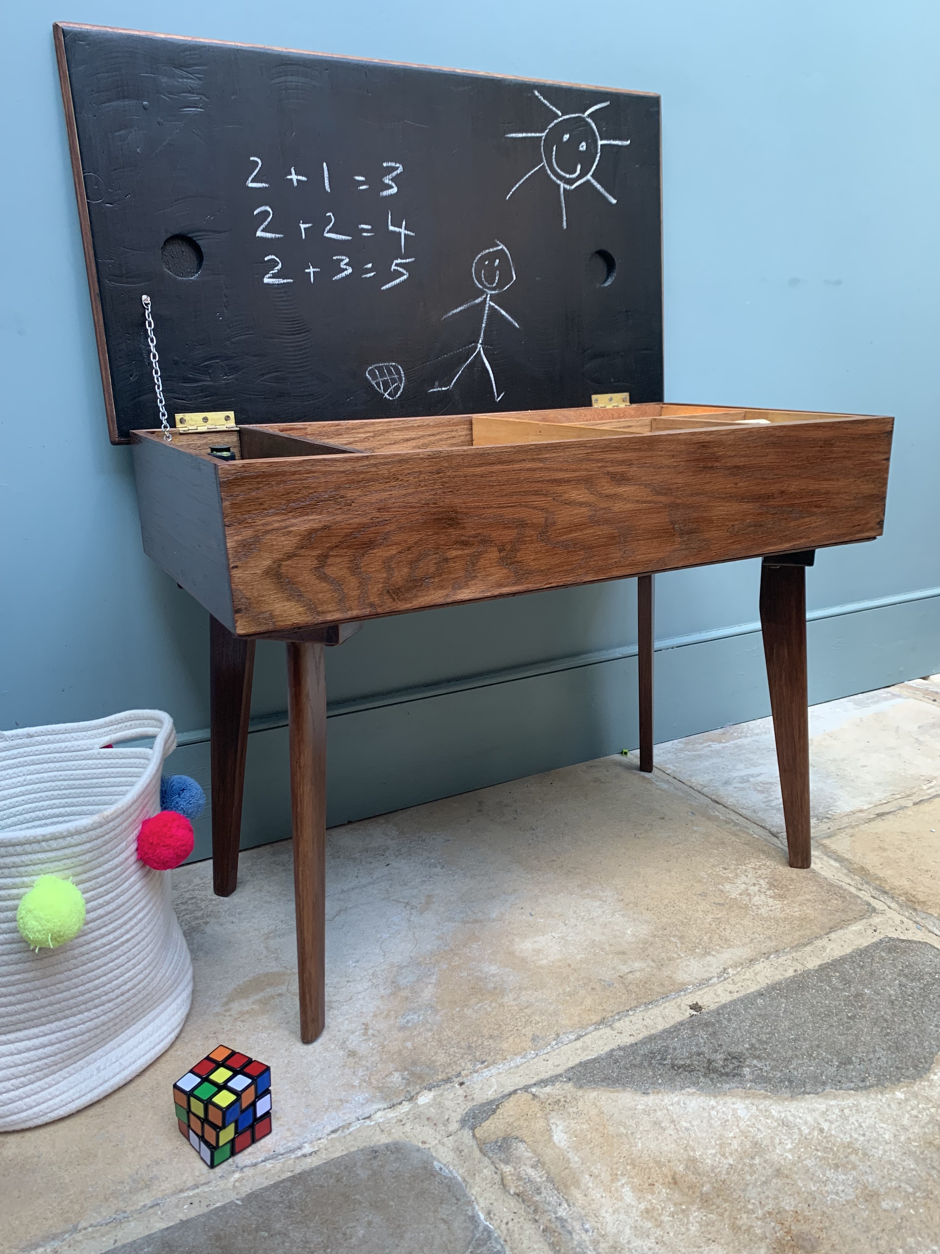 This stunning piece of mid century craftmanship perfectly combines the best of mid century design with the practicalities of today’s modern living. We are so proud to have restored and reinvented this old sewing table which we believe was made using wood from the 1864 HMS xxxx into a truly versatile piece of furniture for the modern home. It could be used as an occasional table, a chic and practical storage solution and/or a very cool play solution for your child. As a stand alone side table it is full of mid century charm, featuring a thick solid wood frame and legs and an original and immaculate condition grey and white formica top. Inside, we have added blackboard paint to the inside lid making it even more versatile and ideal for wipe away little doodles. There is a large storage area inside and an additional and removable wooden tray for sectioned storage. Great for Lego, crafts, pens and pencils, toys and books. SOLD