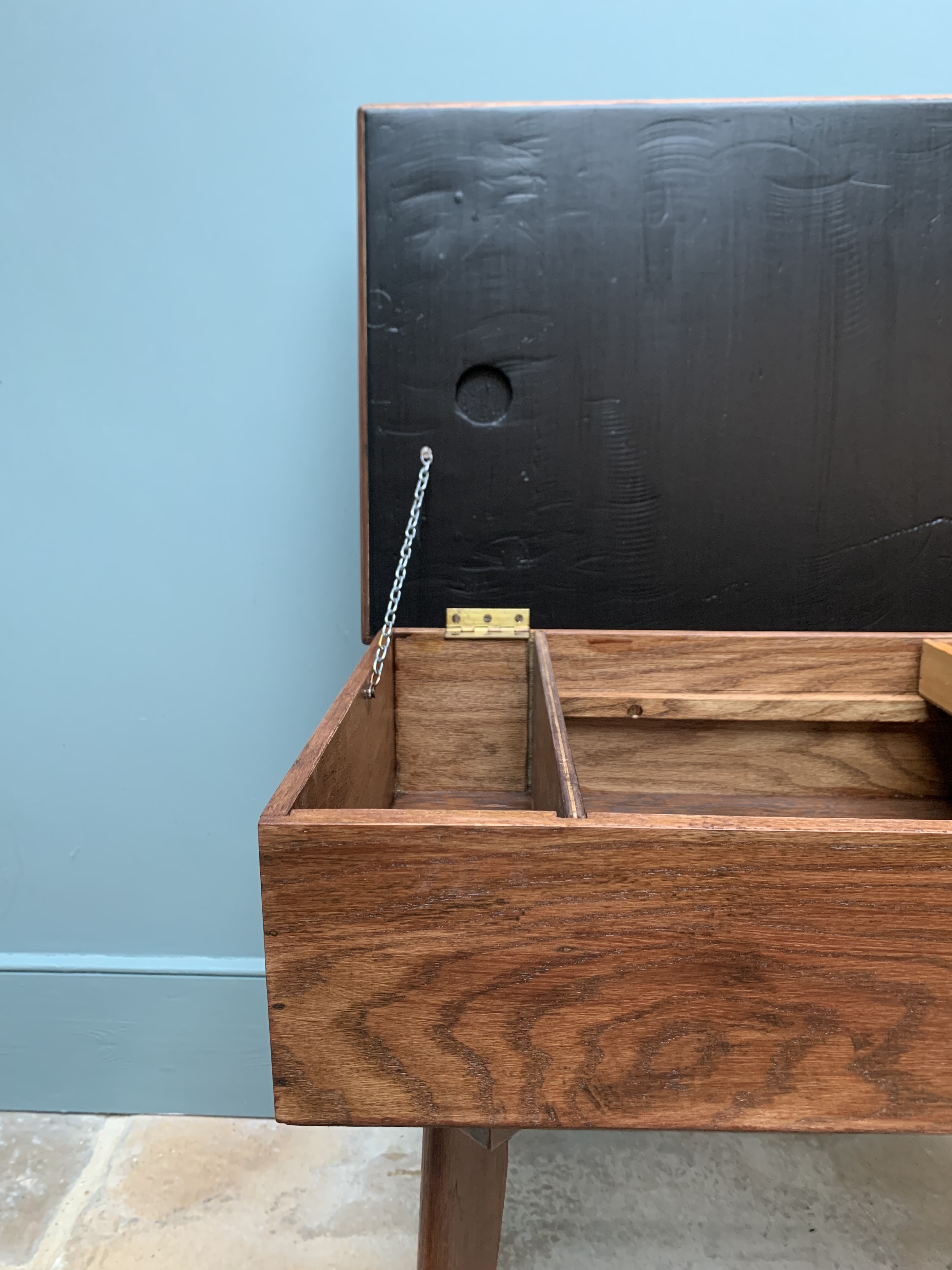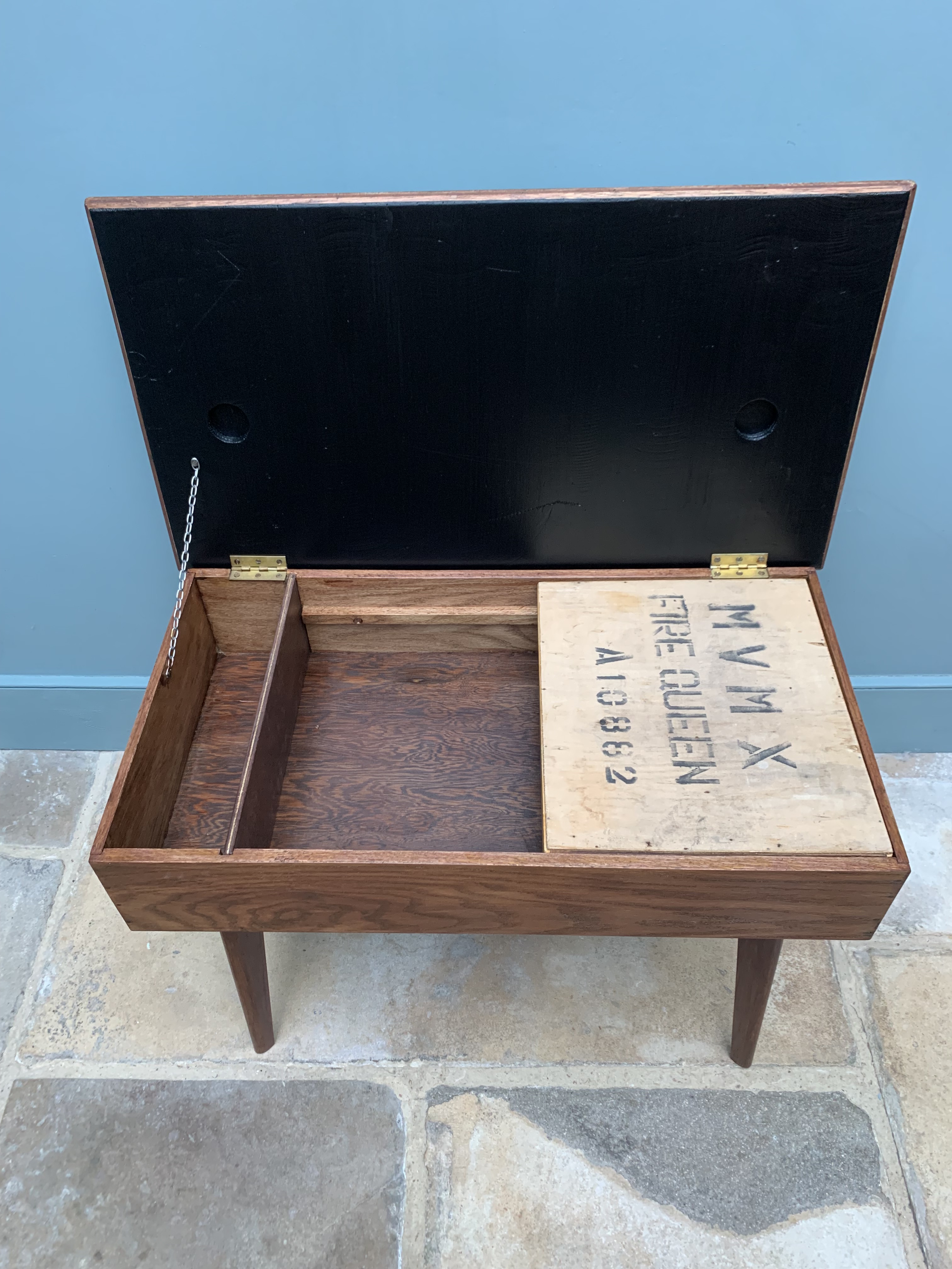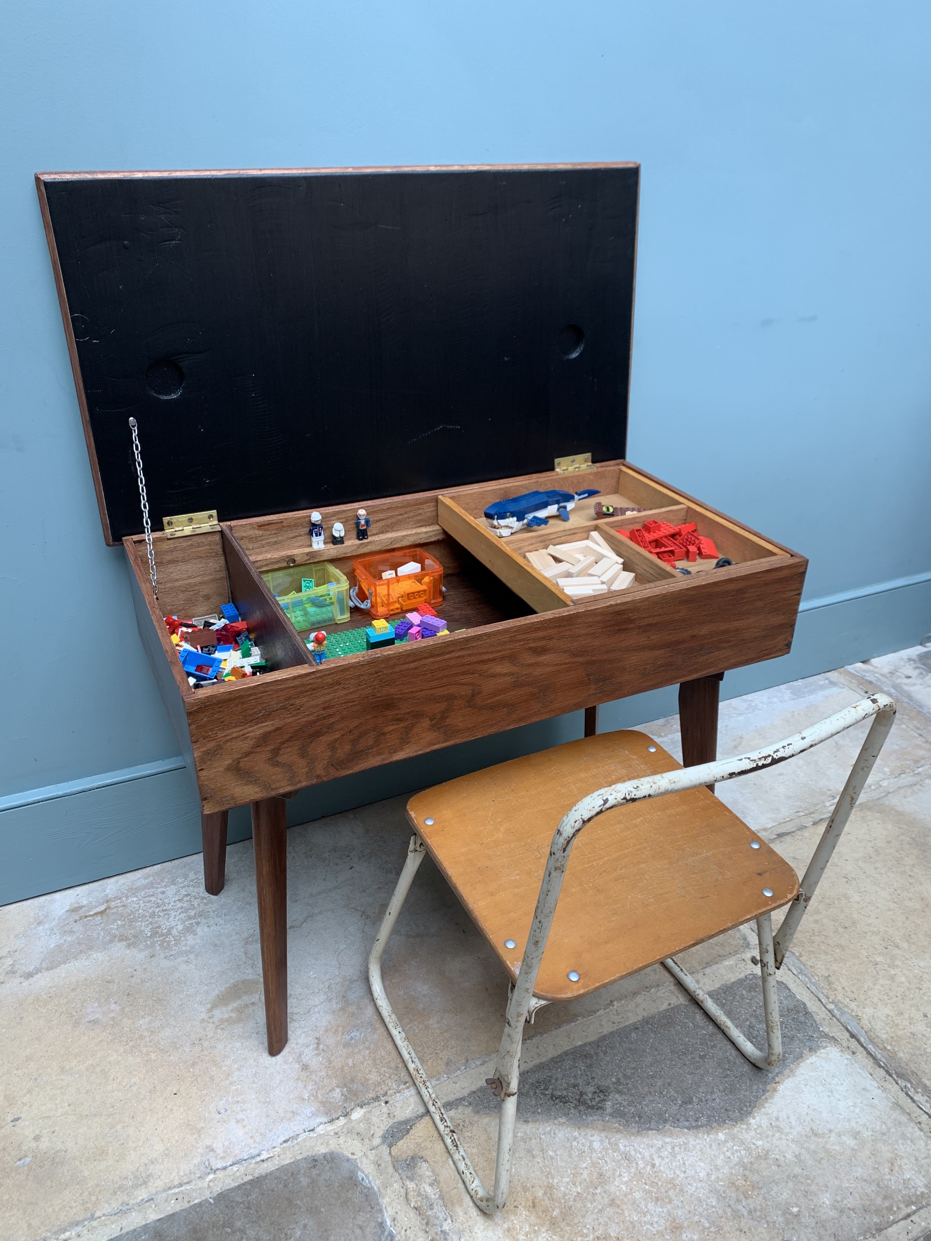 This stunning piece of mid century craftmanship perfectly combines the best of mid century design with the practicalities of today’s modern living. We are so proud to have restored and reinvented this old sewing table which we believe was made using wood from the 1864 HMS xxxx into a truly versatile piece of furniture for the modern home. It could be used as an occasional table, a chic and practical storage solution and/or a very cool play solution for your child. As a stand alone side table it is full of mid century charm, featuring a thick solid wood frame and legs and an original and immaculate condition grey and white formica top. Inside, we have added blackboard paint to the inside lid making it even more versatile and ideal for wipe away little doodles. There is a large storage area inside and an additional and removable wooden tray for sectioned storage. Great for Lego, crafts, pens and pencils, toys and books. SOLD