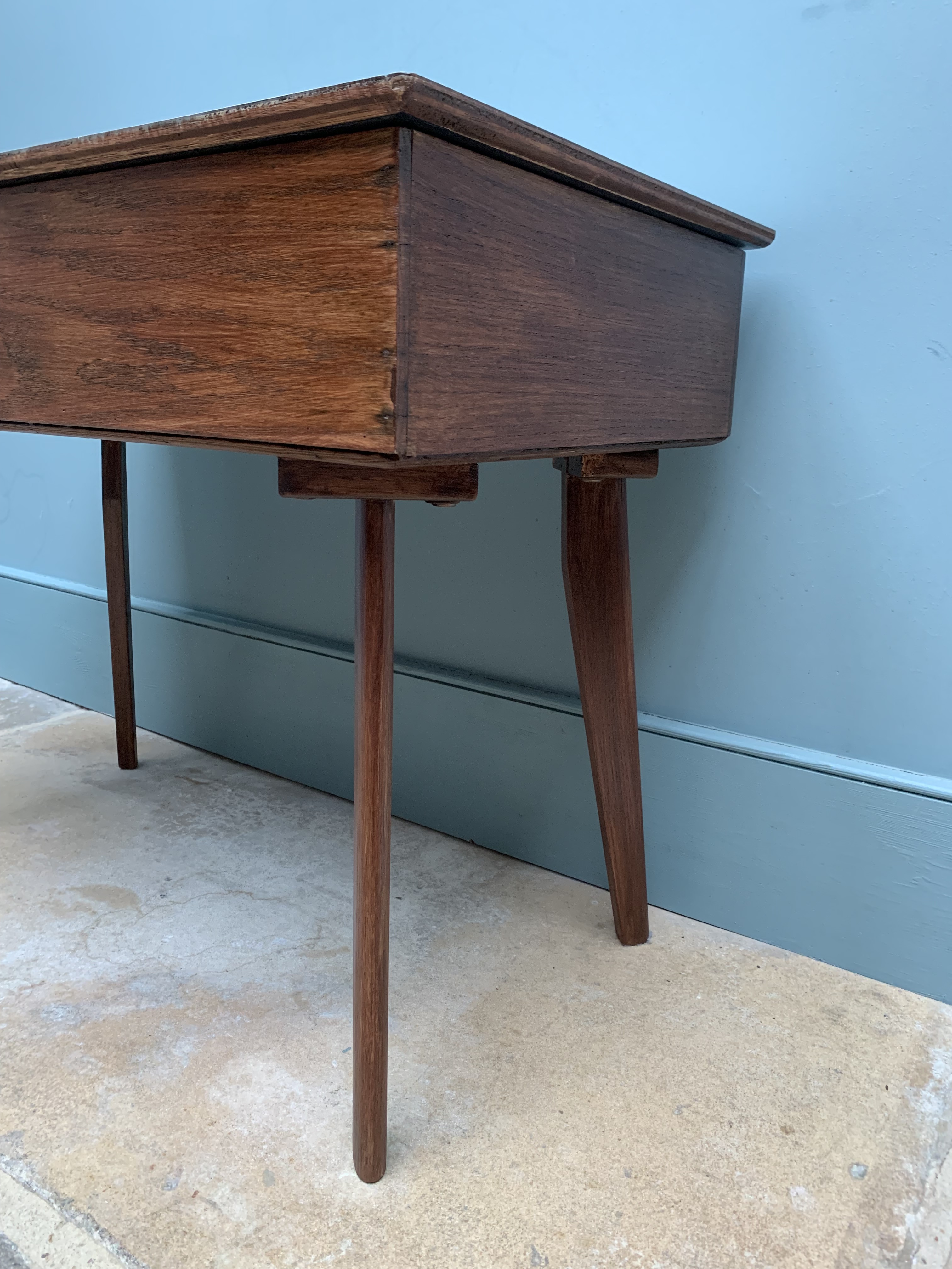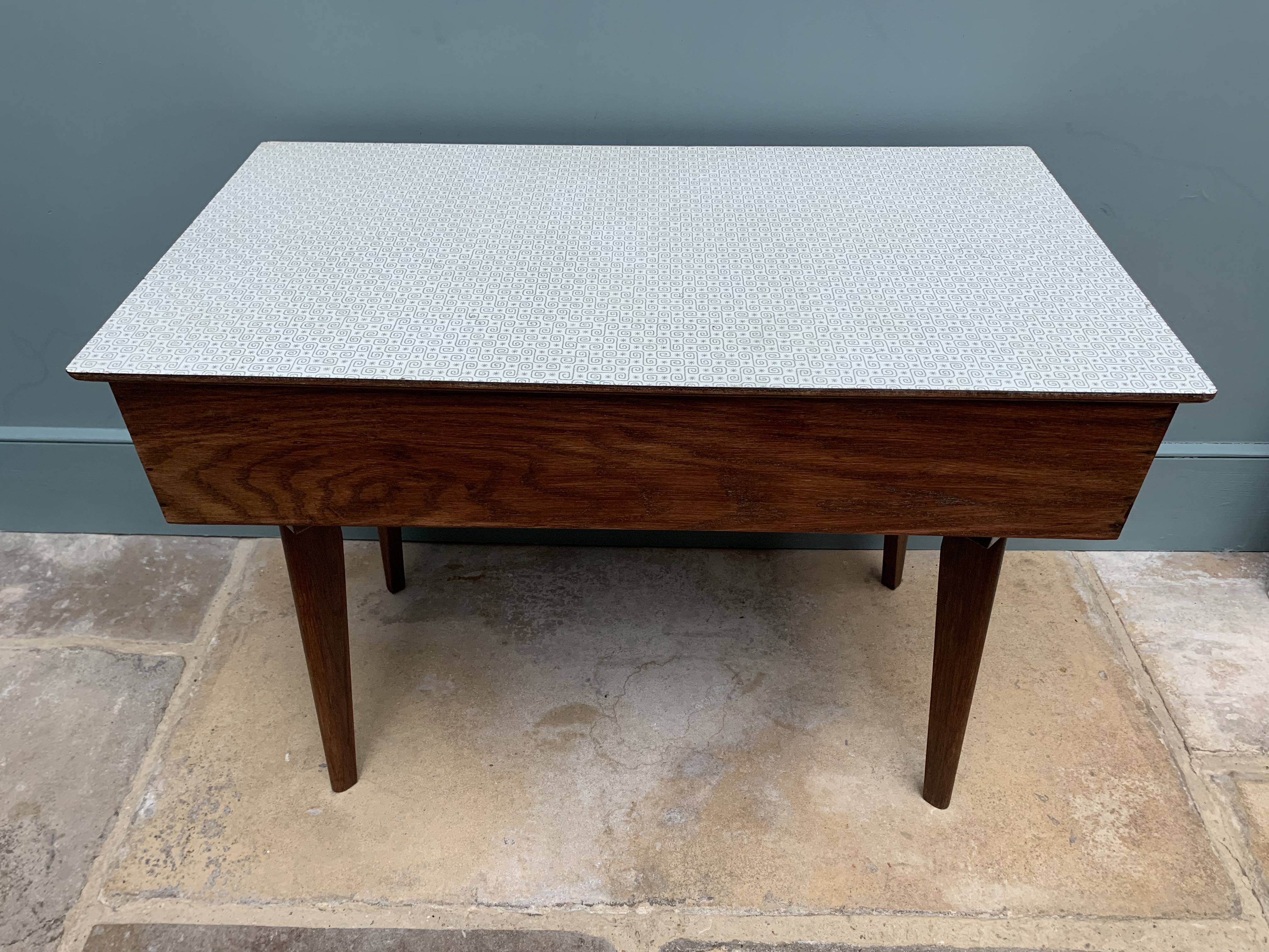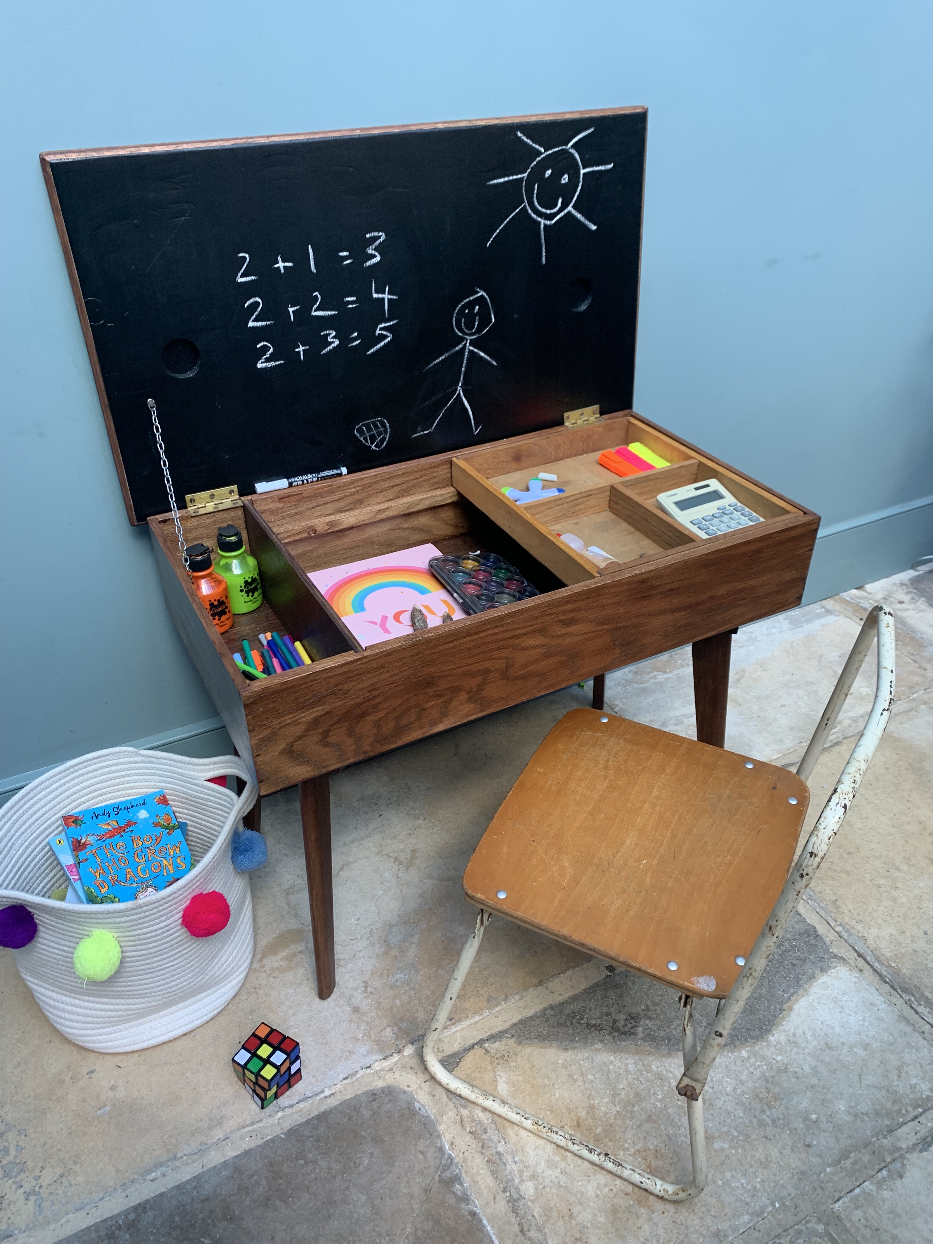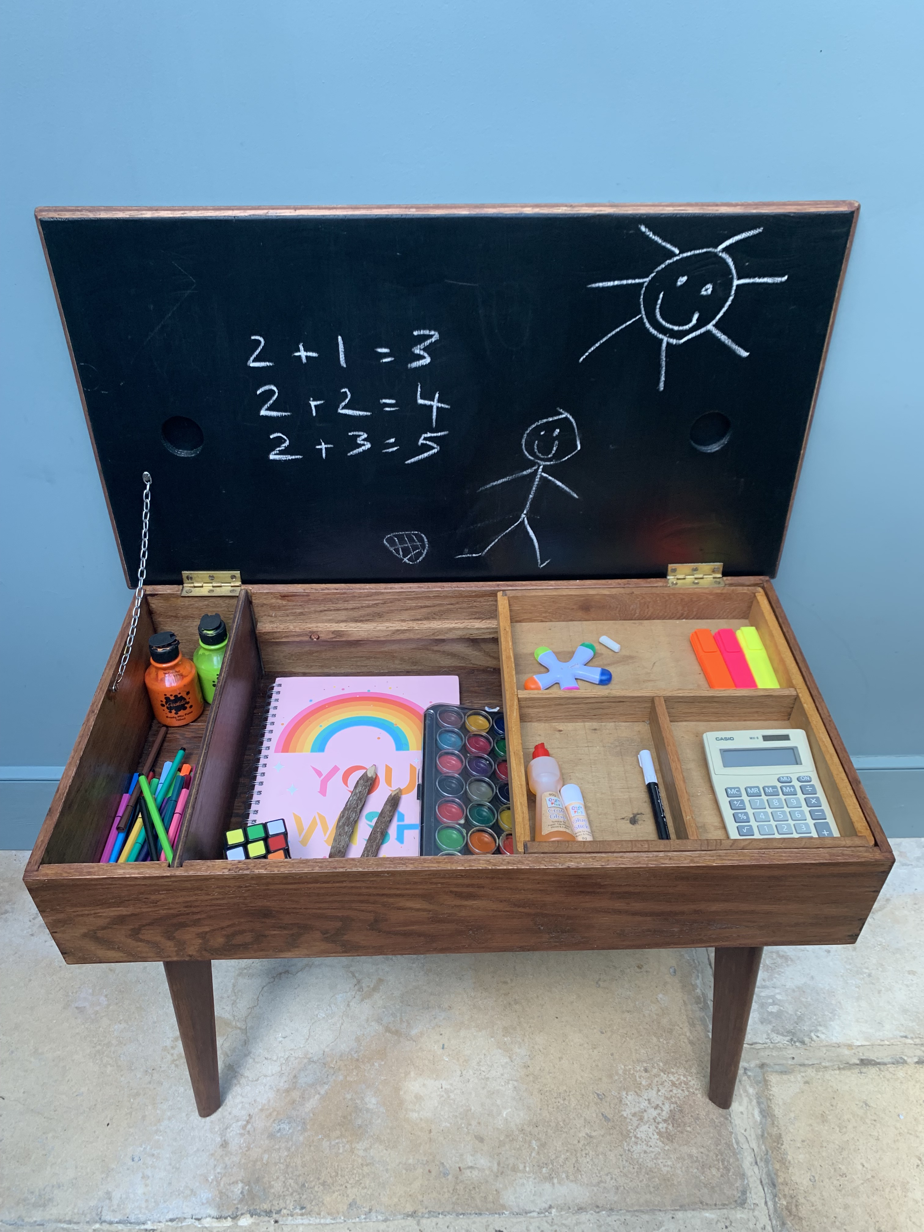 This stunning piece of mid century craftmanship perfectly combines the best of mid century design with the practicalities of today’s modern living. We are so proud to have restored and reinvented this old sewing table which we believe was made using wood from the 1864 HMS xxxx into a truly versatile piece of furniture for the modern home. It could be used as an occasional table, a chic and practical storage solution and/or a very cool play solution for your child. As a stand alone side table it is full of mid century charm, featuring a thick solid wood frame and legs and an original and immaculate condition grey and white formica top. Inside, we have added blackboard paint to the inside lid making it even more versatile and ideal for wipe away little doodles. There is a large storage area inside and an additional and removable wooden tray for sectioned storage. Great for Lego, crafts, pens and pencils, toys and books. SOLD