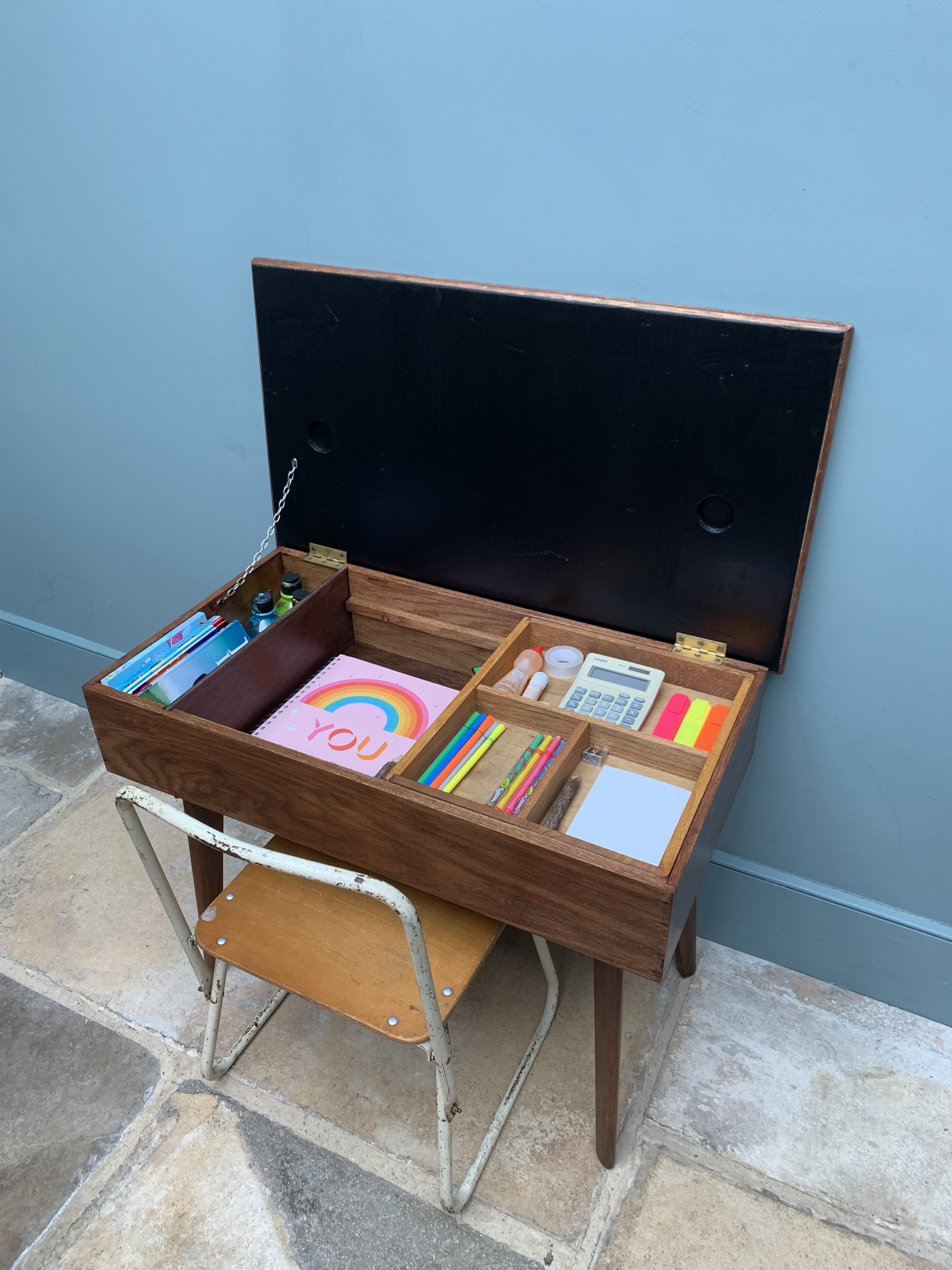 Condition – Immaculate. We have restored and reinvented this unit so it is now in immaculate condition but still with all its original character. All the wood has been sanded and revarnished and the formica is in excellent condition. We have added blackboard paint to the interior lid.