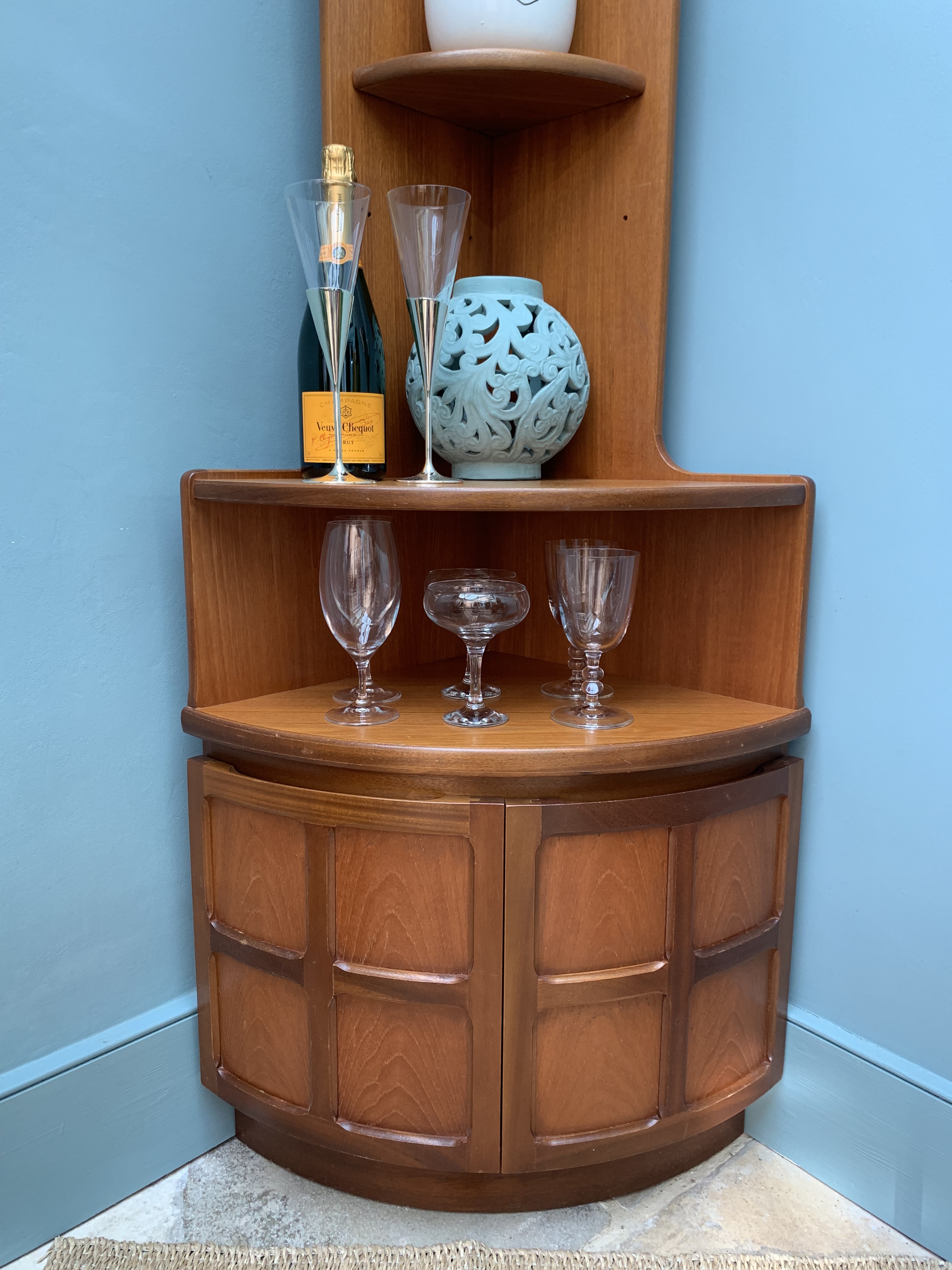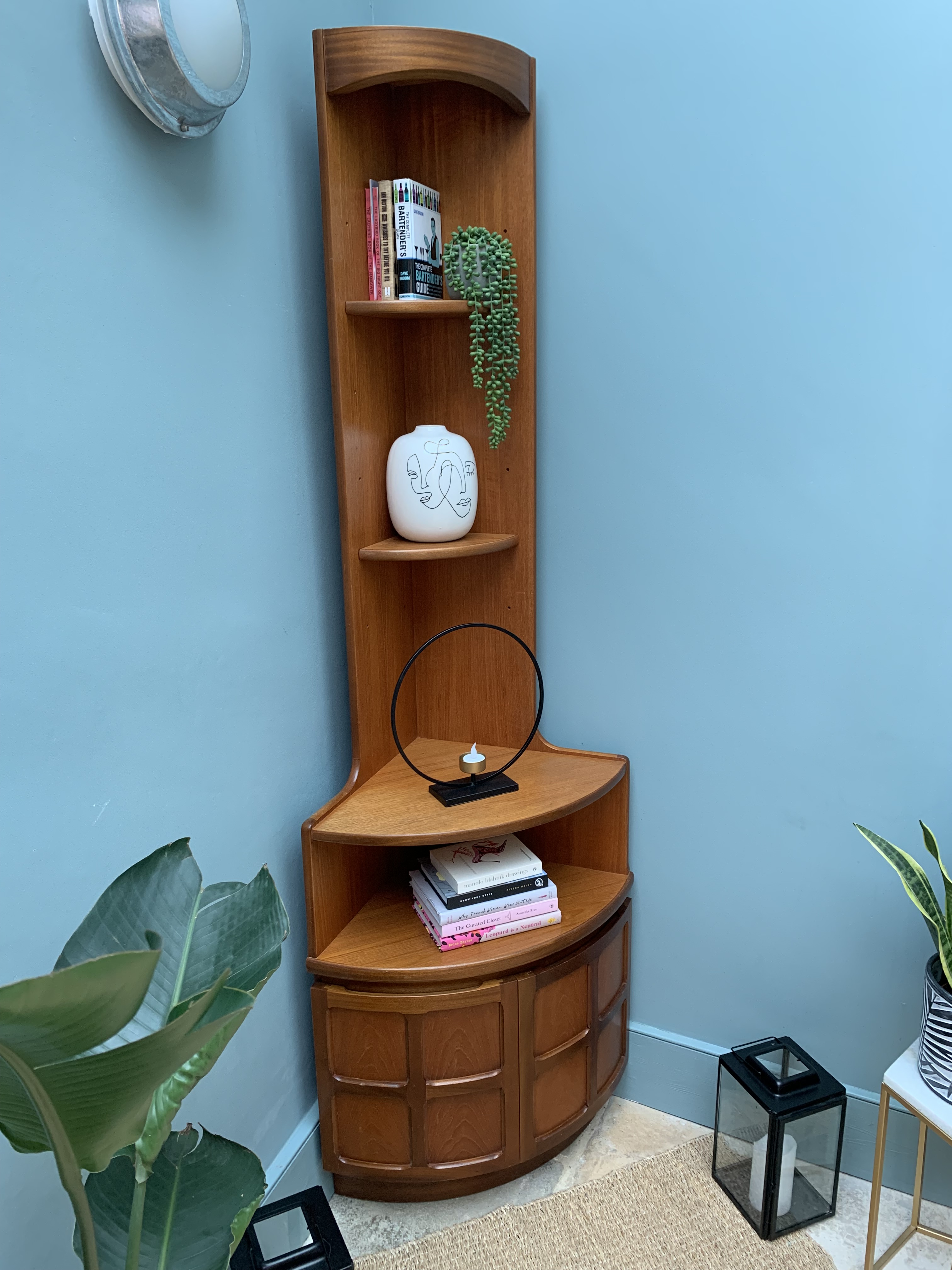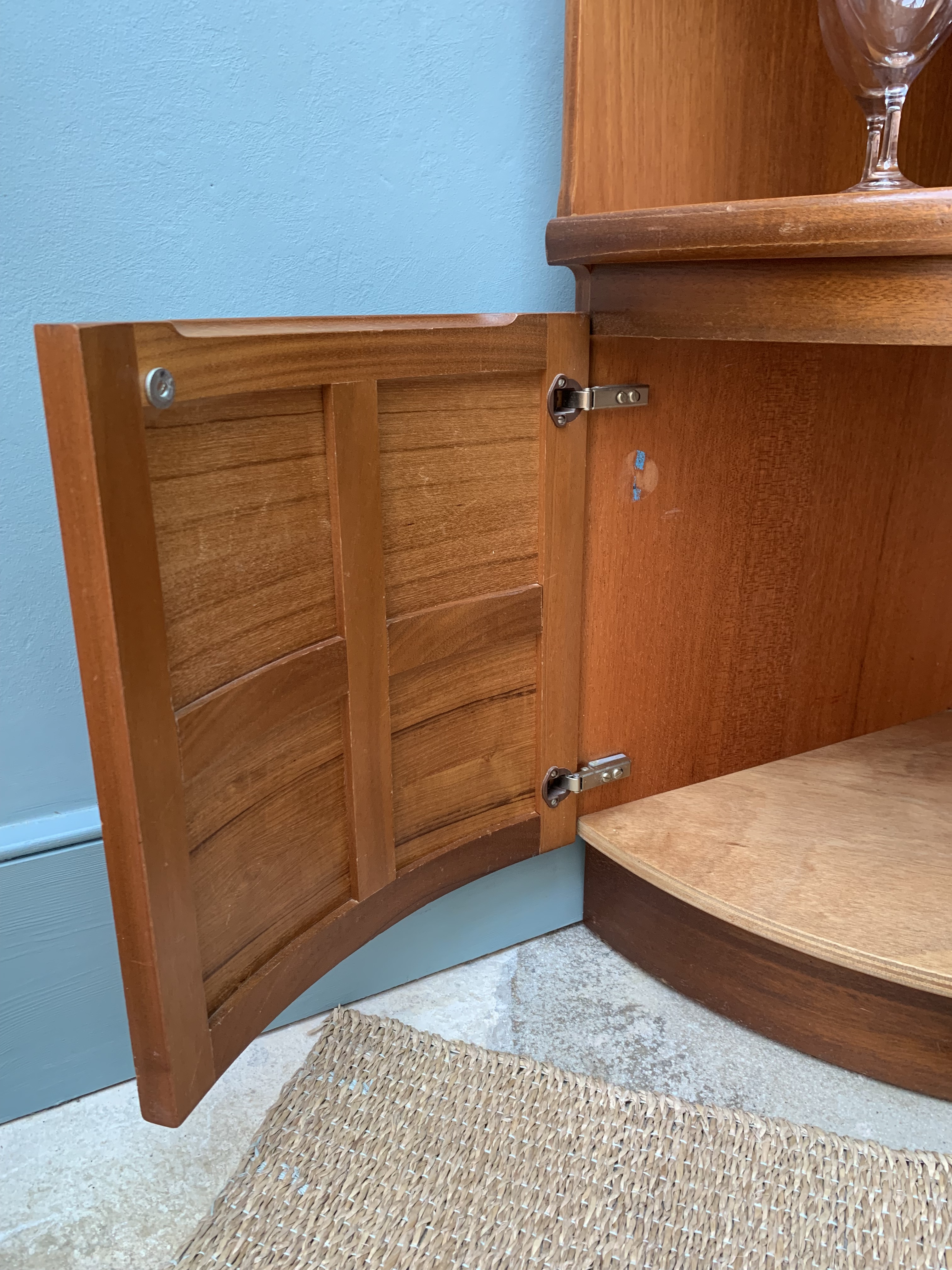 This mid century corner unit from the 1970s Nathan ‘Squares’ collection by British furniture makers Nathan, is such a versatile statement piece for even the smallest of rooms, It is ideal as a drinks cabinet, display cabinet, bookcase or storage unit. Its compact, space efficient corner design beautifully combines style and practicality. The corner unit features a spacious cupboard at the bottom (ideal for bottles), a good sized storage compartment above (perfect for glasses), the main top shelf of the base unit and two smaller corner display shelves which can be adjusted in height to suit your requirements. The very cool retro style corner unit features the iconic Nathan squares design on the front of the cupboard doors and while we have left the unique in its original teak wood finish and just added a protective layer of beeswax, the unit is also ideal for refurbishing and painting to fit with your colour scheme. Price £255