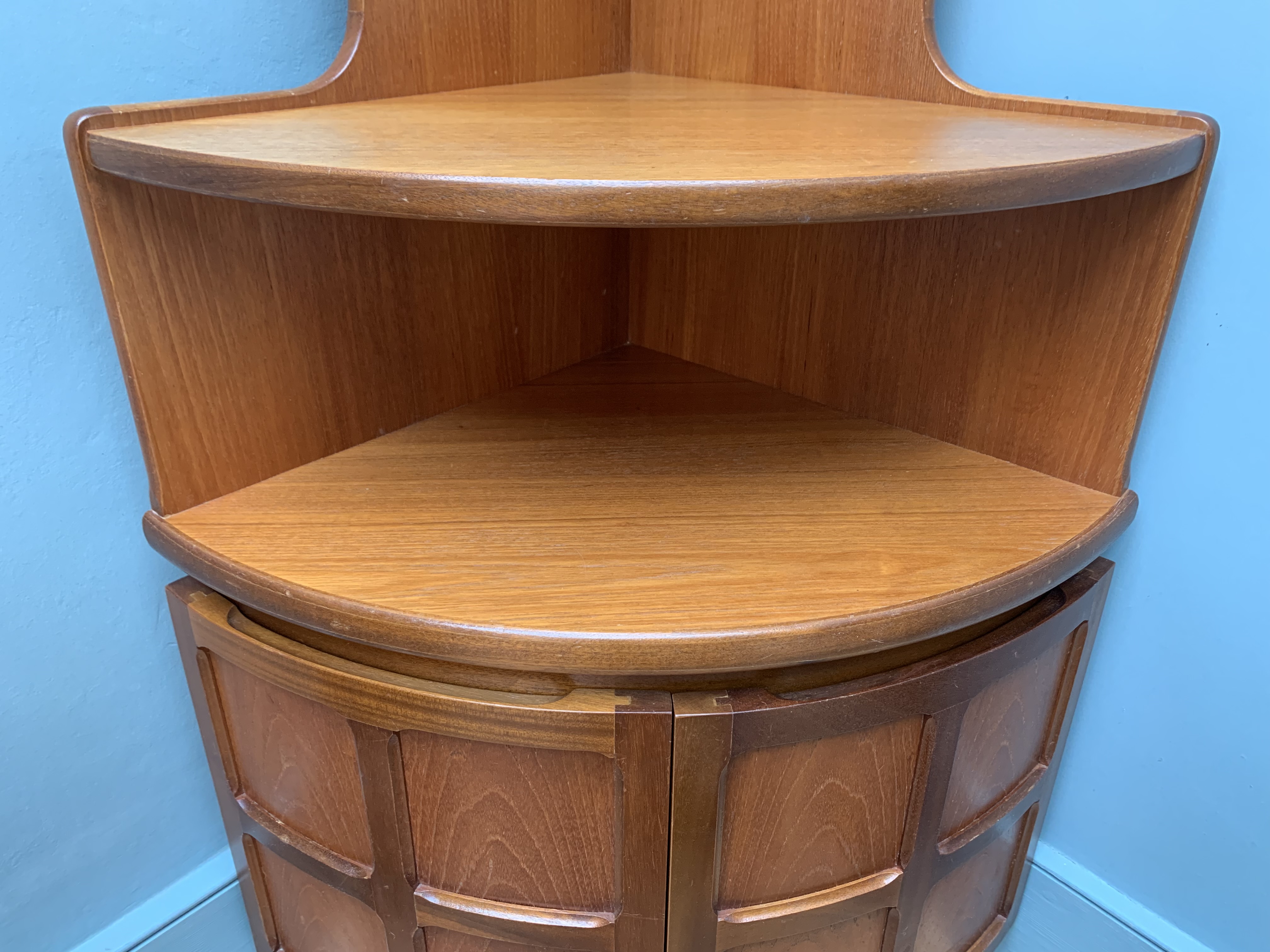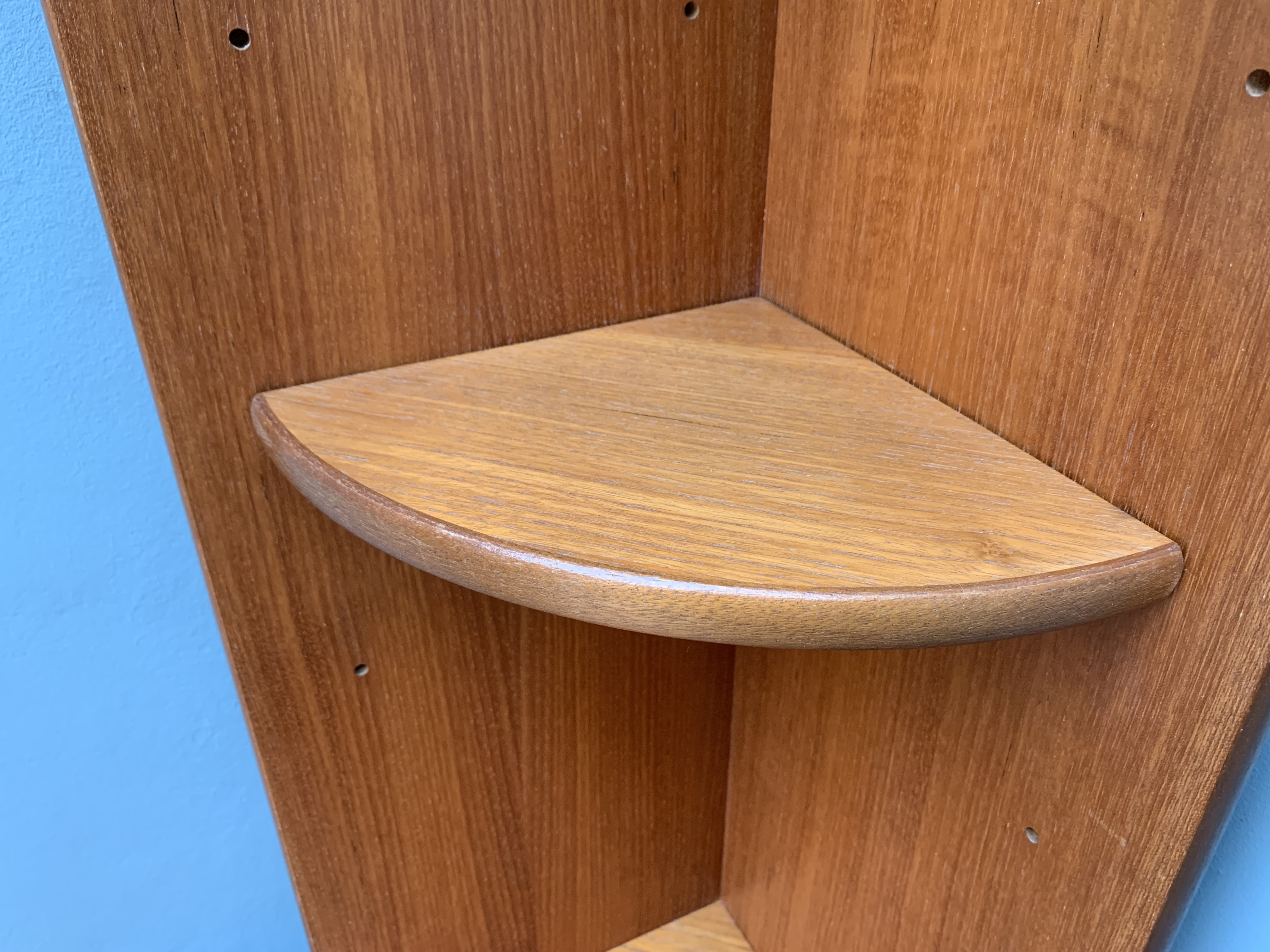 Condition – The corner unit is is very good vintage condition, solid, structurally sound and with just a few very minor signs of age appropriate wear. There is no damage or significant marks. There are several height adjustable holes for the shelves and there was an additional hole originally used to fix the unit to another, which we have sympathetically filled and painted to match the teak. As you can see from the pictures, this is barely visible. The Nathan blue makers mark sticker has worn away but you can see where it once was!