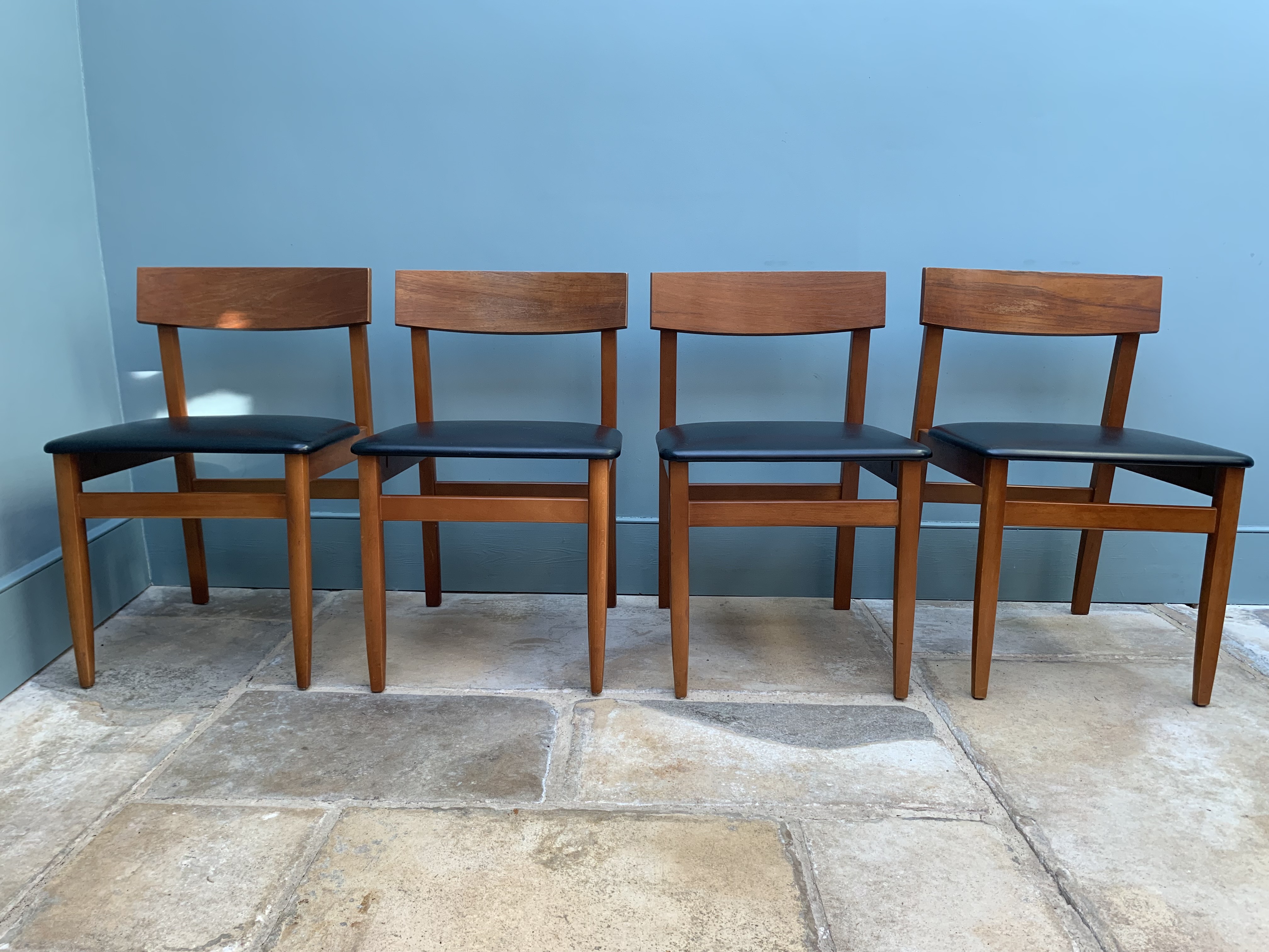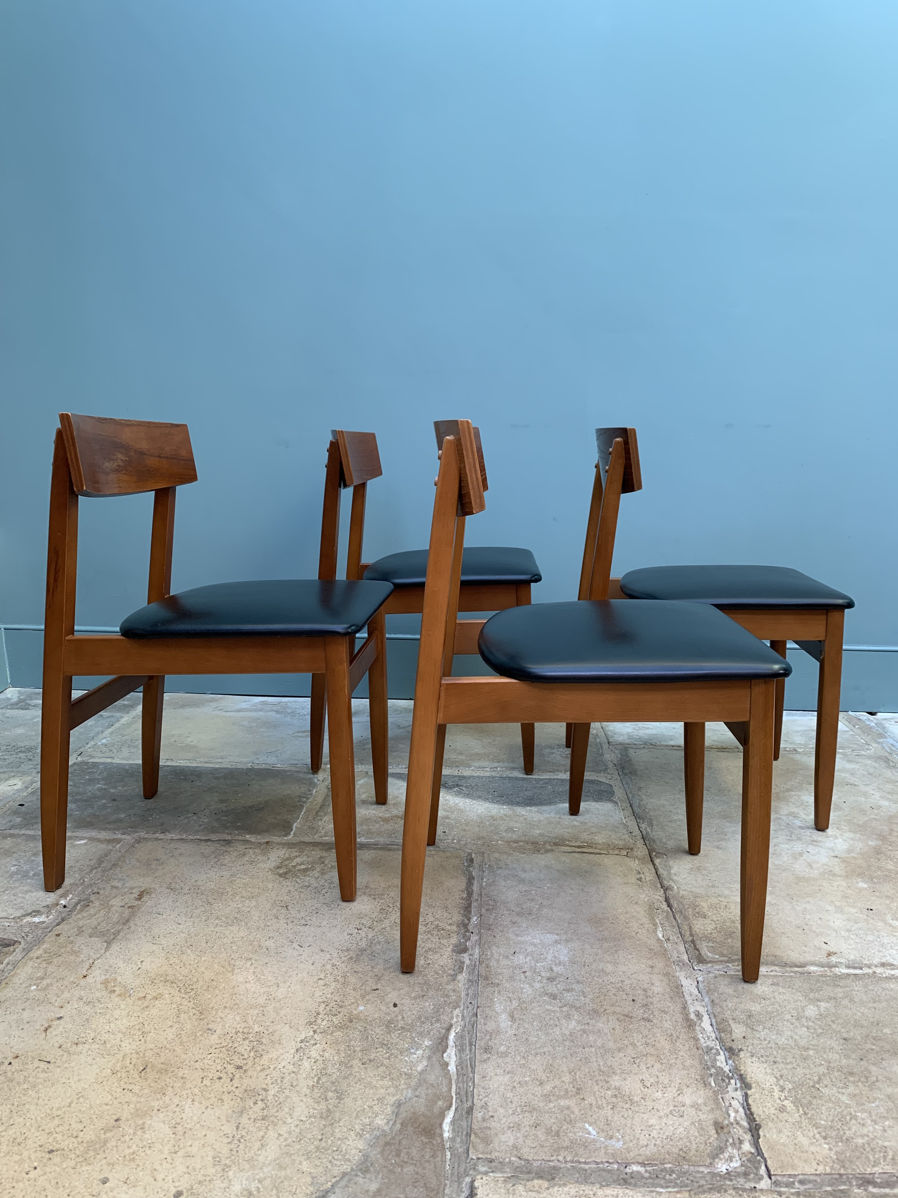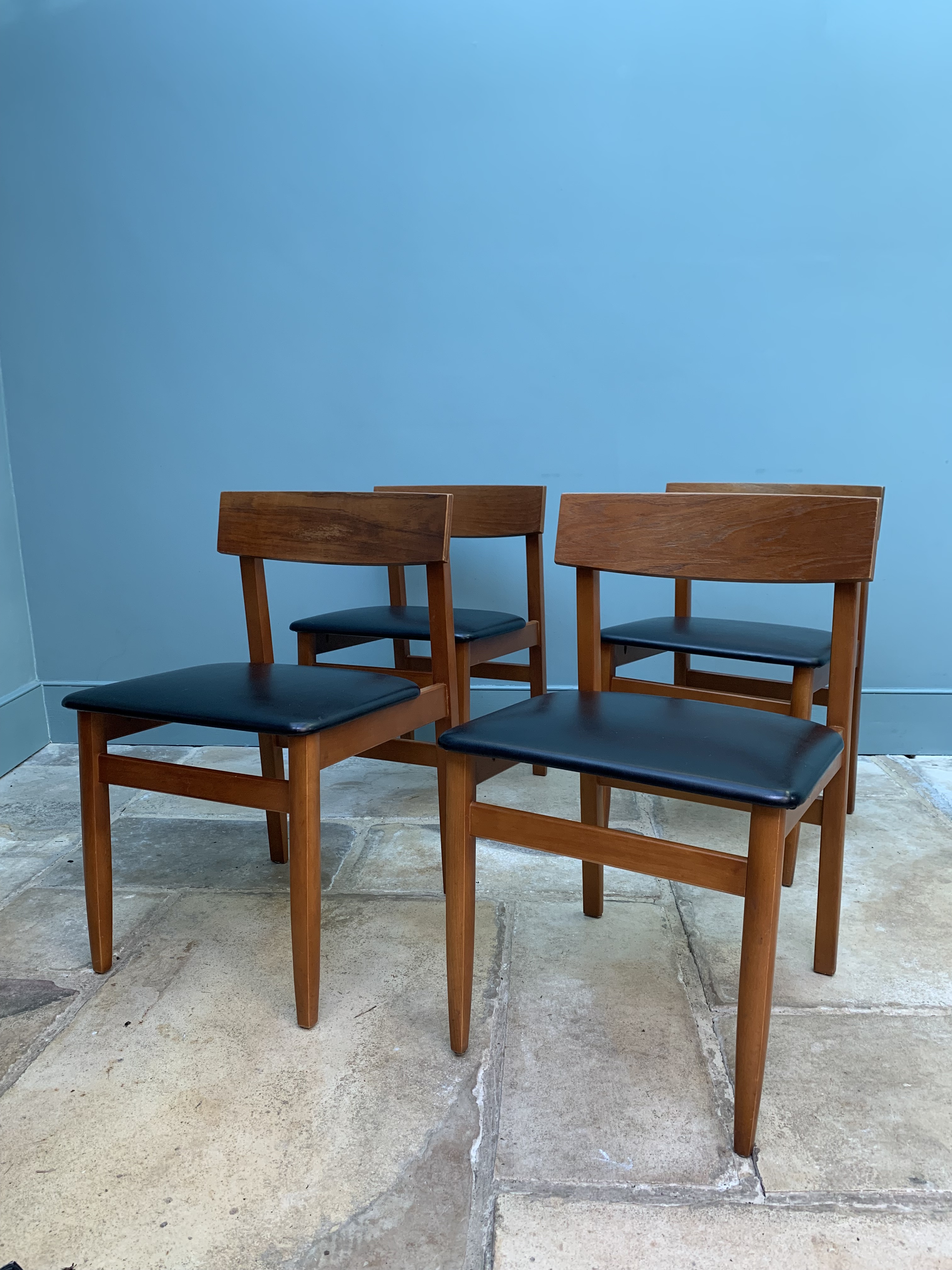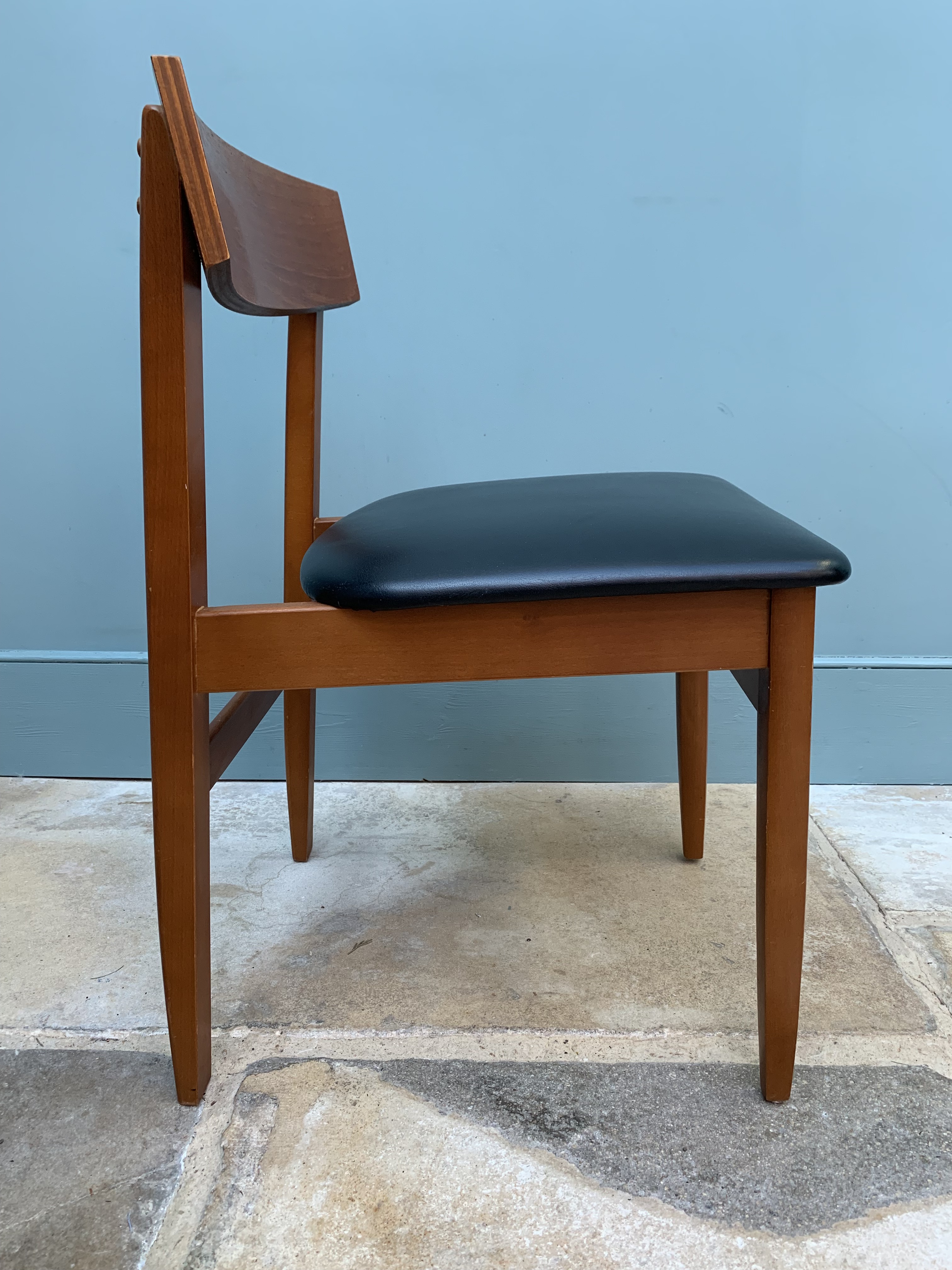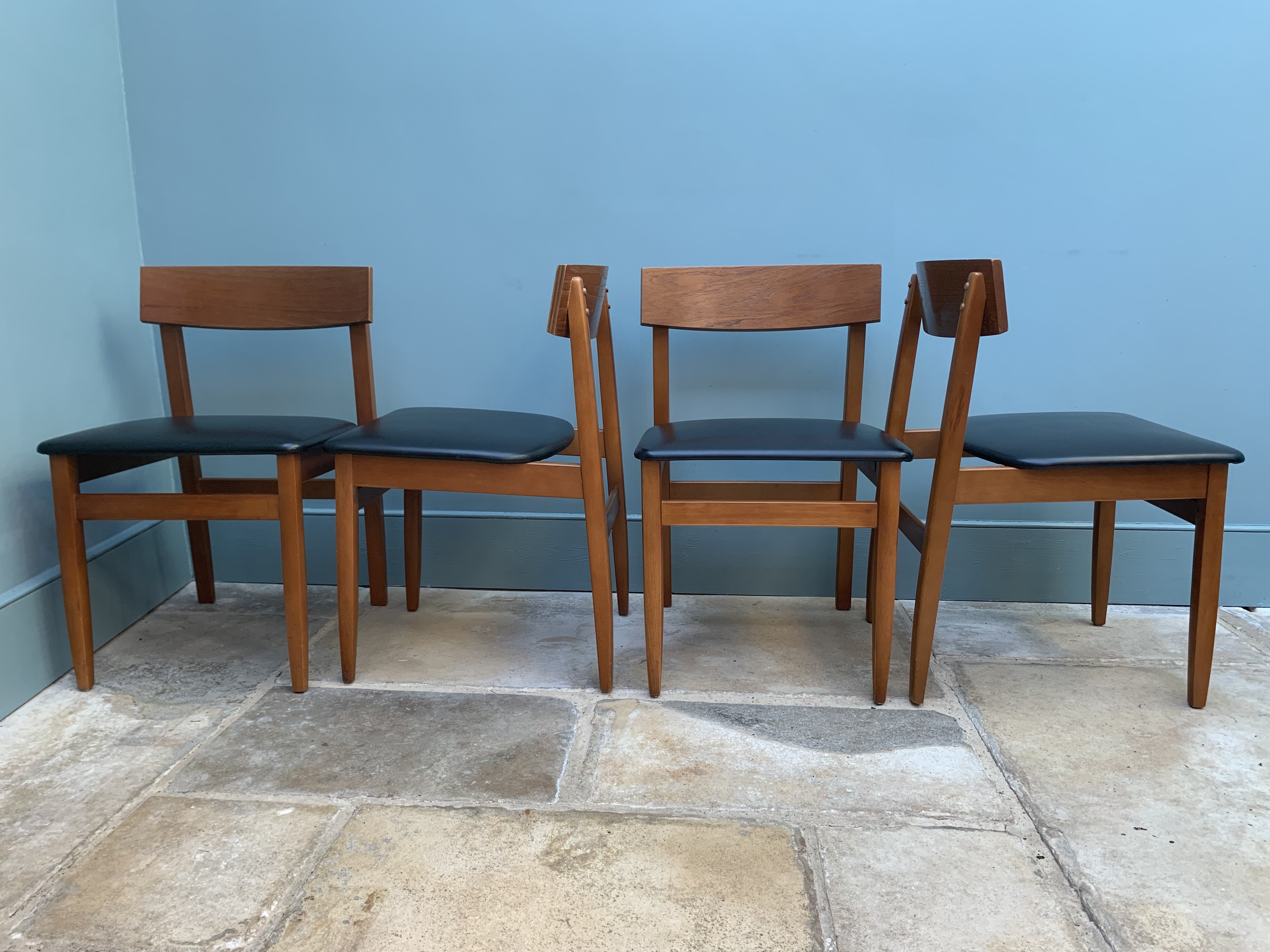 A striking set of 4 mid century dining chairs produced in 1963. They are beautifully designed, with the frames crafted from beech, the curved back rests from teak and with black vinyl seats. They do not feature any makers mark but their minimalist and clean lined design, curved back rests, vinyl seats and tapered beech legs give them a very cool retro and Scandi/Danish feel – a very current aesthetic for today’s homes and interiors. For mid century dining chairs of this era, these hardwood and vinyl dining chairs are in superb condition and structurally perfect. We have retained their natural patina and applied a beeswax polish to the wood to bring out the natural sheen and grain and to protect them. The vinyl seats are immaculate with no rips, scratches or stains. This superb set of 4 mid century dining chairs has been treasured for nearly 60 years by one British owner in the Cotswolds, and is now ready for a new life in today’s modern home. SOLD