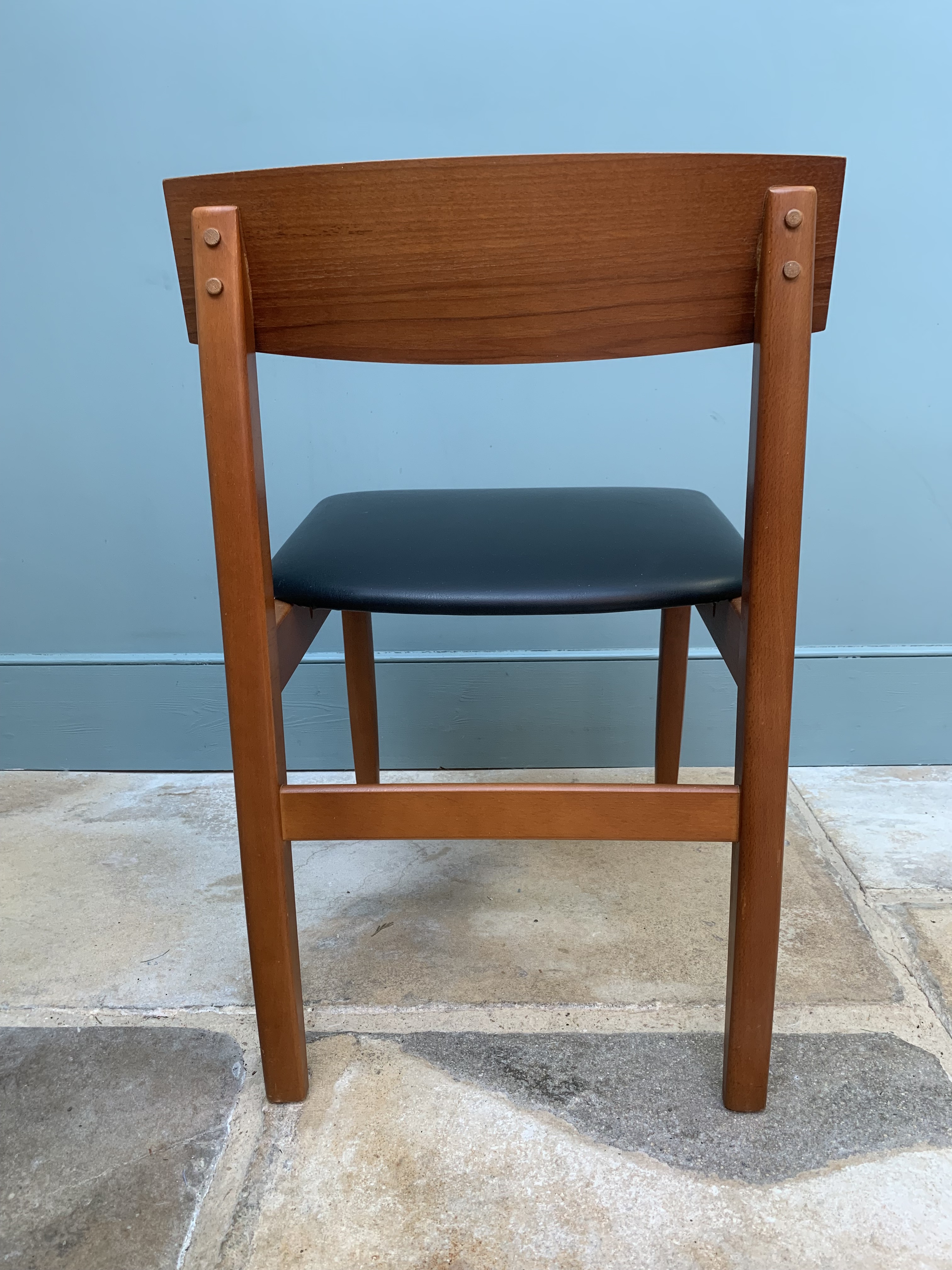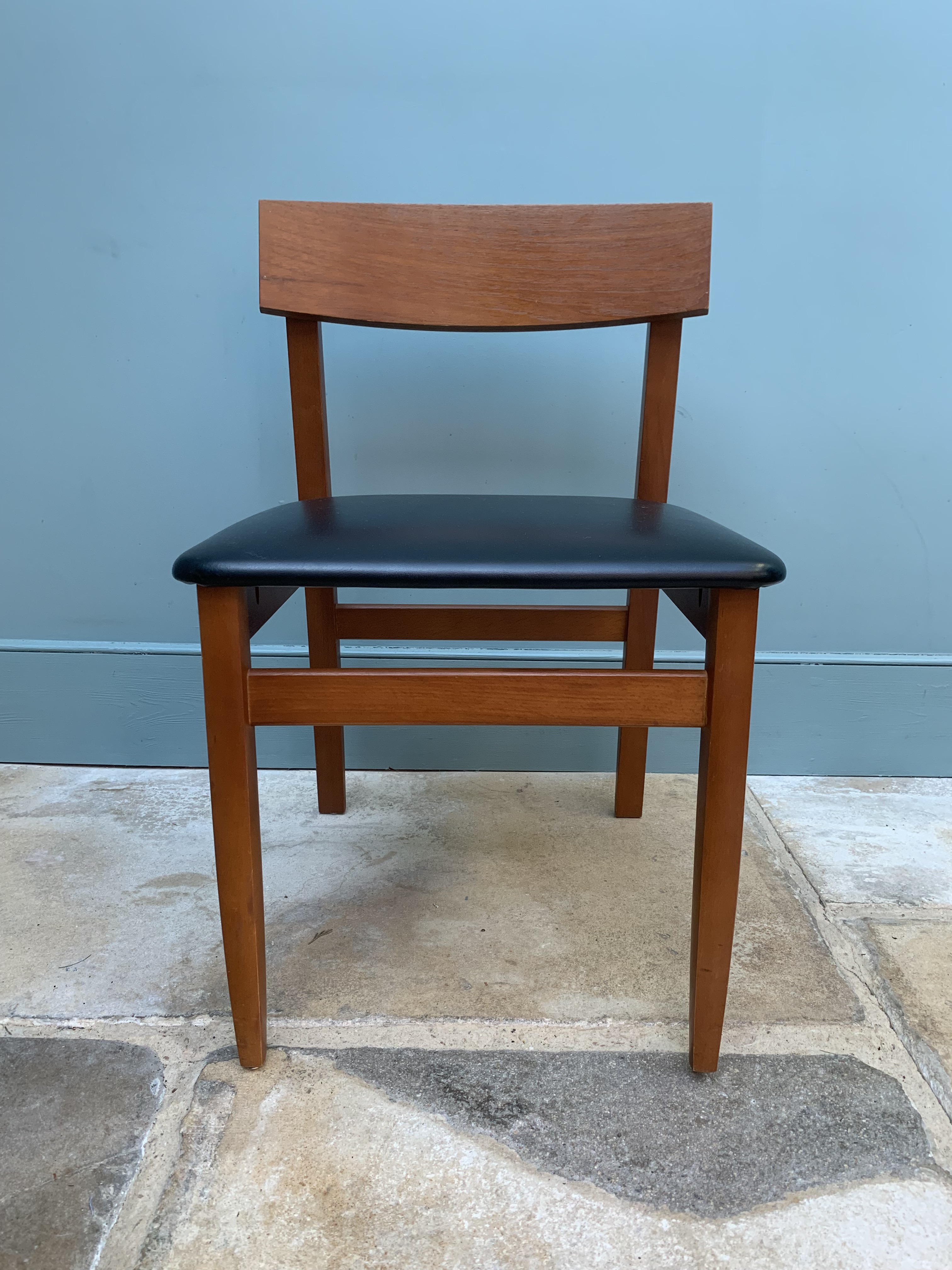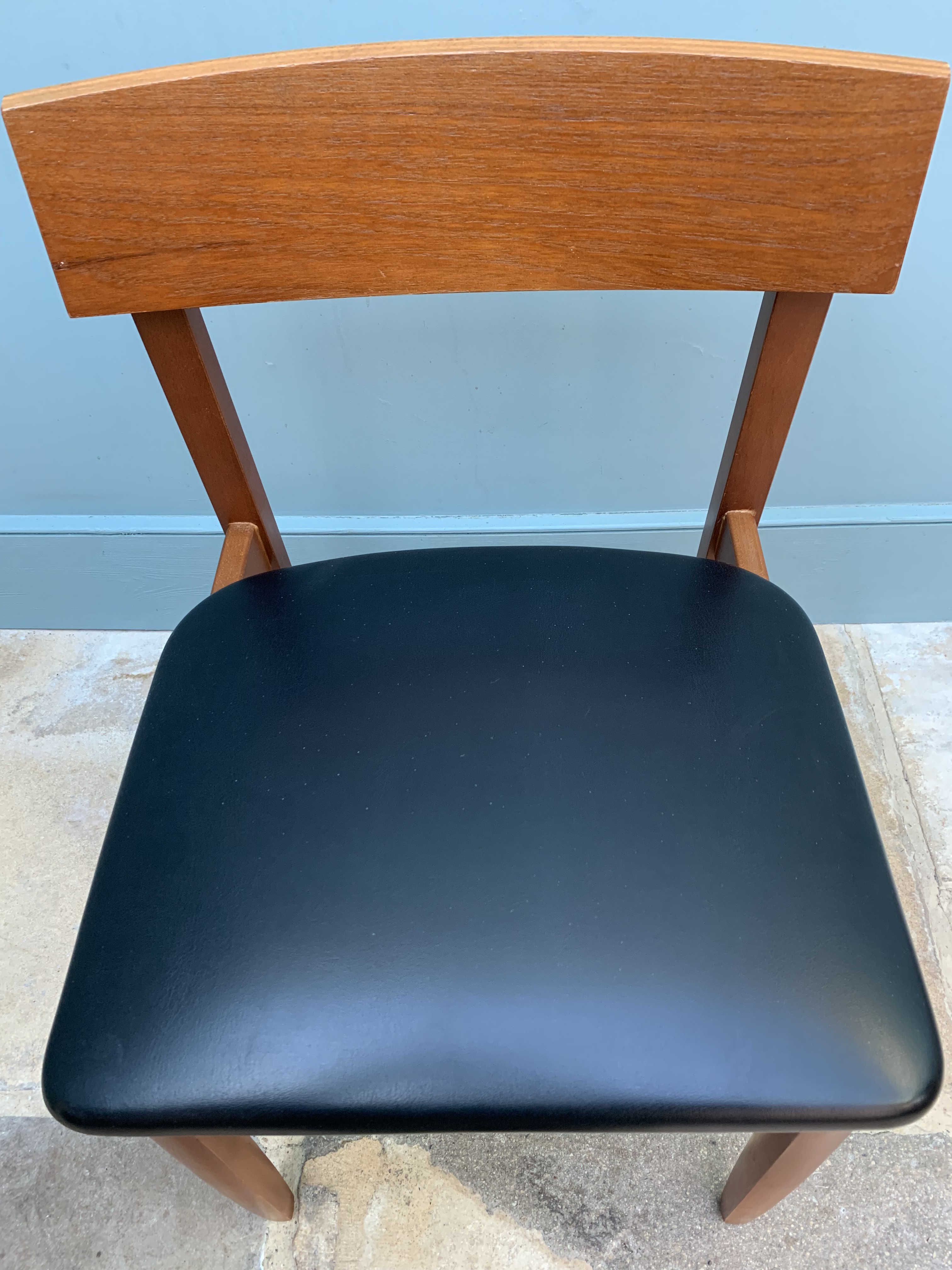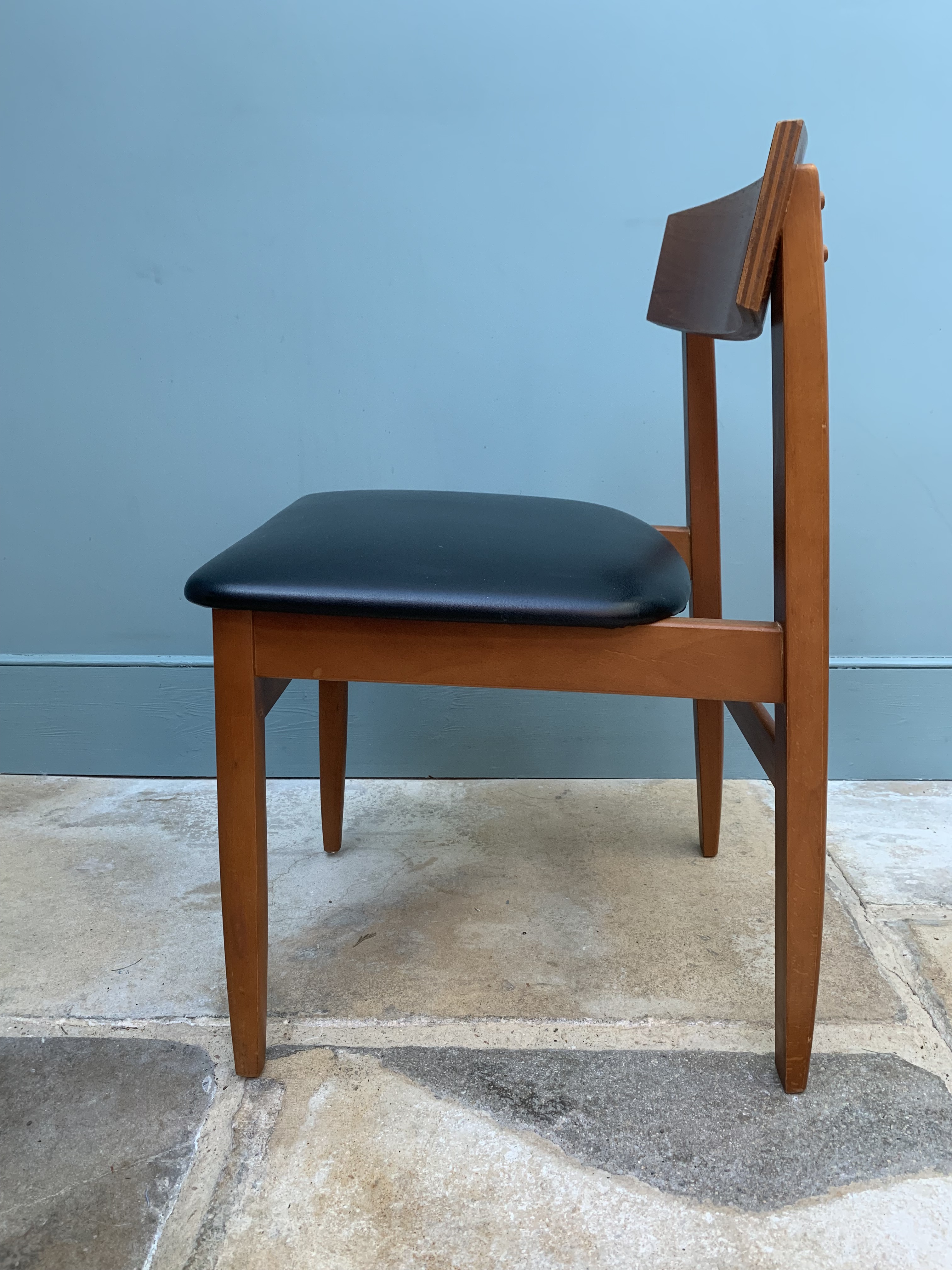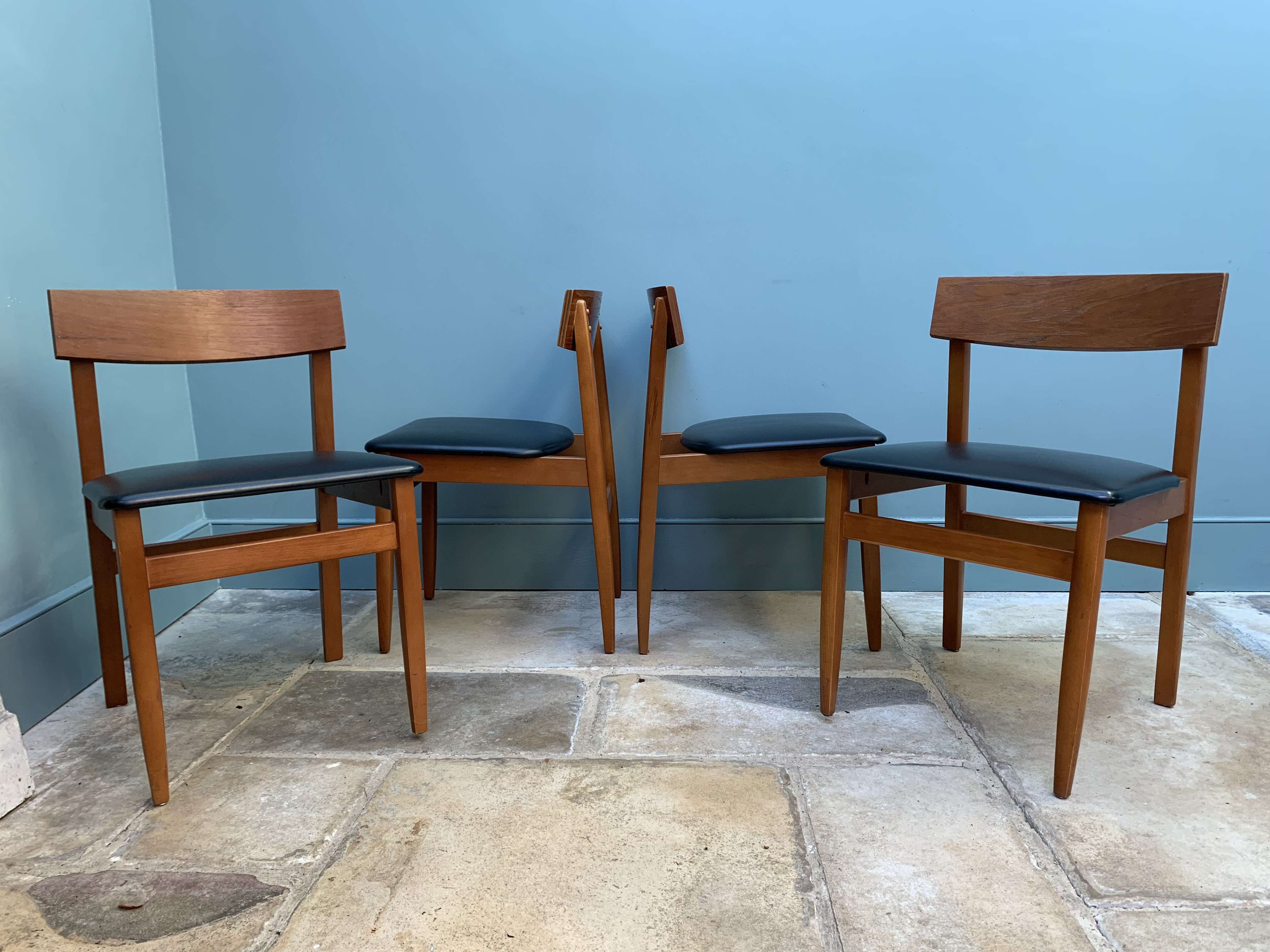A striking set of 4 mid century dining chairs produced in 1963. They are beautifully designed, with the frames crafted from beech, the curved back rests from teak and with black vinyl seats. They do not feature any makers mark but their minimalist and clean lined design, curved back rests, vinyl seats and tapered beech legs give them a very cool retro and Scandi/Danish feel – a very current aesthetic for today’s homes and interiors. For mid century dining chairs of this era, these hardwood and vinyl dining chairs are in superb condition and structurally perfect. We have retained their natural patina and applied a beeswax polish to the wood to bring out the natural sheen and grain and to protect them. The vinyl seats are immaculate with no rips, scratches or stains. This superb set of 4 mid century dining chairs has been treasured for nearly 60 years by one British owner in the Cotswolds, and is now ready for a new life in today’s modern home. SOLD