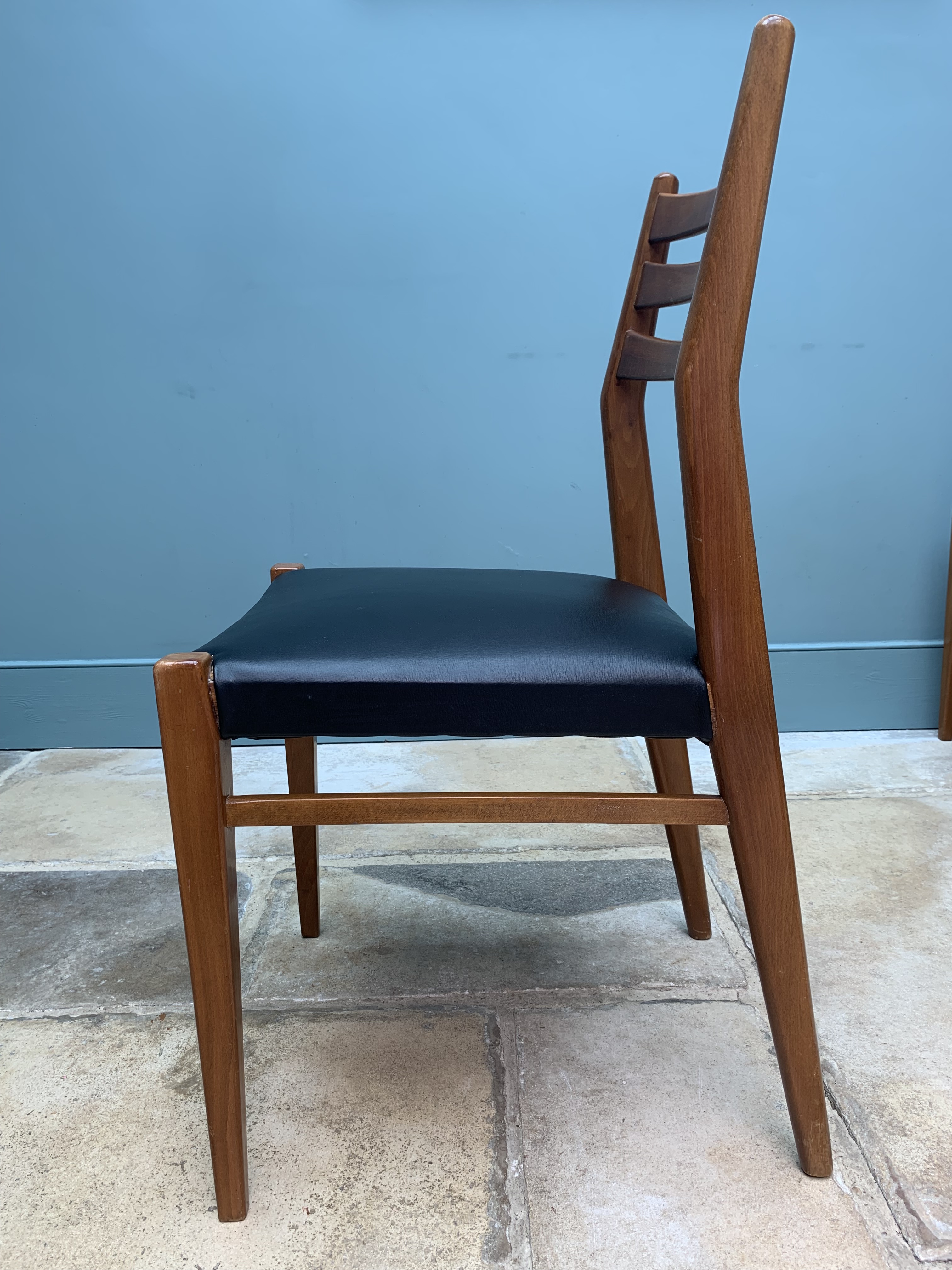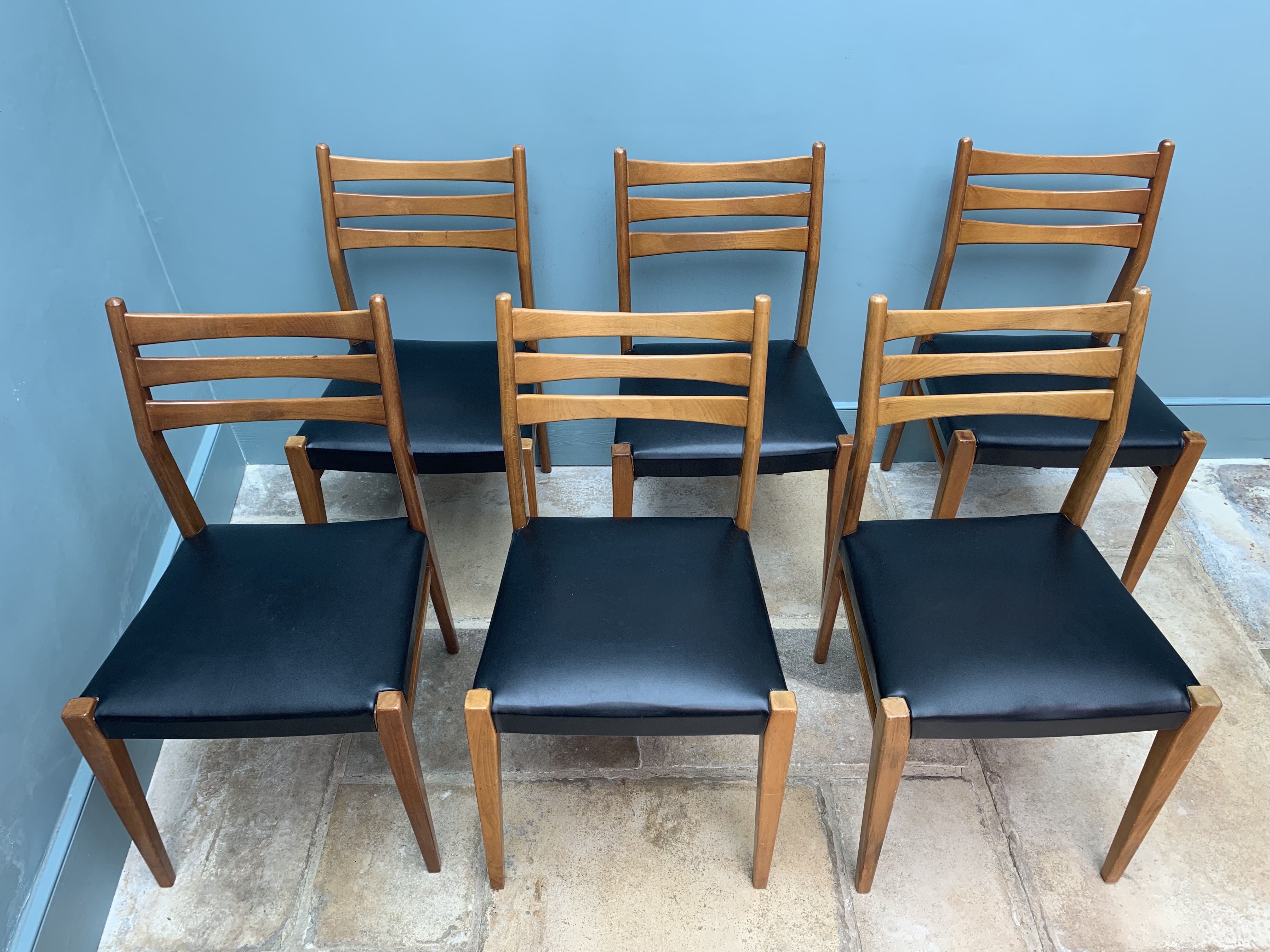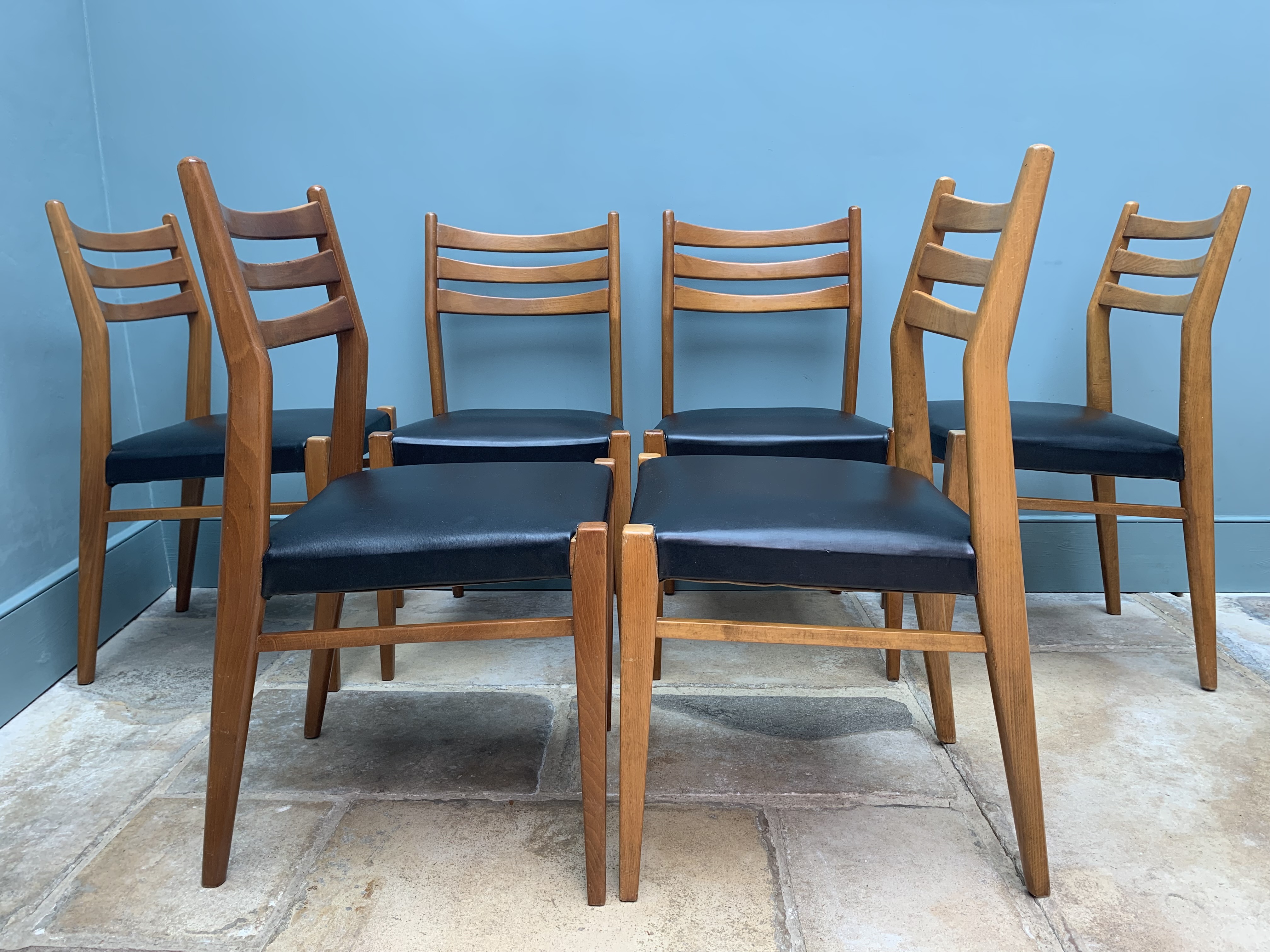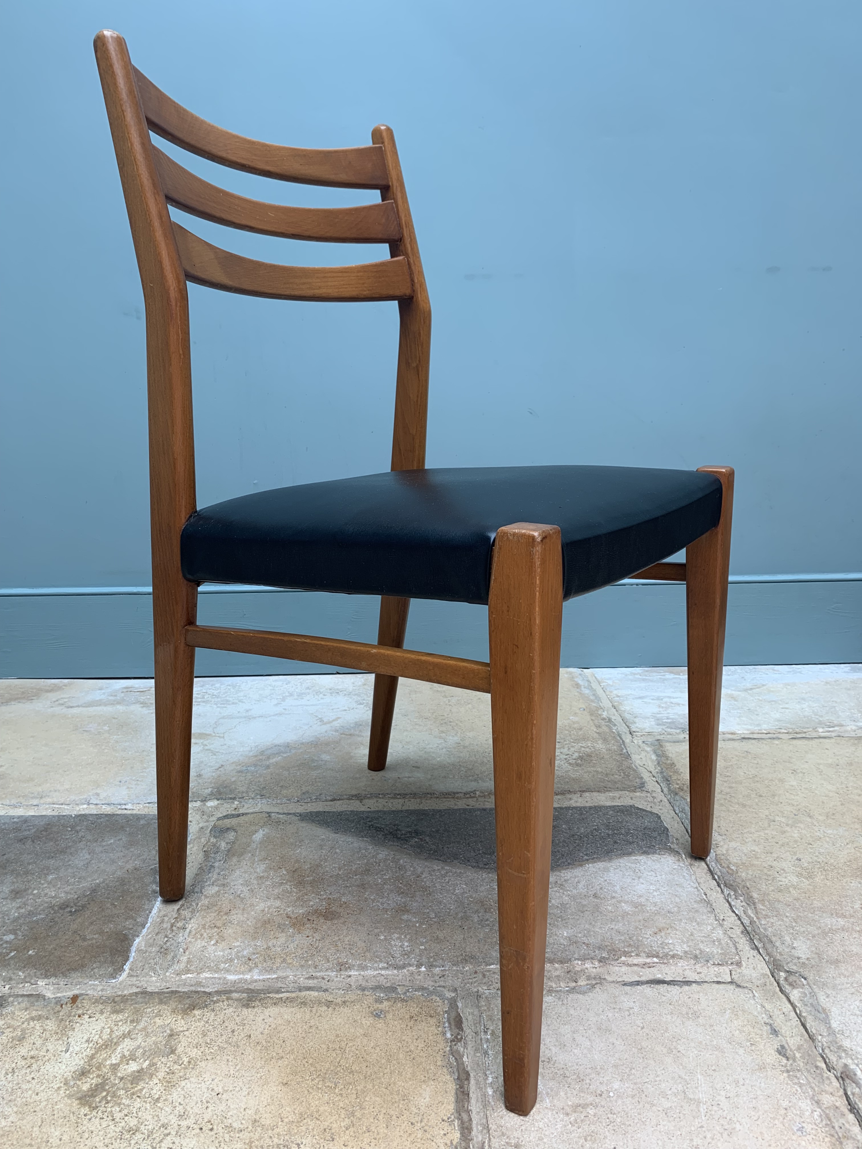 A stunning set of 6 teak mid century dining chairs. These ladderback dining chairs are beautifully designed featuring a striking angled teak wood frame and legs and also have very cool, practical and comfy black vinyl seats. These mid century dining chairs do not feature any makers mark but their minimalist and clean lined design, angled ladderback frame, vinyl seats and tapered teak legs give them a distinctly cool retro and Scandi/Danish feel – a very current aesthetic for today’s homes and interiors. For mid century dining chairs of this era, these hardwood and vinyl dining chairs are in superb condition and structurally perfect. We have retained their natural patina and applied a beeswax polish to the wood to bring out the natural sheen and grain and to protect them. The black vinyl seats are in superb condition with no rips, scratches or stains. This superb set of 6 mid century dining chairs has been looked after and loved for over 60 years and is now ready for a new life in today’s modern home. SOLD