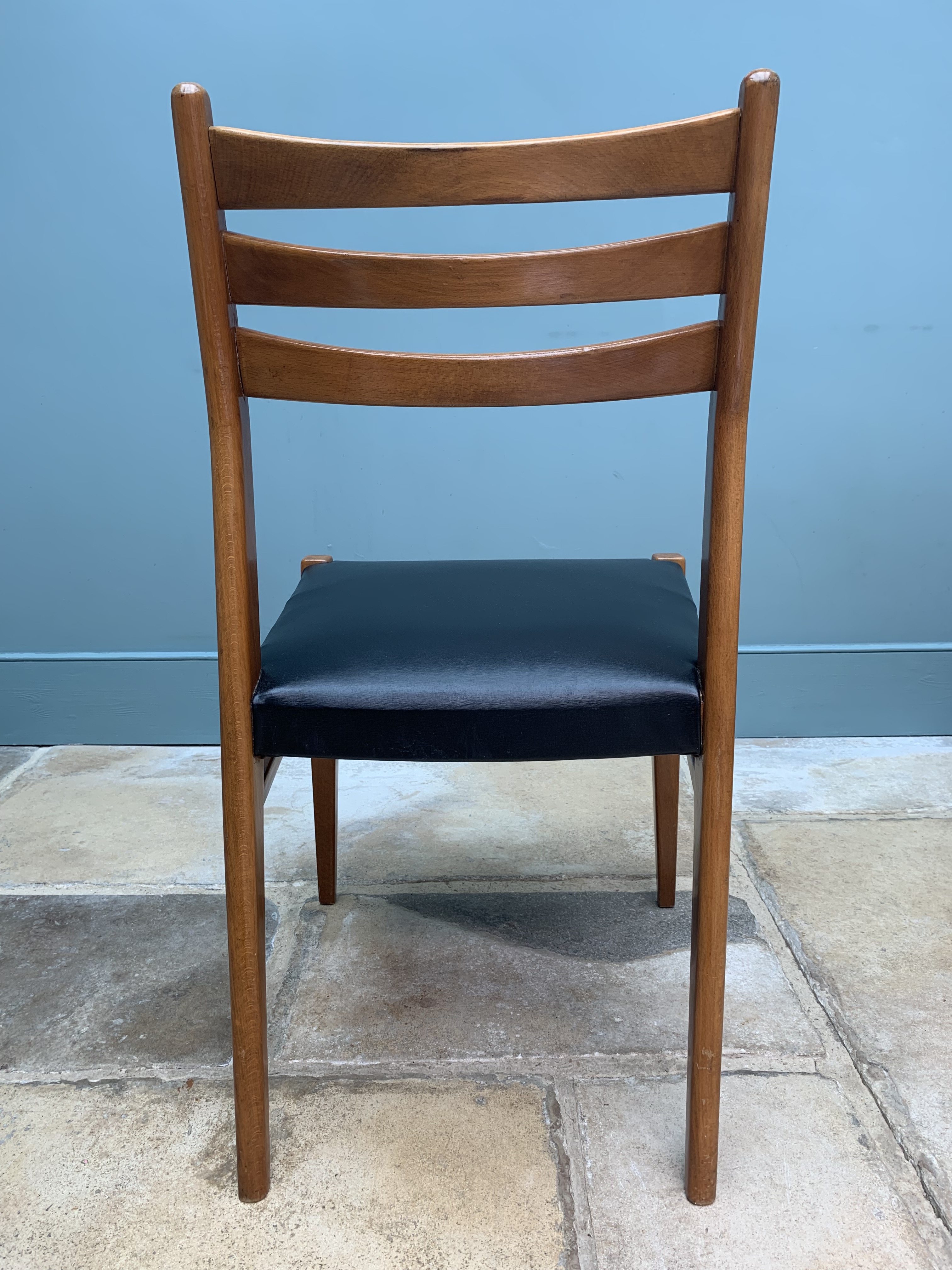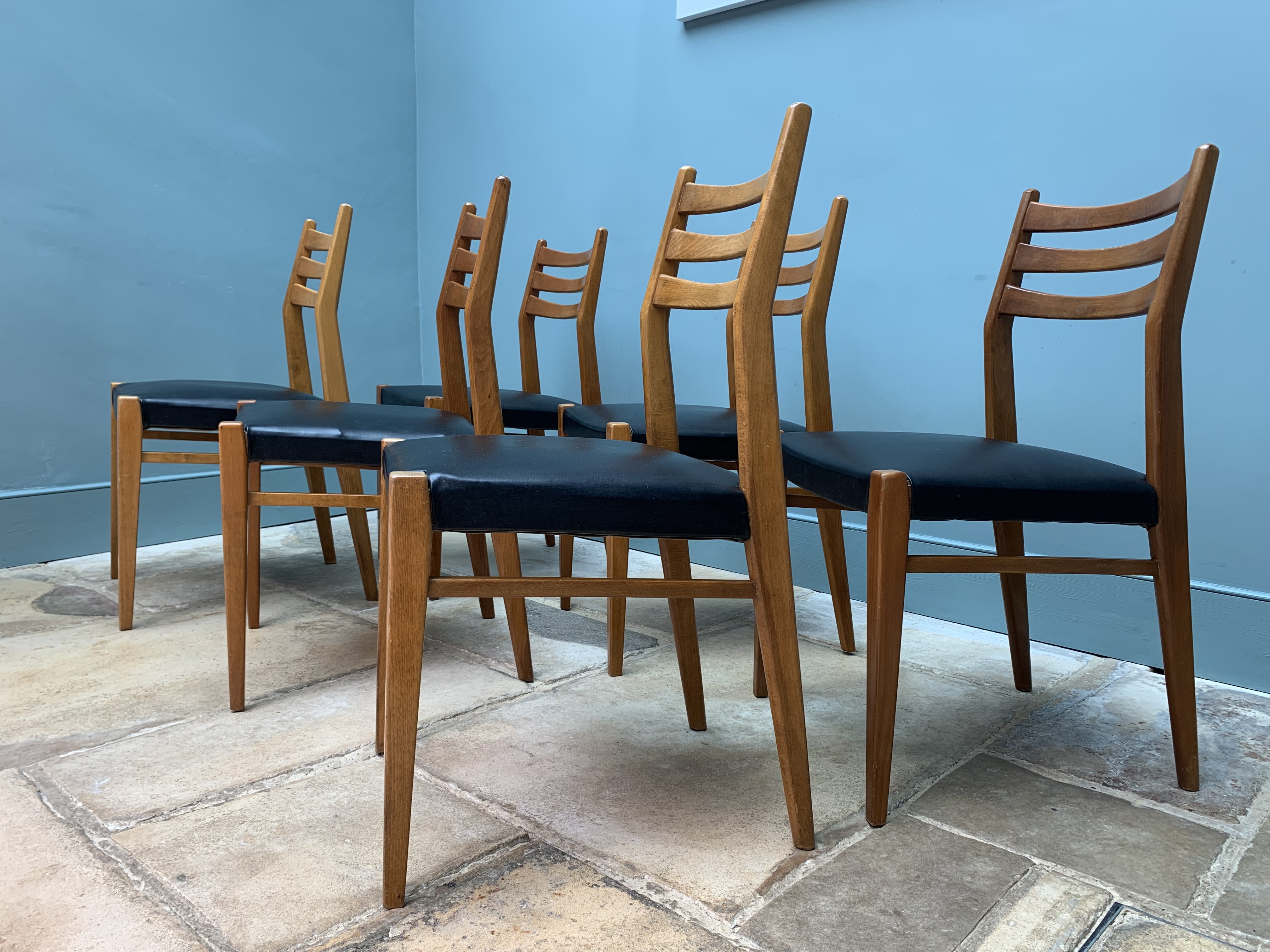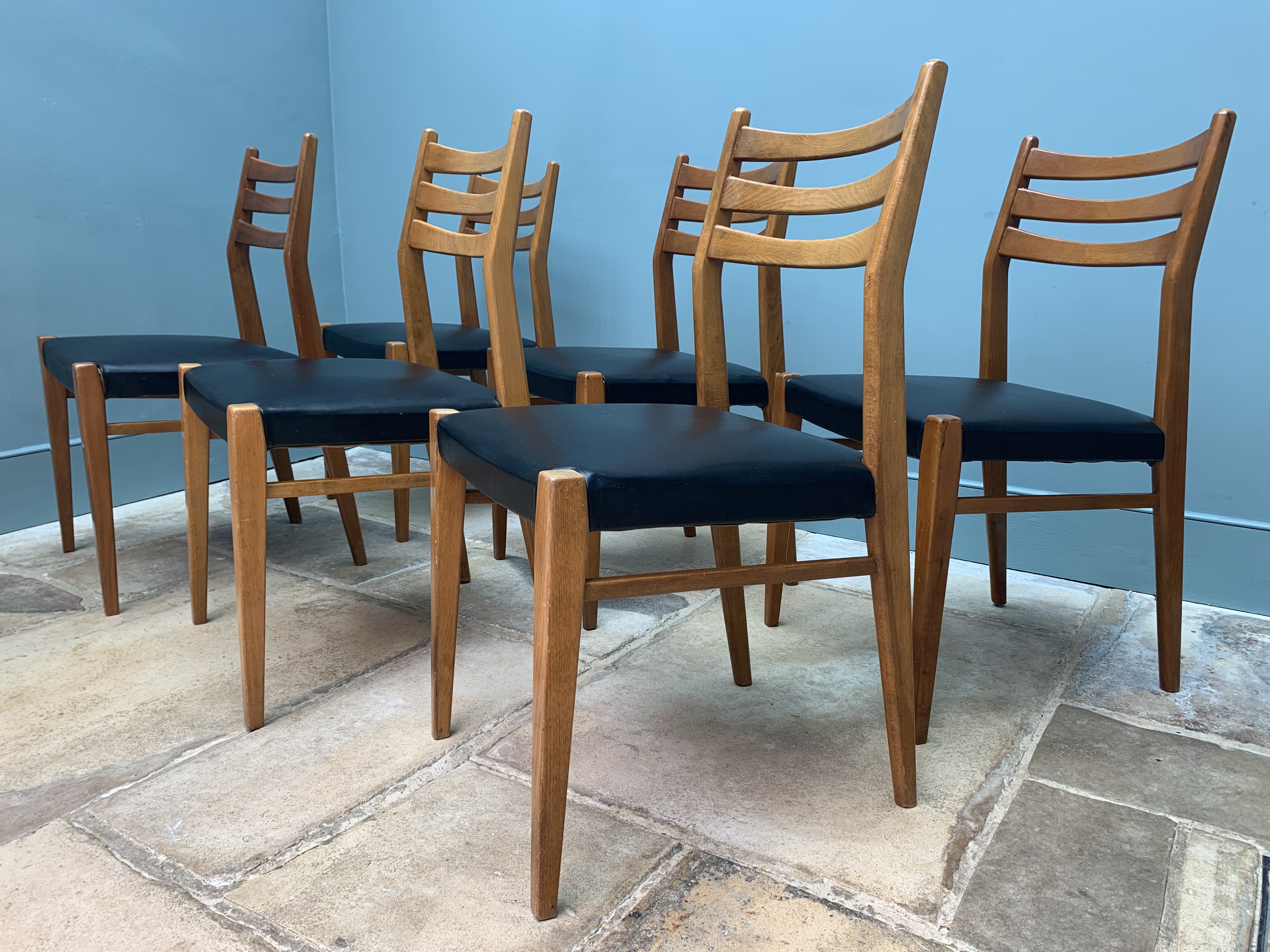 A stunning set of 6 teak mid century dining chairs. These ladderback dining chairs are beautifully designed featuring a striking angled teak wood frame and legs and also have very cool, practical and comfy black vinyl seats. These mid century dining chairs do not feature any makers mark but their minimalist and clean lined design, angled ladderback frame, vinyl seats and tapered teak legs give them a distinctly cool retro and Scandi/Danish feel – a very current aesthetic for today’s homes and interiors. For mid century dining chairs of this era, these hardwood and vinyl dining chairs are in superb condition and structurally perfect. We have retained their natural patina and applied a beeswax polish to the wood to bring out the natural sheen and grain and to protect them. The black vinyl seats are in superb condition with no rips, scratches or stains. This superb set of 6 mid century dining chairs has been looked after and loved for over 60 years and is now ready for a new life in today’s modern home. SOLD