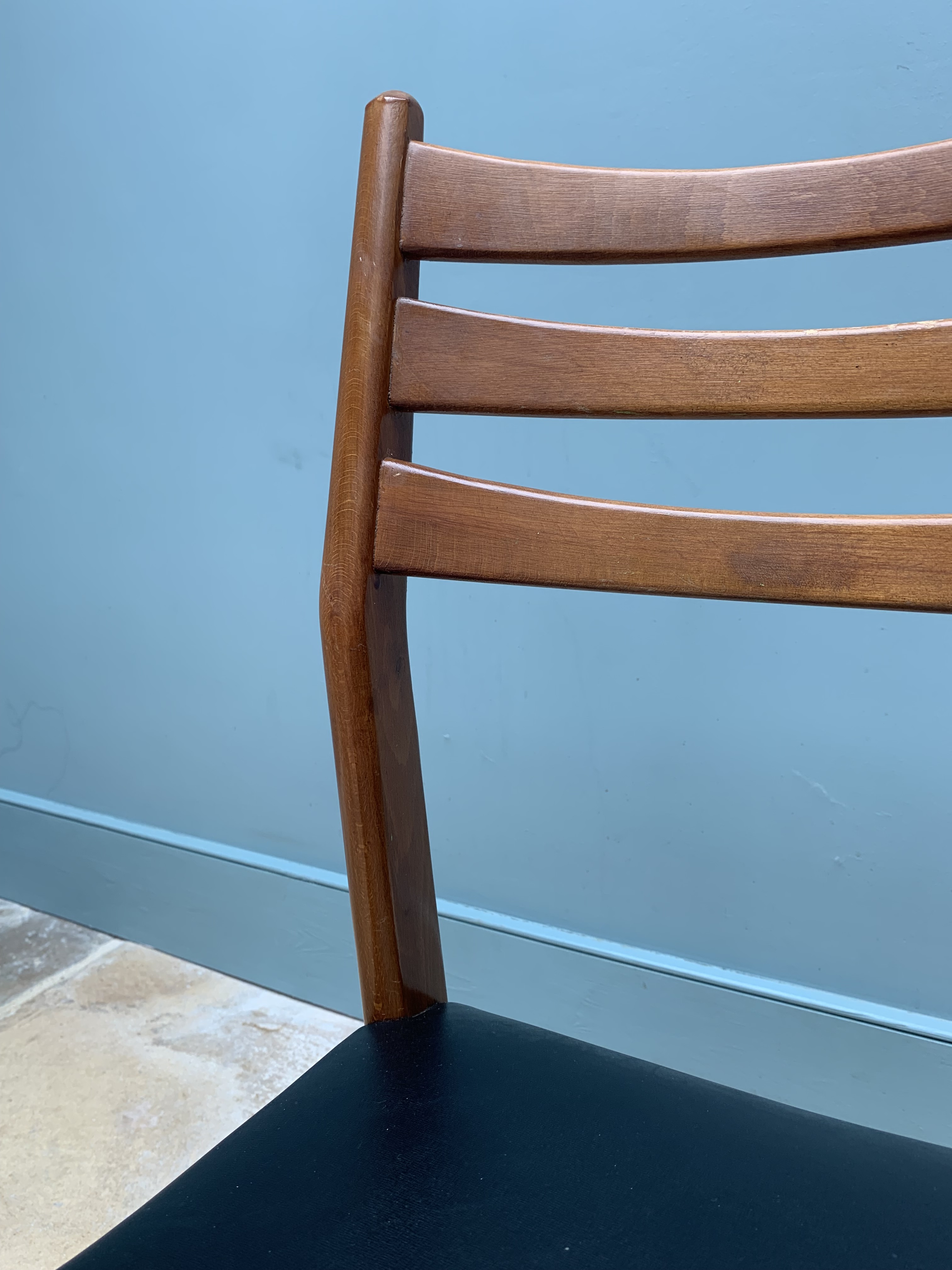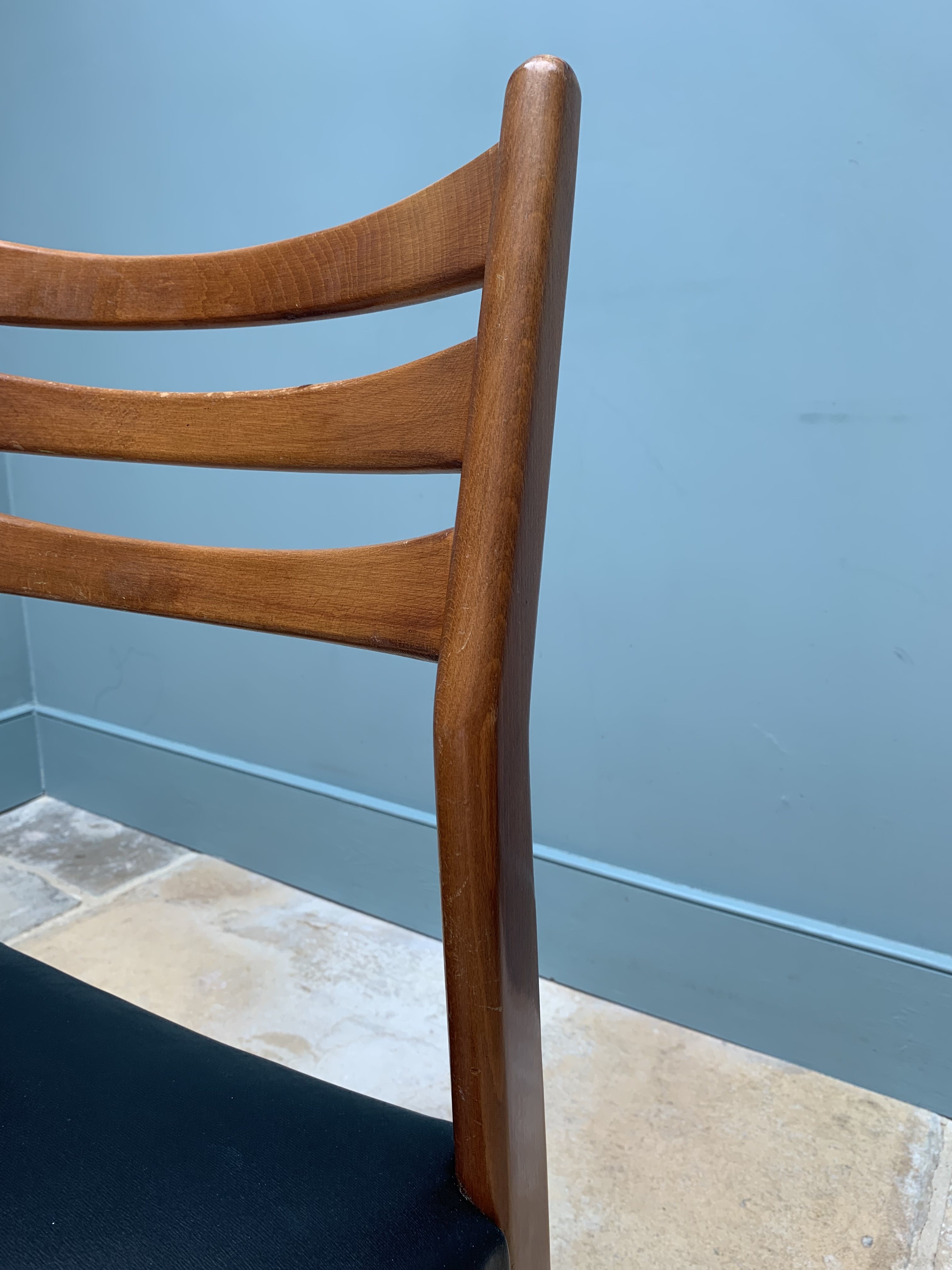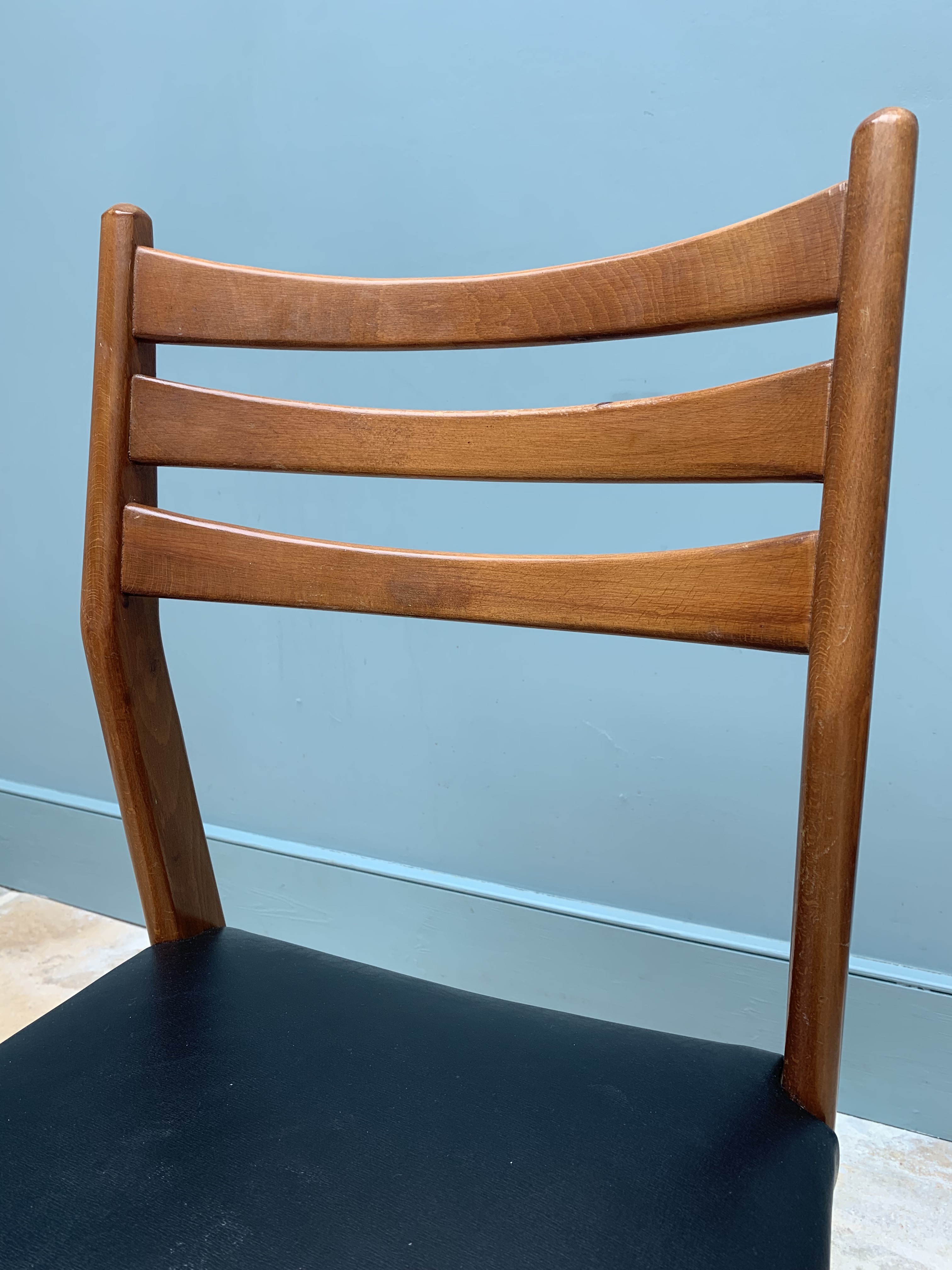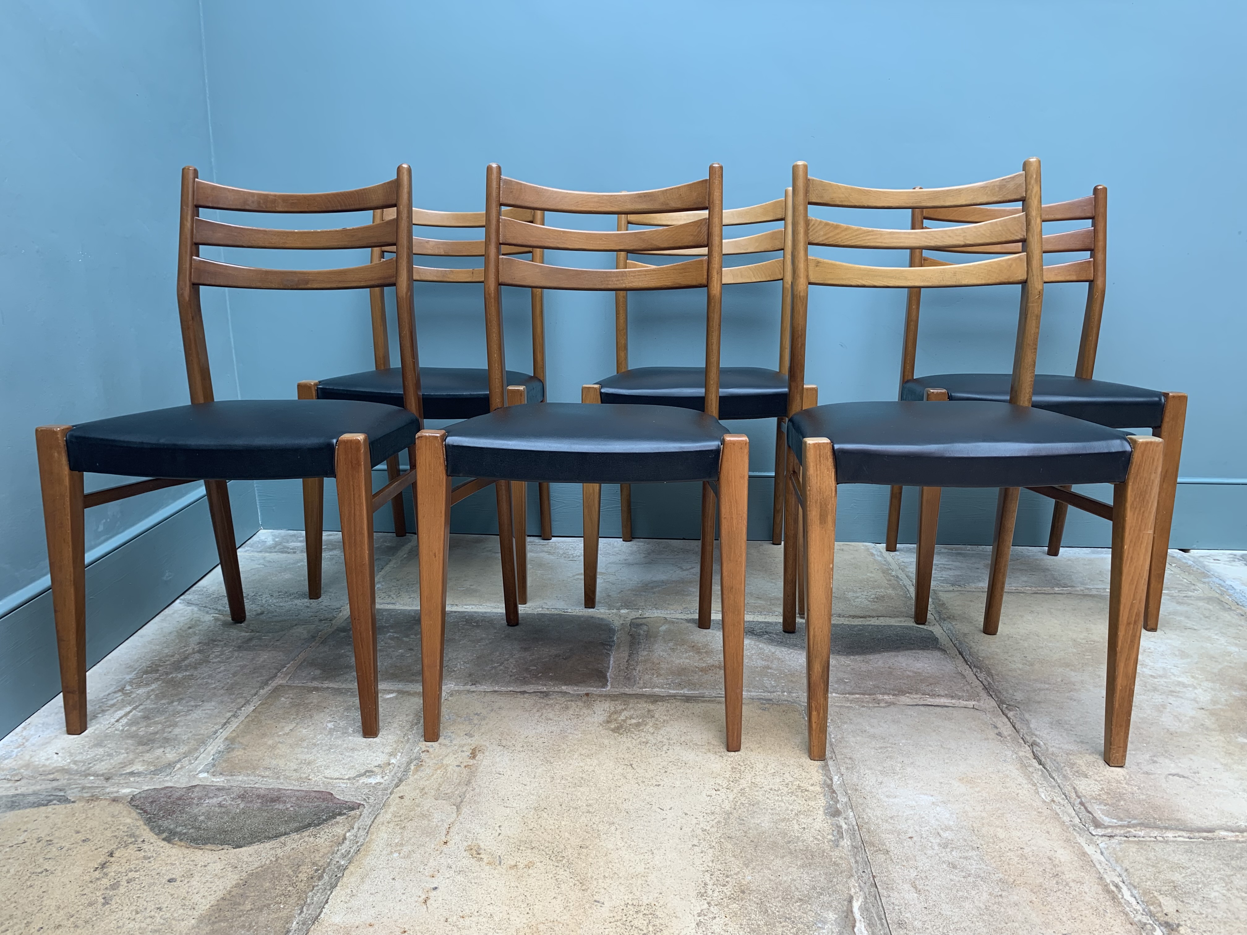 A stunning set of 6 teak mid century dining chairs. These ladderback dining chairs are beautifully designed featuring a striking angled teak wood frame and legs and also have very cool, practical and comfy black vinyl seats. These mid century dining chairs do not feature any makers mark but their minimalist and clean lined design, angled ladderback frame, vinyl seats and tapered teak legs give them a distinctly cool retro and Scandi/Danish feel – a very current aesthetic for today’s homes and interiors. For mid century dining chairs of this era, these hardwood and vinyl dining chairs are in superb condition and structurally perfect. We have retained their natural patina and applied a beeswax polish to the wood to bring out the natural sheen and grain and to protect them. The black vinyl seats are in superb condition with no rips, scratches or stains. This superb set of 6 mid century dining chairs has been looked after and loved for over 60 years and is now ready for a new life in today’s modern home. SOLD