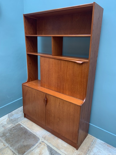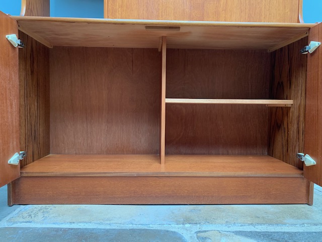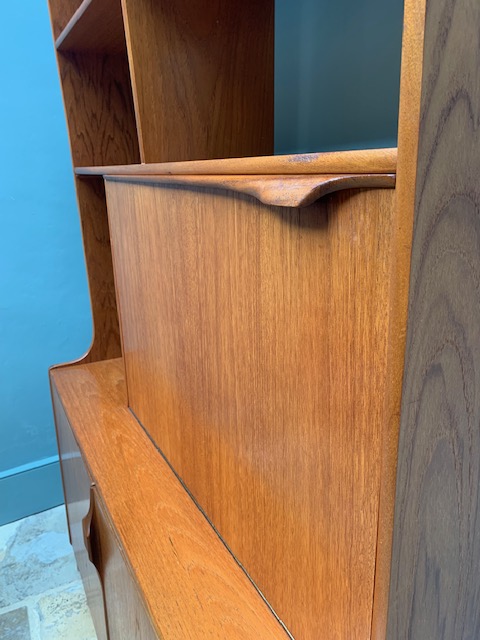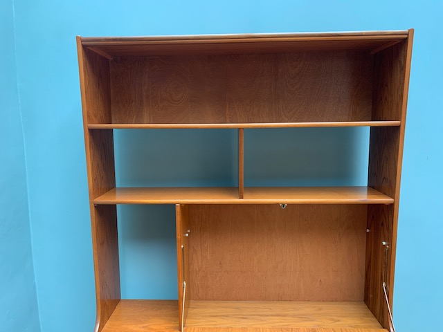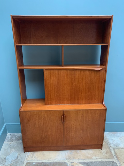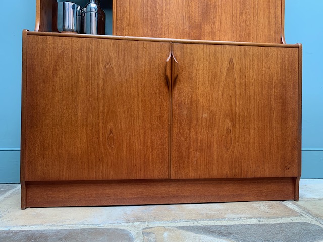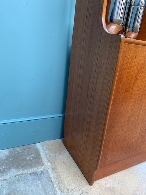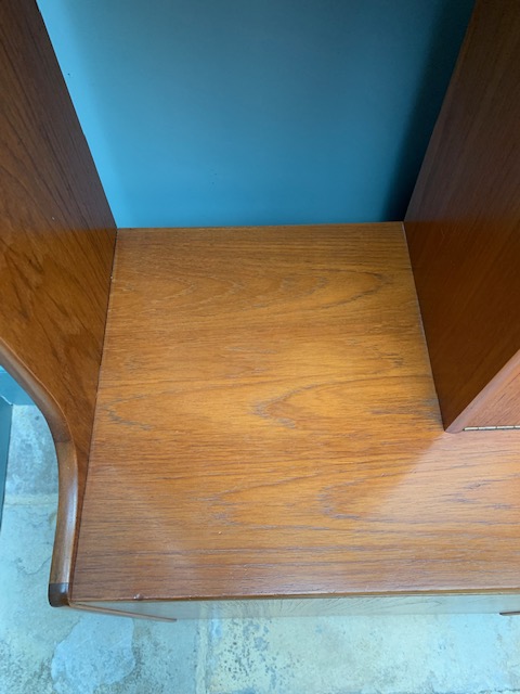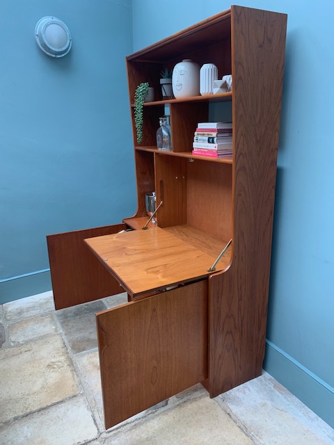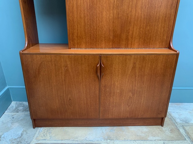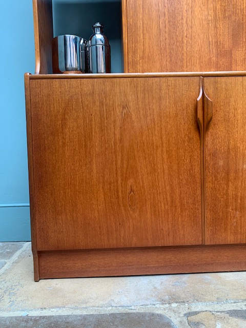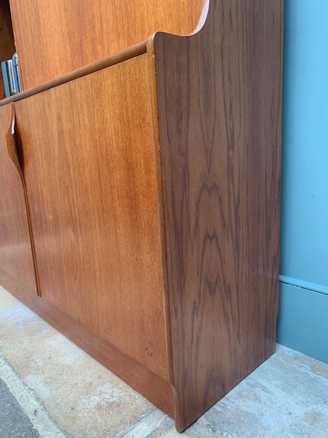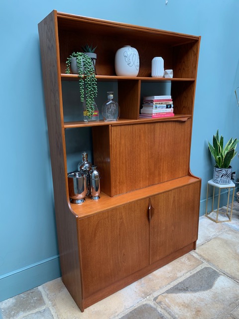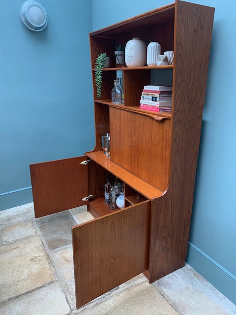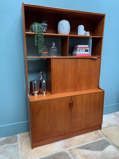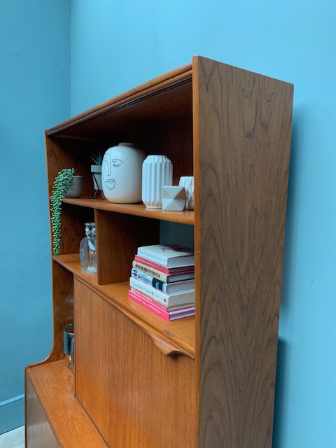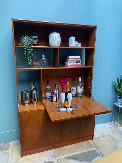 This funky mid century wall unit and cocktail cabinet features very cool open shelving, drop down drinks cabinet and handy cupboard at the bottom is a real gem. Not only does it have a very cool retro design and style, it is also a very compact size, height and depth. It is a really great fit for a modern home offering maximum storage and style for minimum space. Dating back to the 1960s the unit is in great vintage condition for its age. We have cleaned and polished the wood so it is ready for the cocktail hour! Price £450