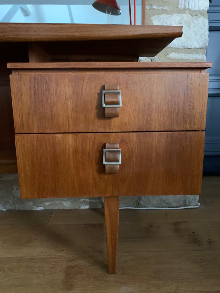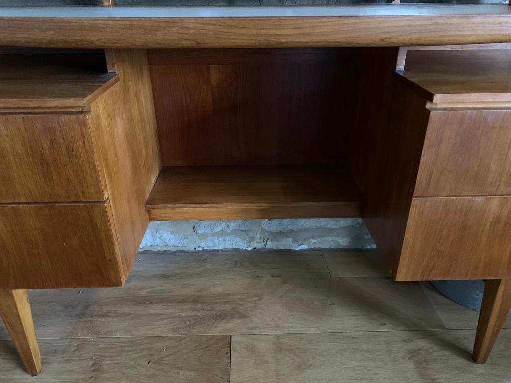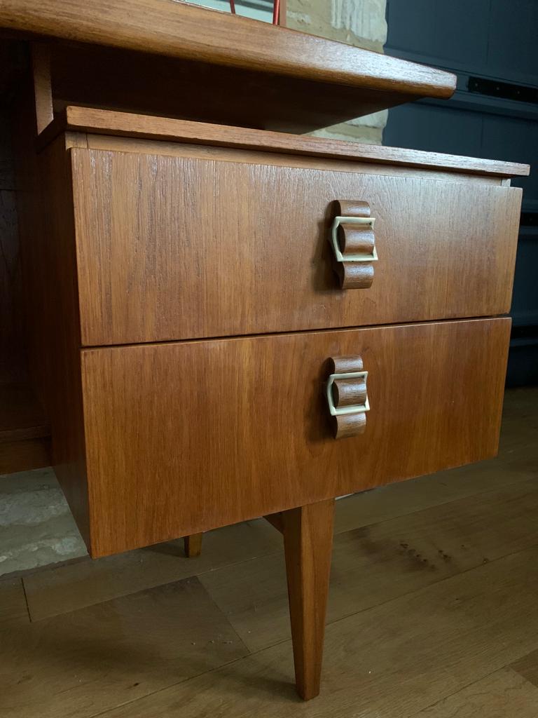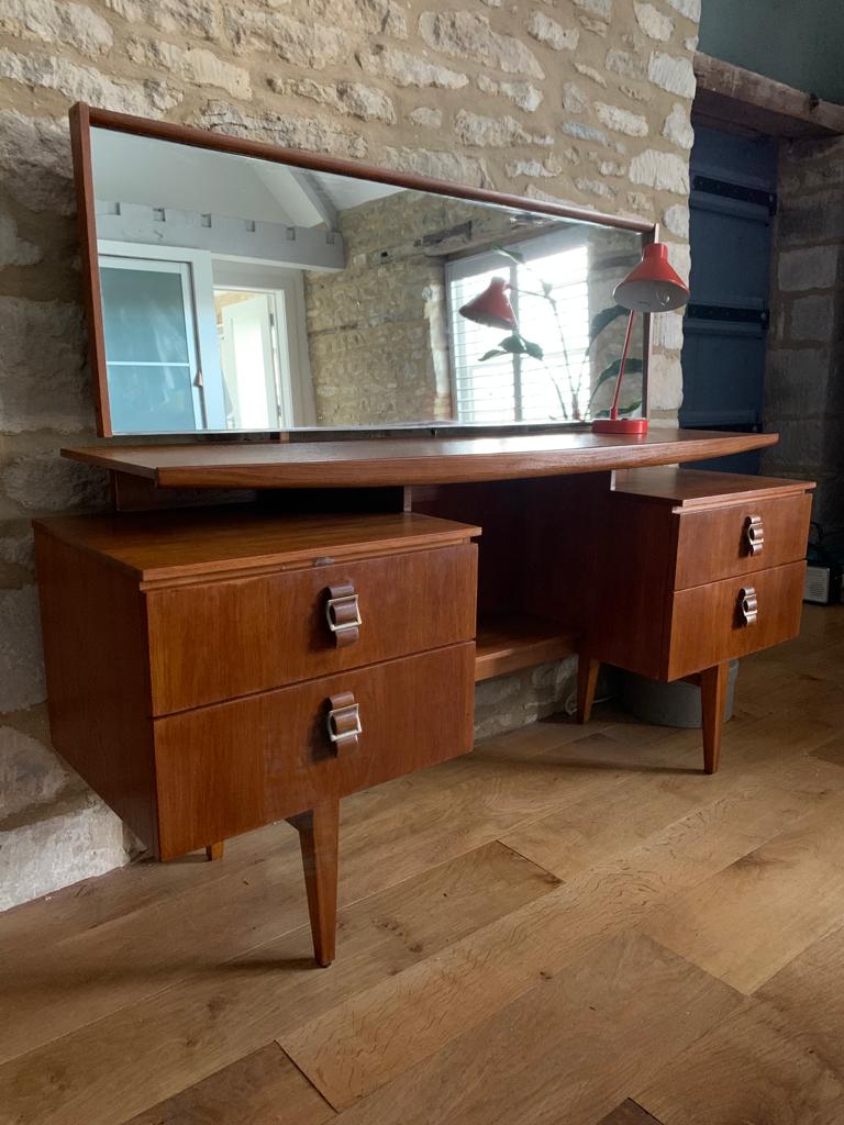 A stunning example of mid century design, this beautiful teak mid century dressing table with extra large mirror is in excellent refurbished condition. We rescued a very tired dressing table and refurbished it – sanding it down and revarnishing it for a sleek contemporary finish. It is very similar to the popular G Plan Fresco dressing table with floating shelf, but more unique due to its unusual teak and brass buckle style handles on the drawers. The unit features four deep drawers, a central shelf and the full length ‘floating’ shelf and tiltable mirror.