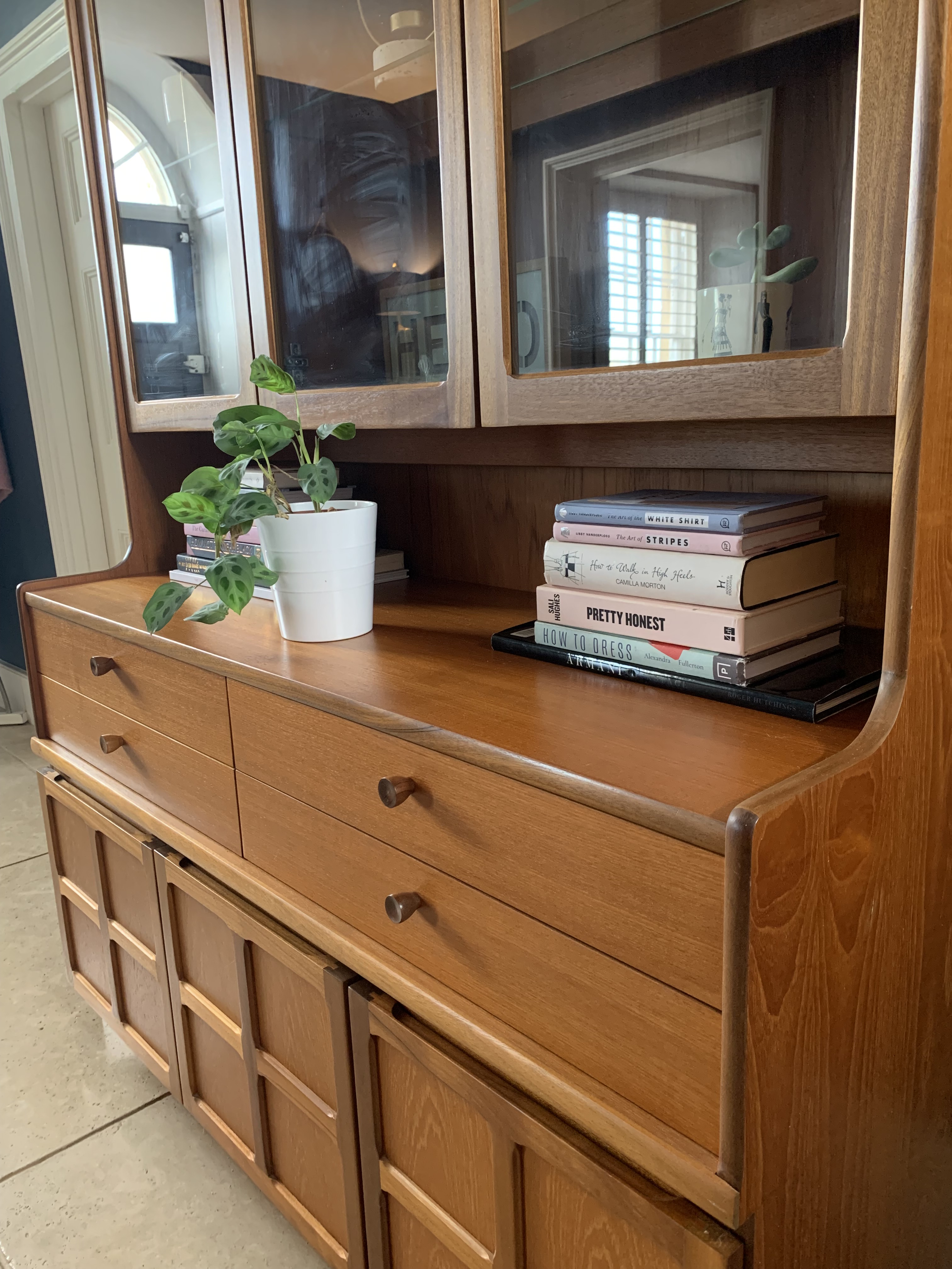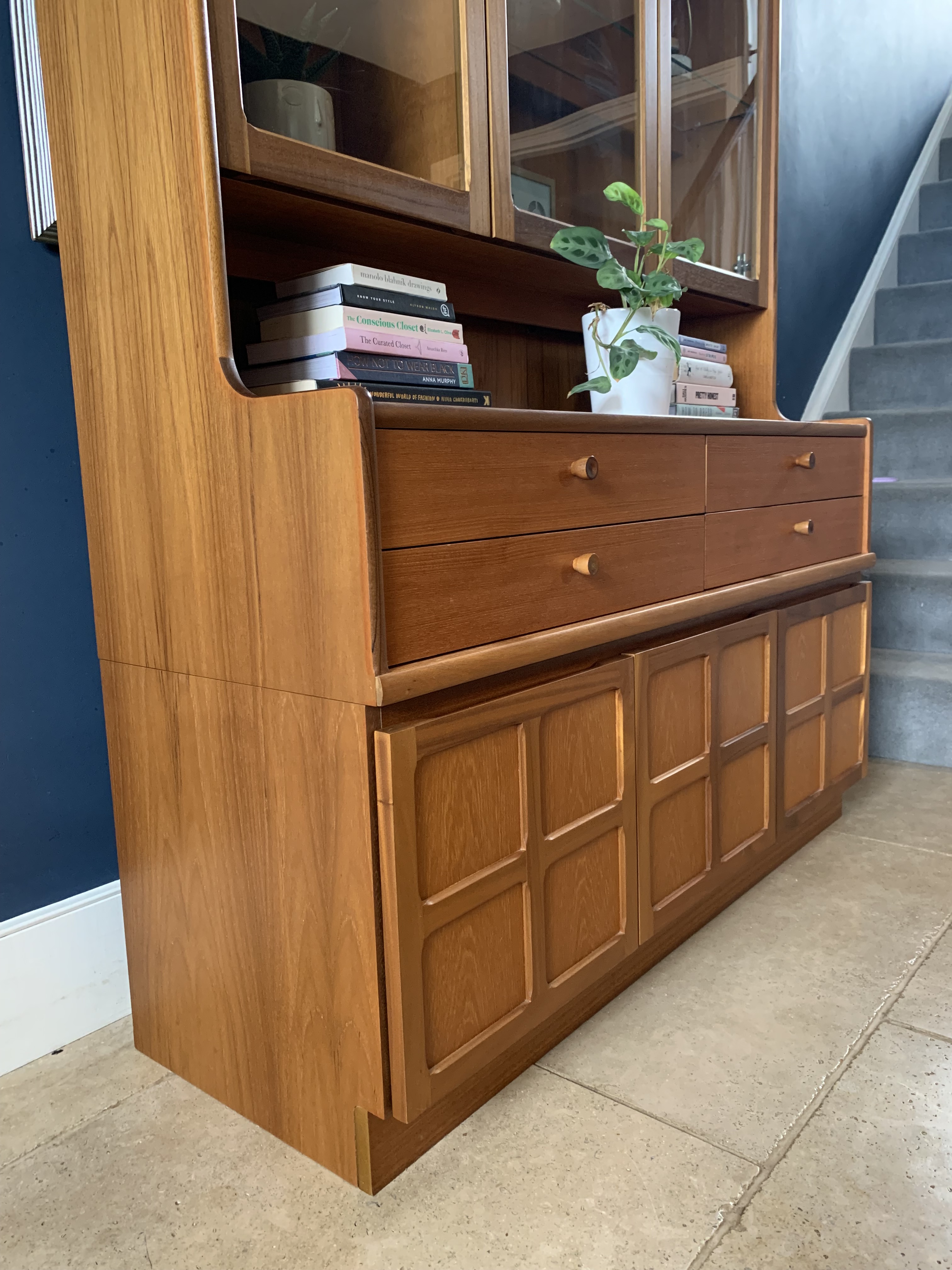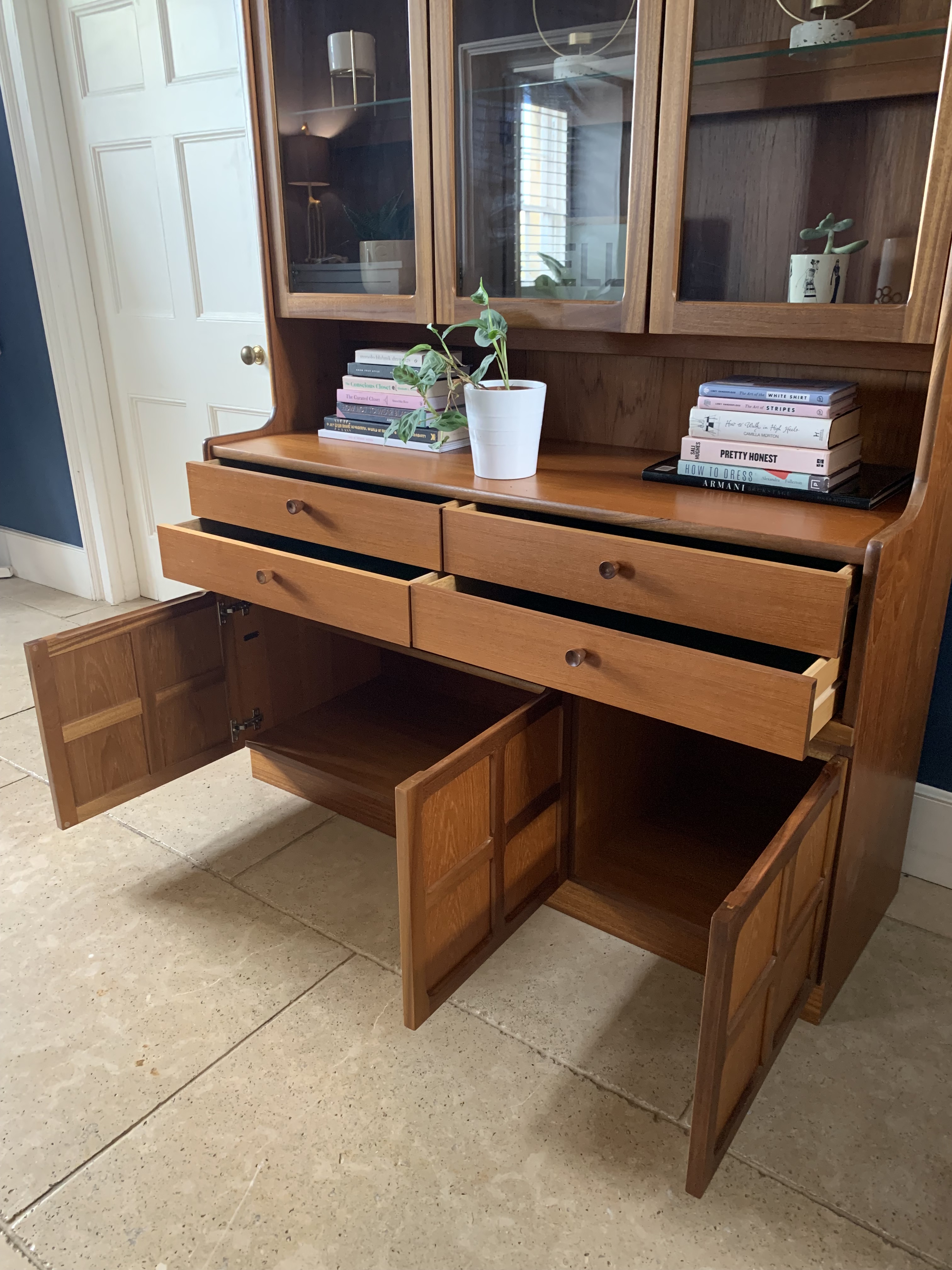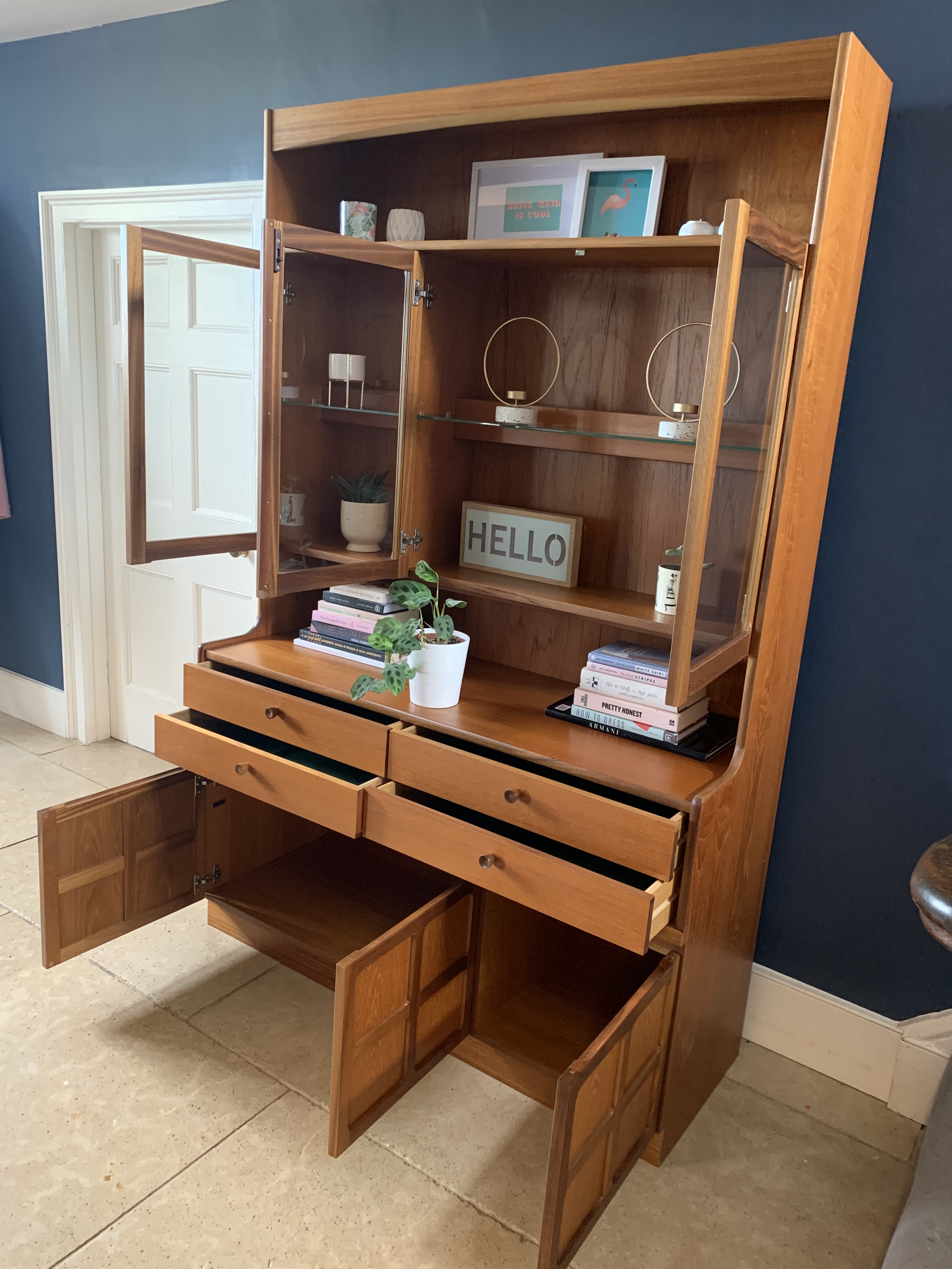 Immaculate condition inside and out, this teak sideboard and display unit is a stunning piece from the Nathan Squares collection by Parker Knoll (1970s). Features huge amounts of storage – 3 large cupboards, 4 velvet lined drawers, a glass fronted display unit with doors and glass interior shelf plus a long top shelf section. The teak wood has been cleaned and polished and both wood and glass are like new. With makers mark. All original electric wirings are present for interior lights but currently not working. Top half of unit comes apart for transportation.