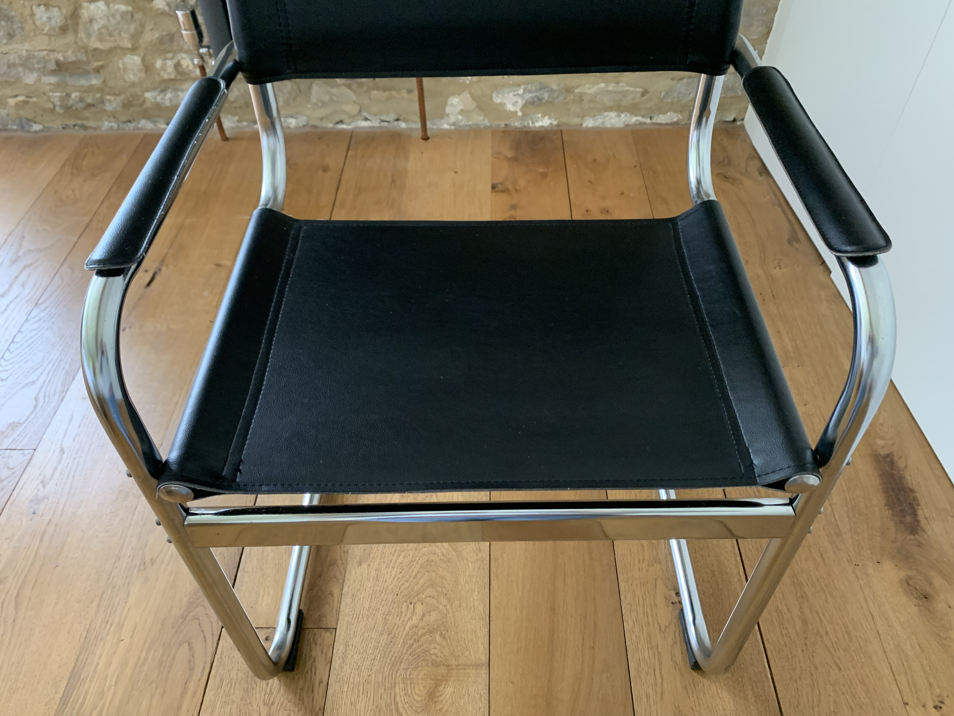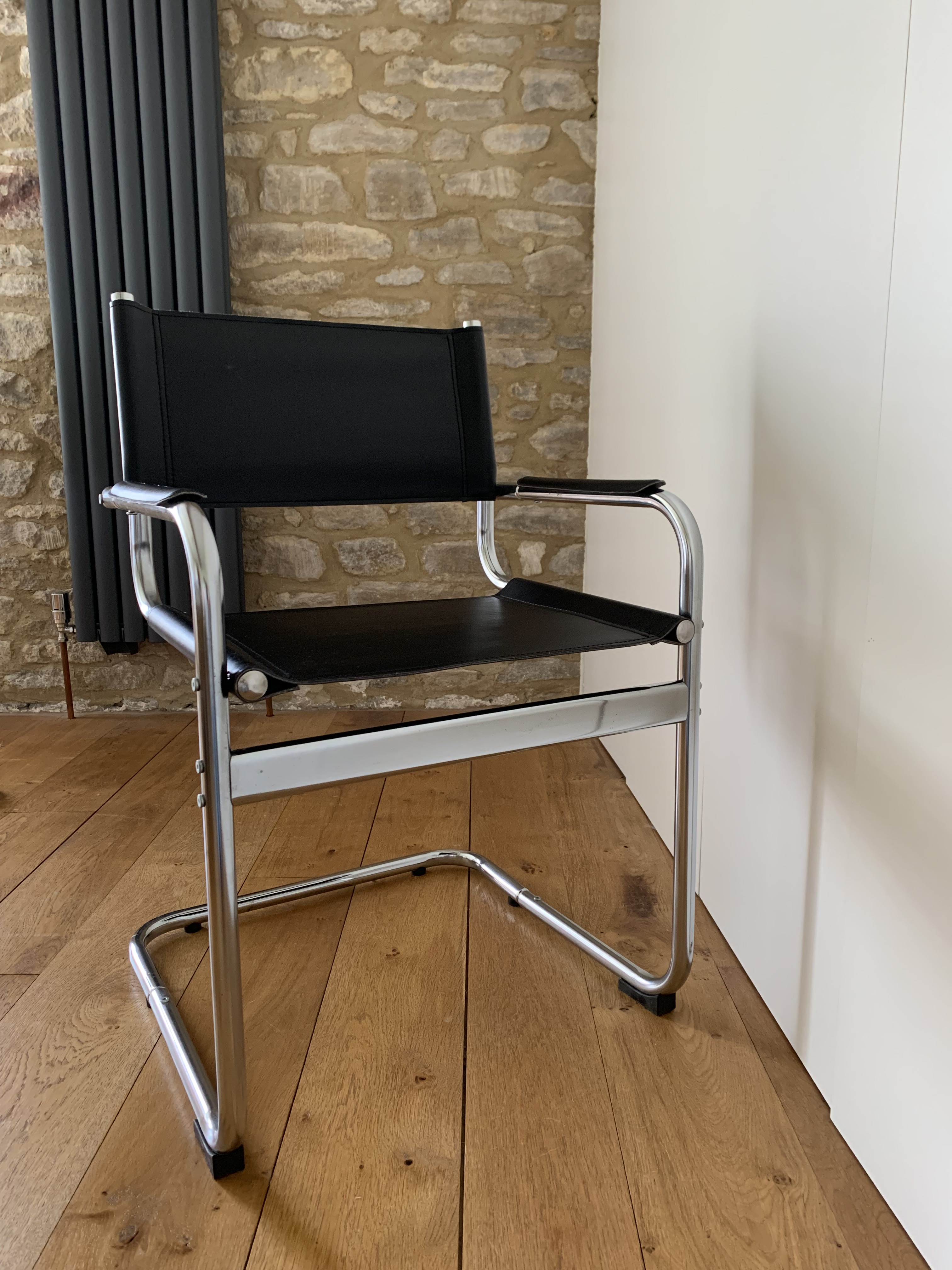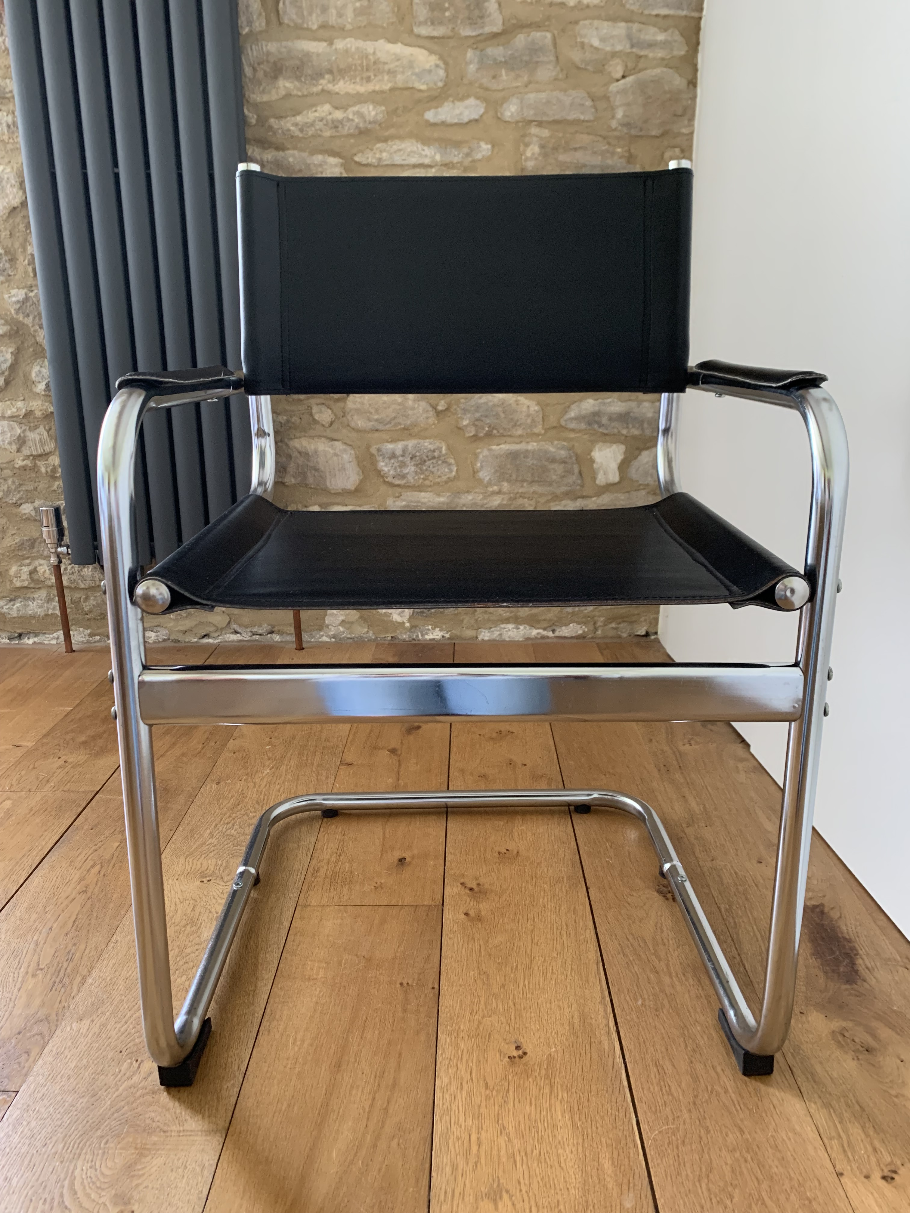 This pair of late mid century iconic Bauhaus / Mart Stam style chairs feature tubular chrome frames and black leatherette seats, backs and arm rests. We don’t know the manufacturer, but these cantilever chairs were likely produced in the UK in the 1980s. Today they would add a very cool slice of late mid century style to your study, an office, living room or dining room. Price £170