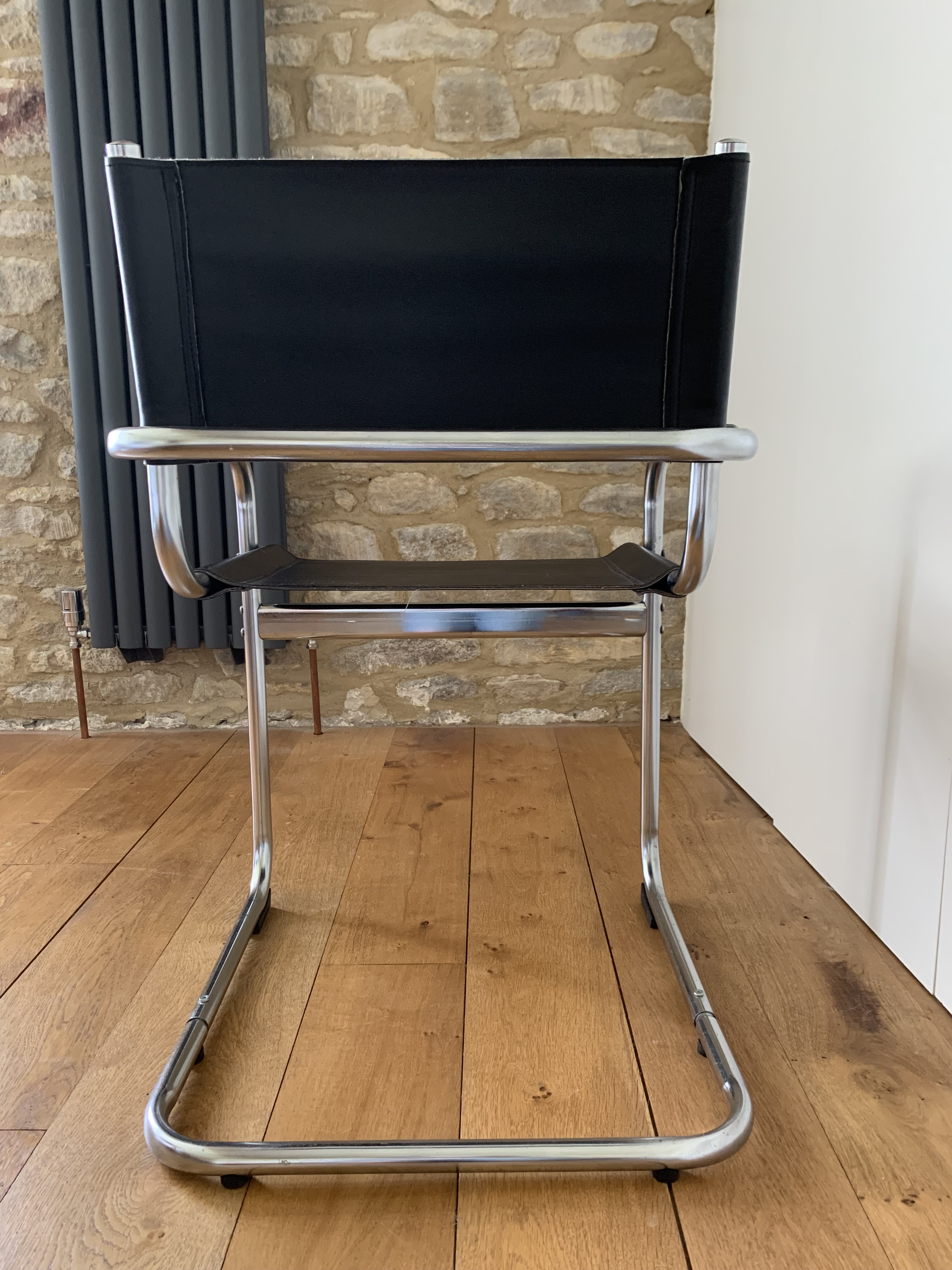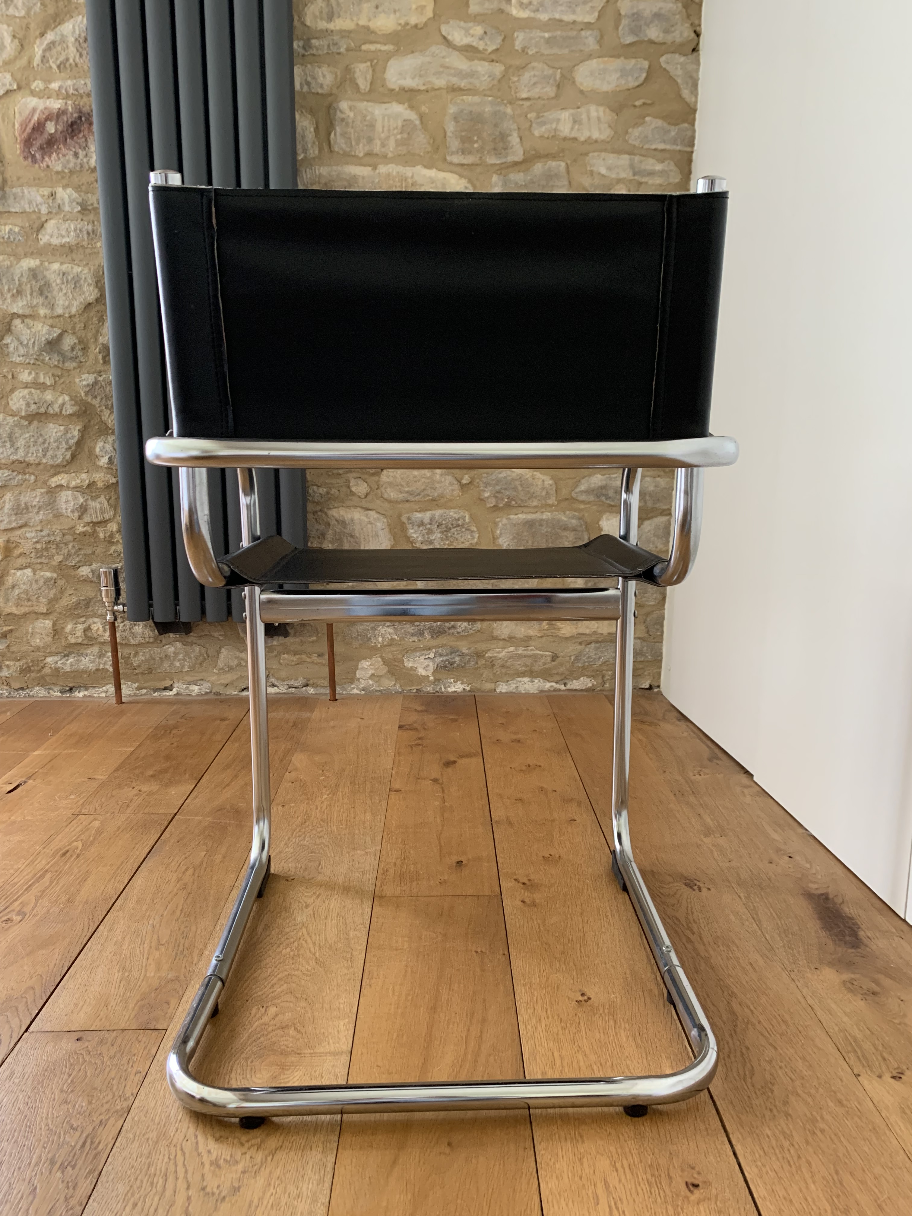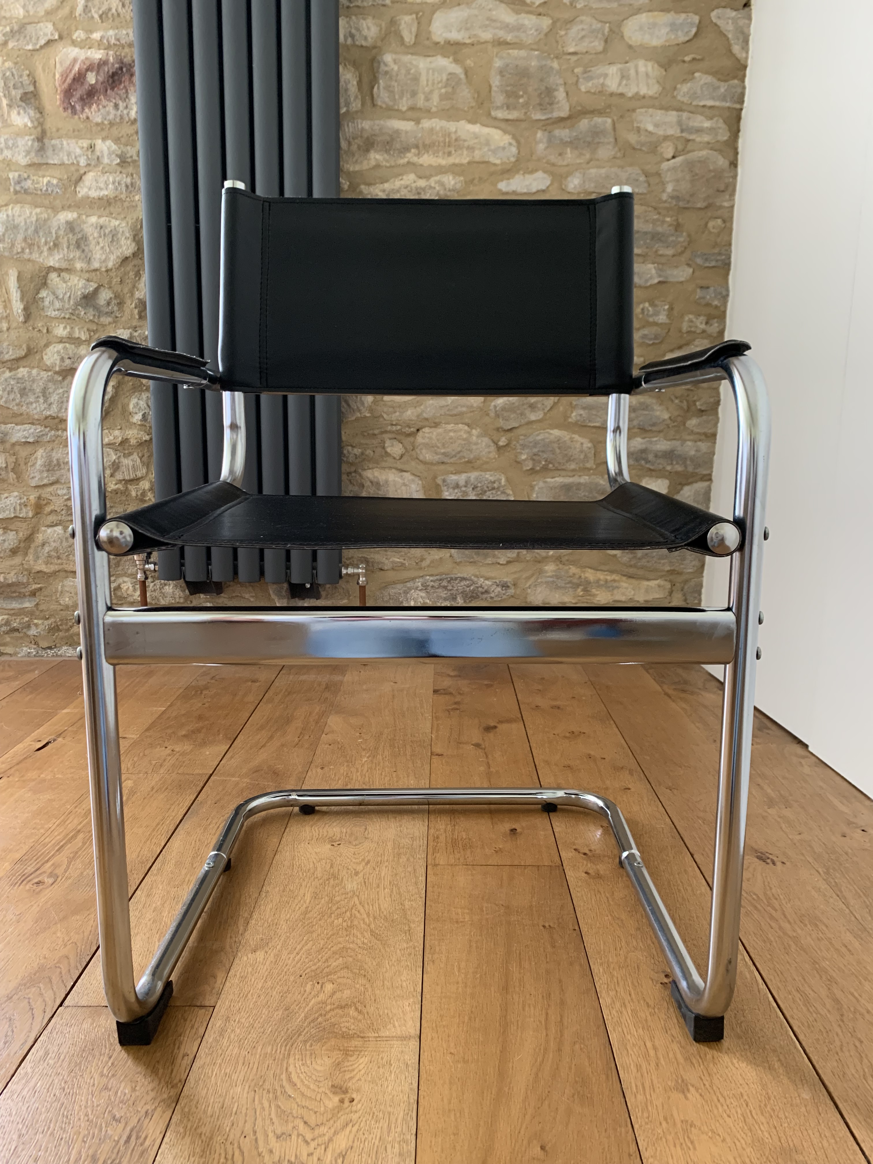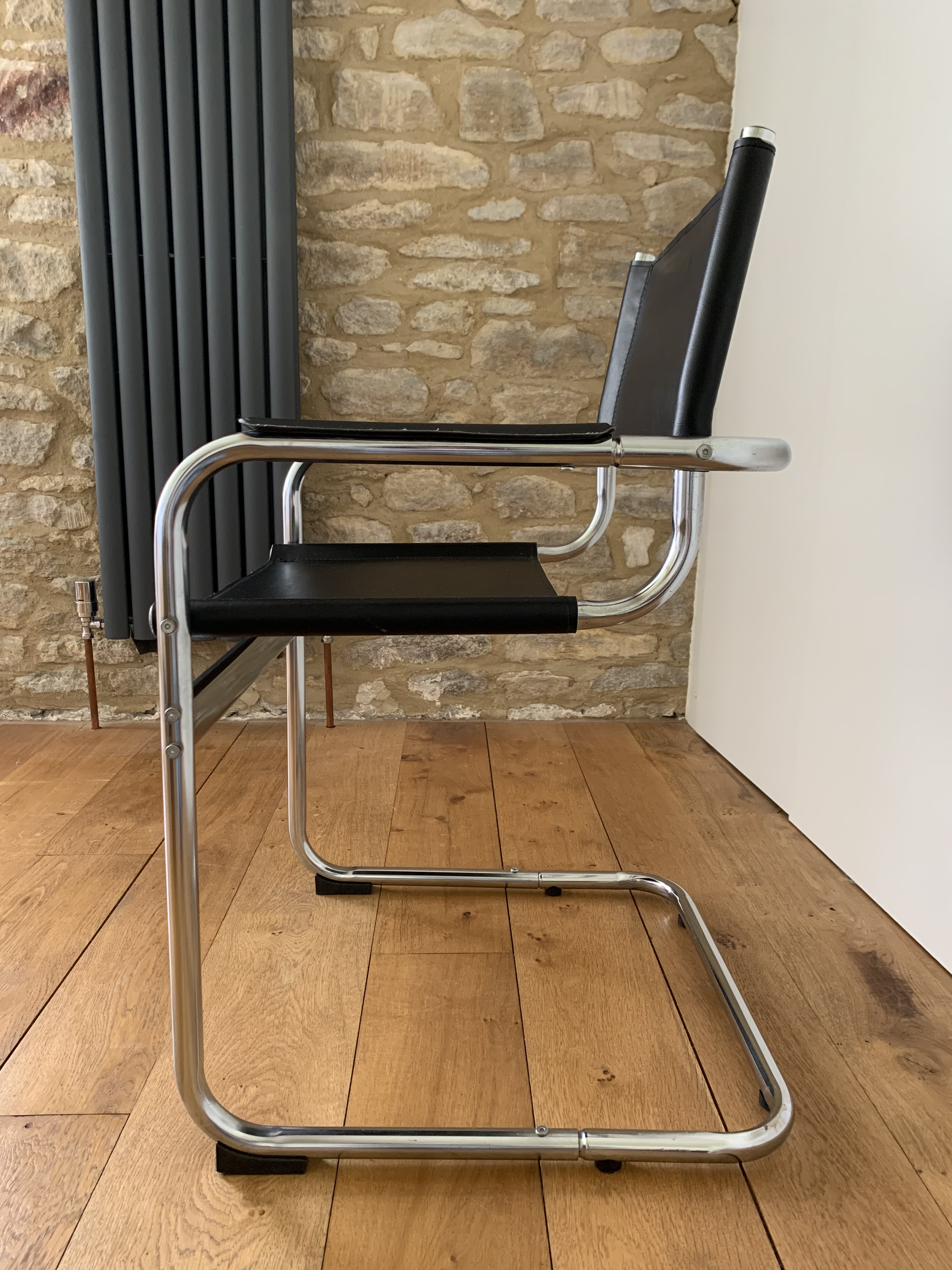 This pair of late mid century iconic Bauhaus / Mart Stam style chairs feature tubular chrome frames and black leatherette seats, backs and arm rests. We don’t know the manufacturer, but these cantilever chairs were likely produced in the UK in the 1980s. Today they would add a very cool slice of late mid century style to your study, an office, living room or dining room. Price £170