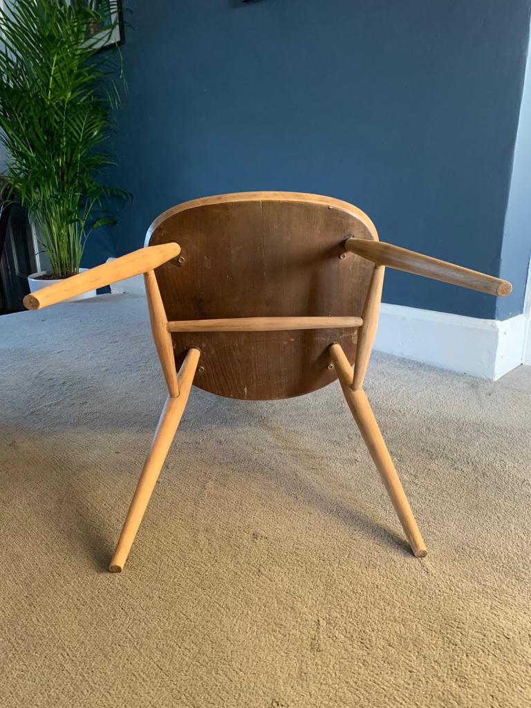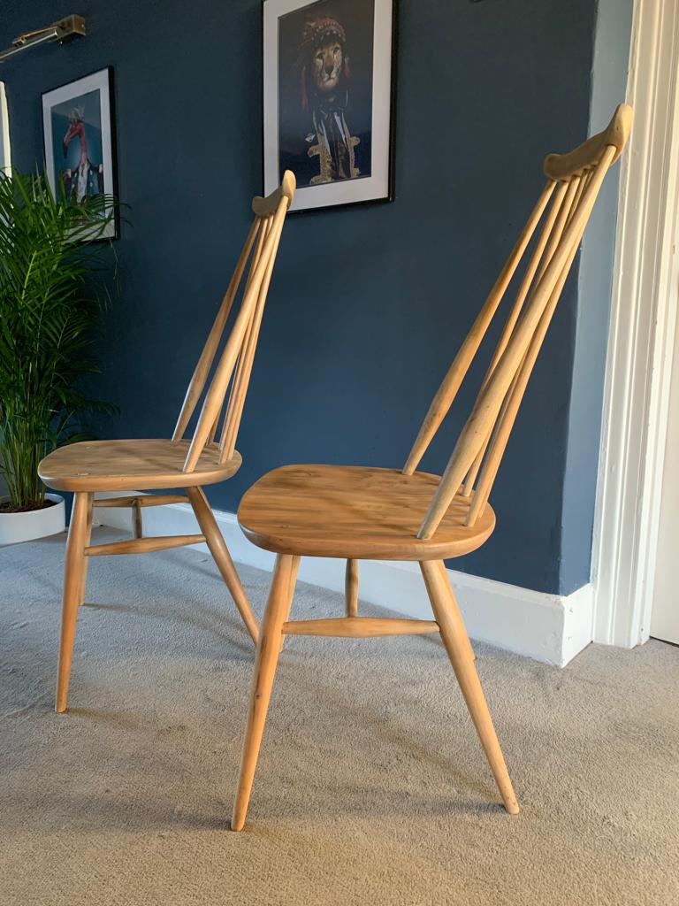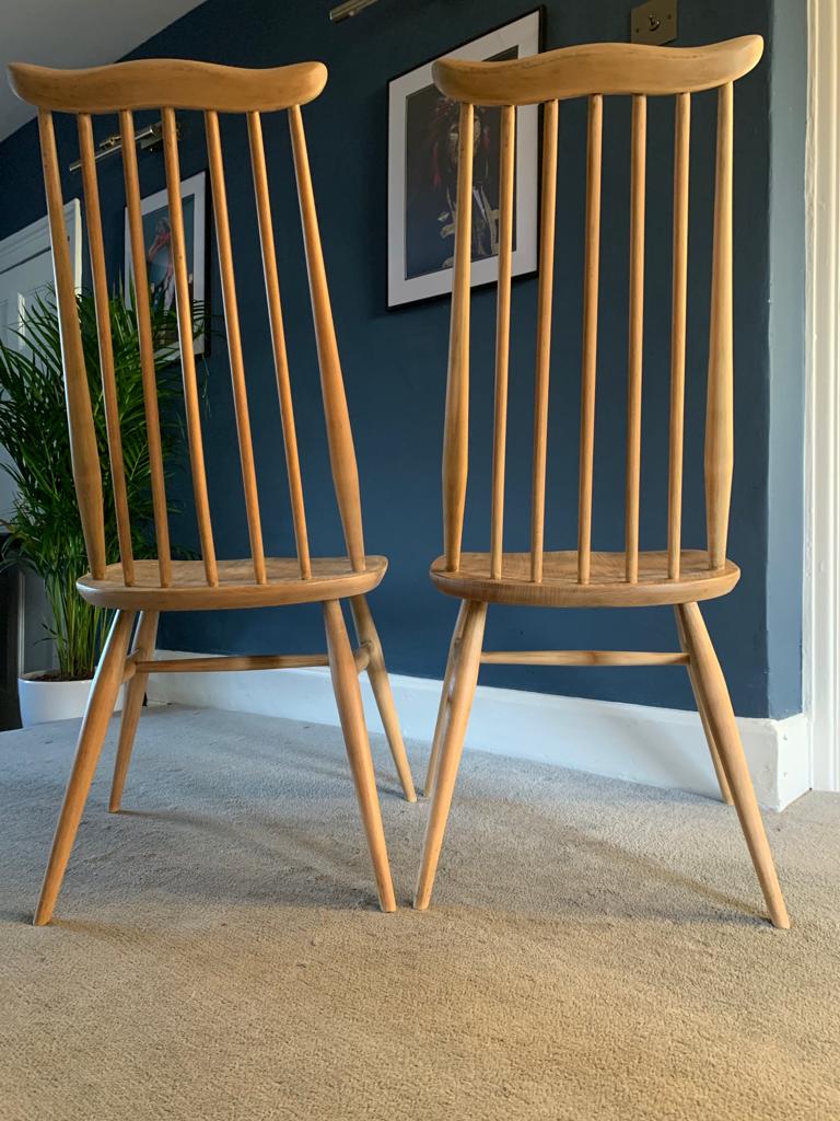 We have lovingly restored this pair of vintage 1960s Ercol Windsor Goldsmith Dining Chairs (model 369) designed by Lucian Ercolani – sanding them down and then adding a top layer of natural varnish to show off the beautiful natural depth of grain of the wood and to give them a new lease of life for the modern home. The seats are made from solid English elm and the legs and chair backs beech. Both chairs are solid and structurally sound with no damage and no repairs. They feature the 1960 British Standard Kite Mark on the underside, the classic Ercol Windsor wedge-through-seat joints on the top side of the seats and the original cushion studs on the underside. SOLD