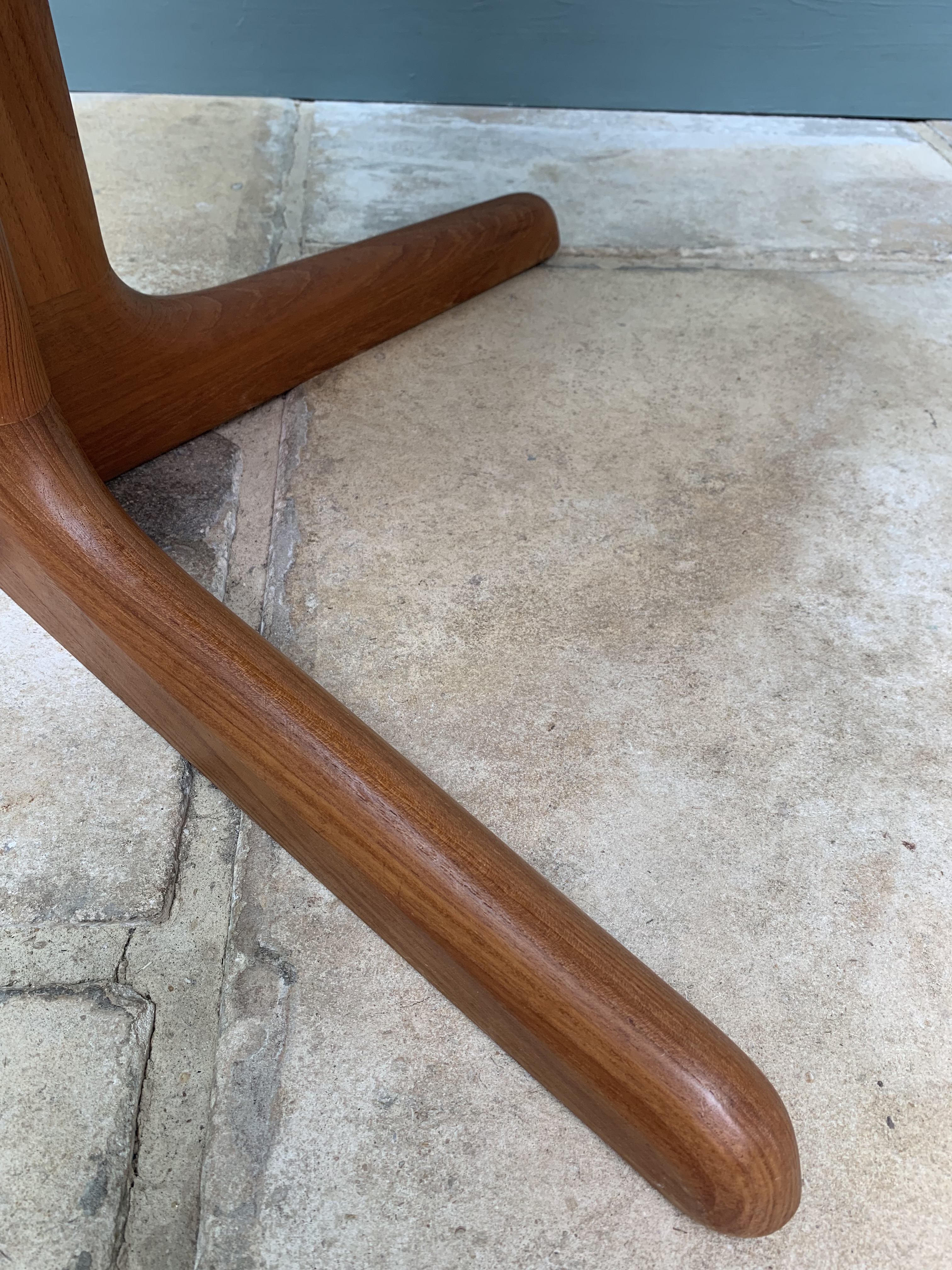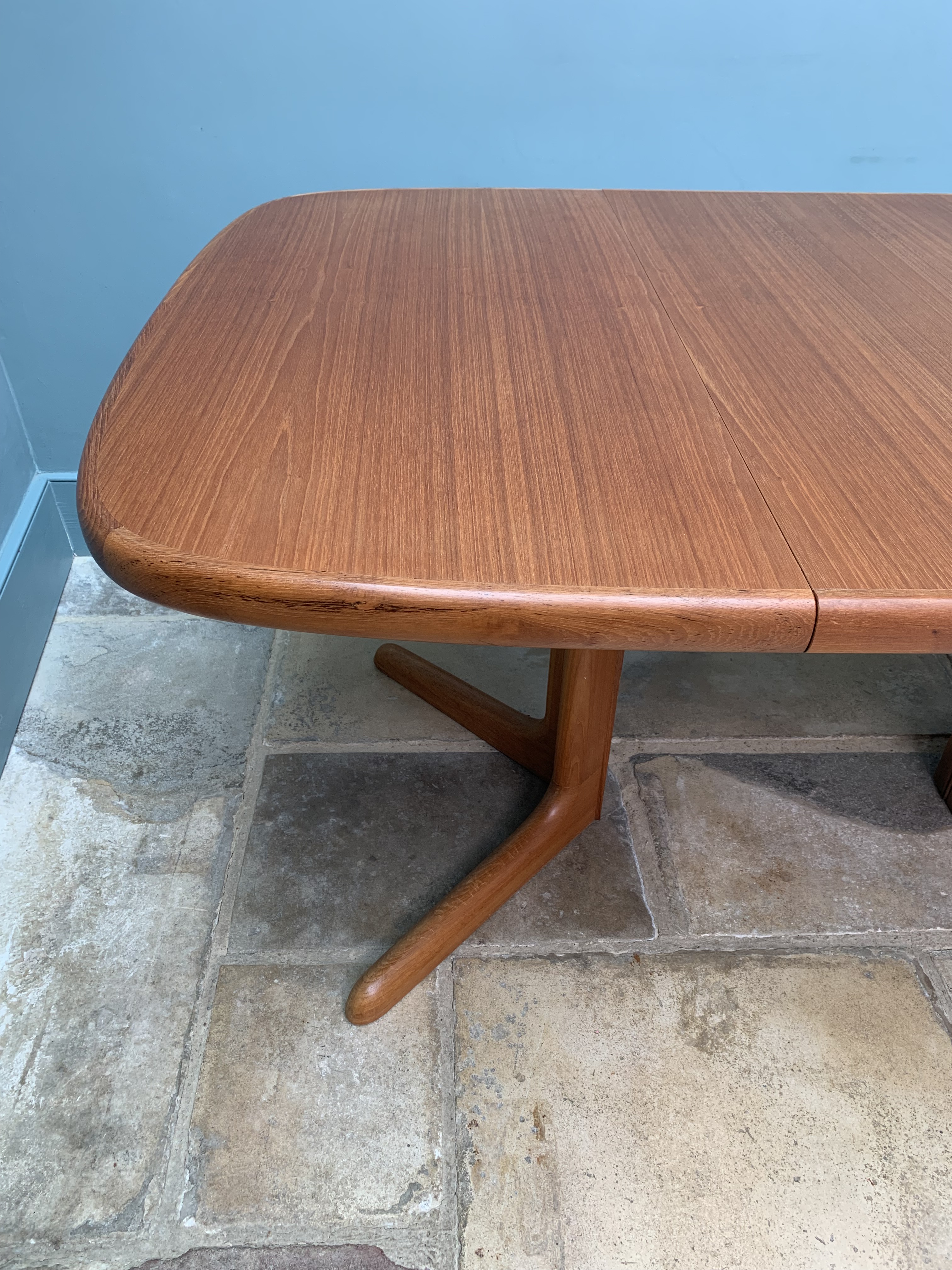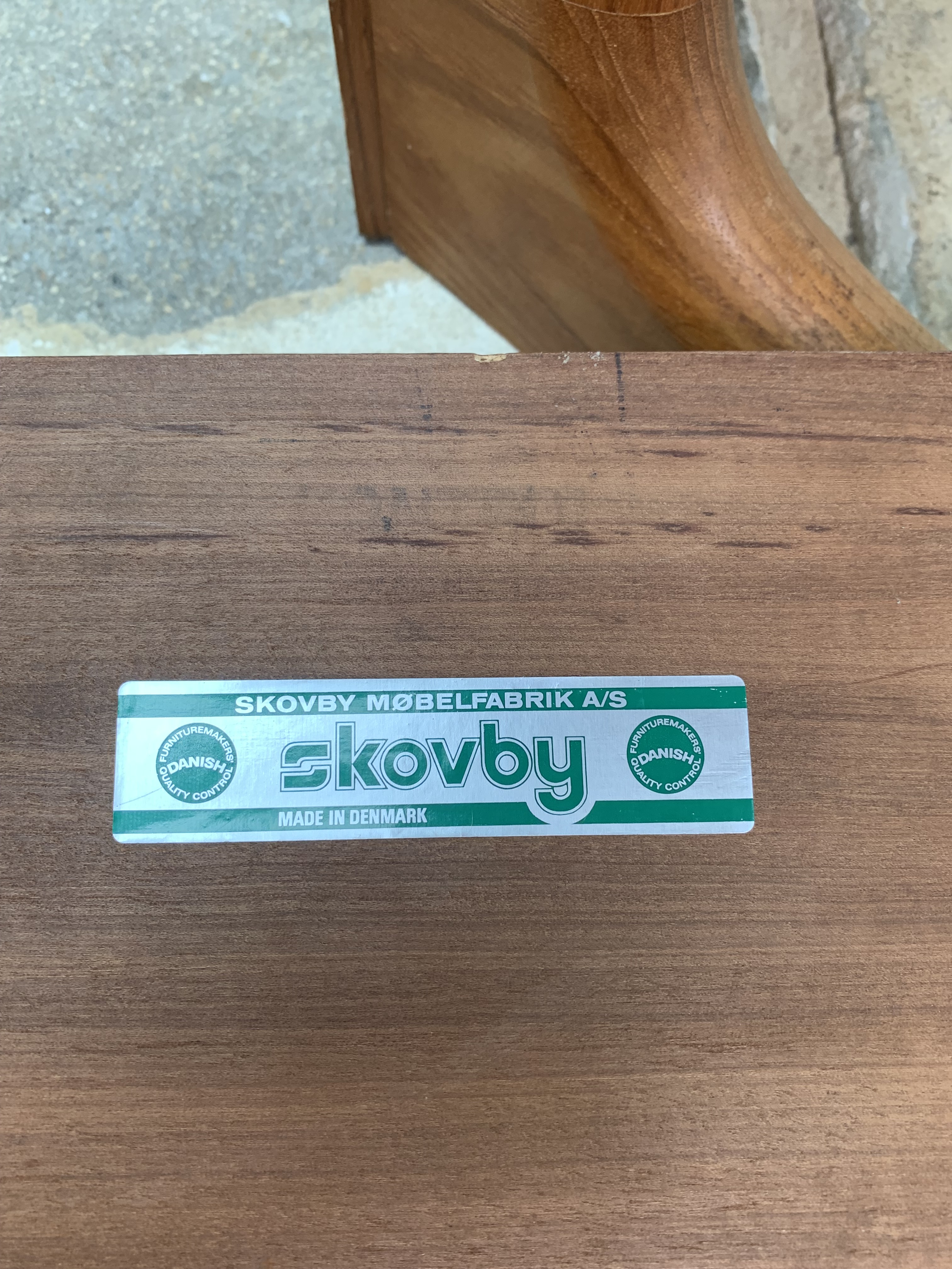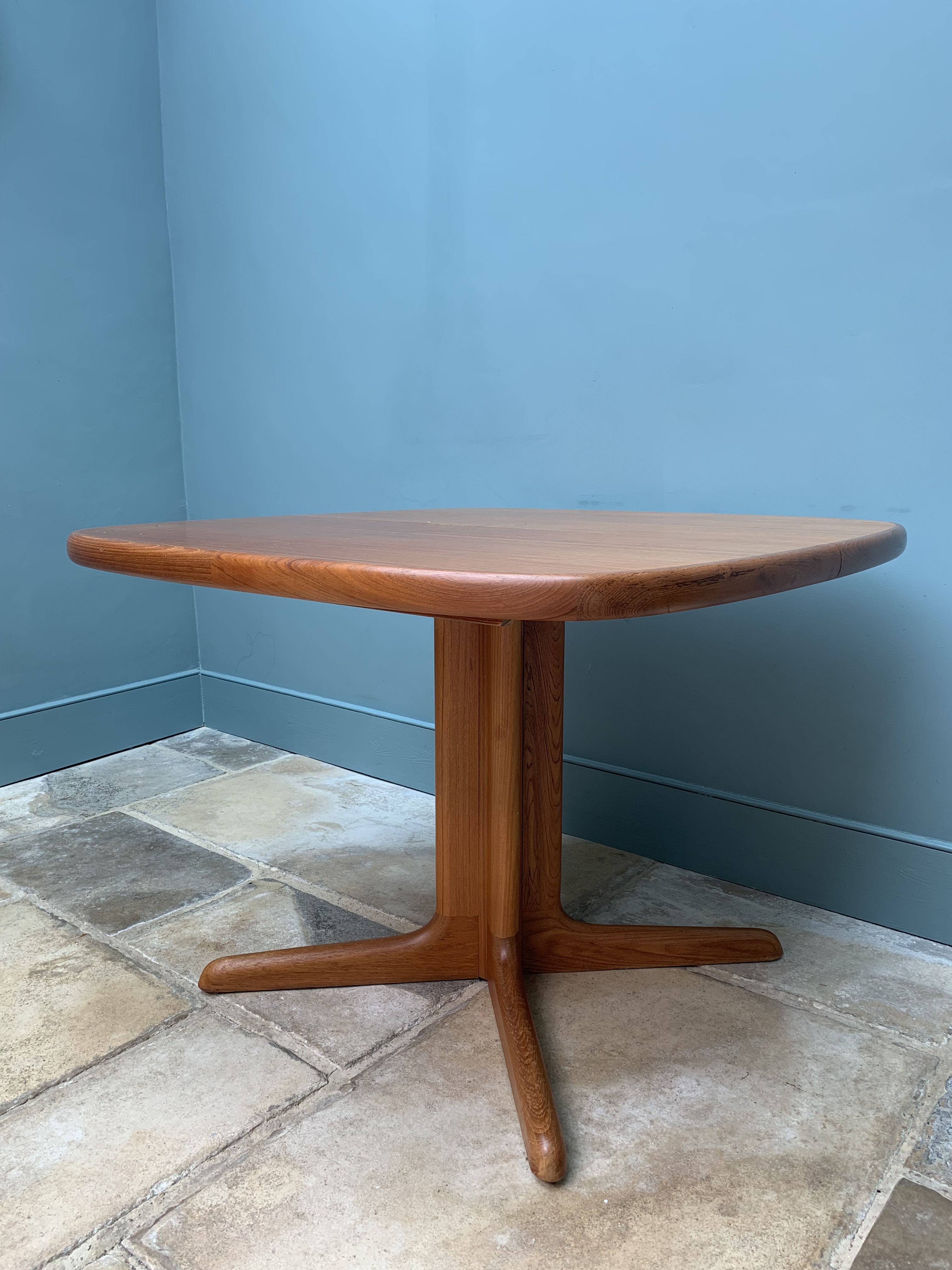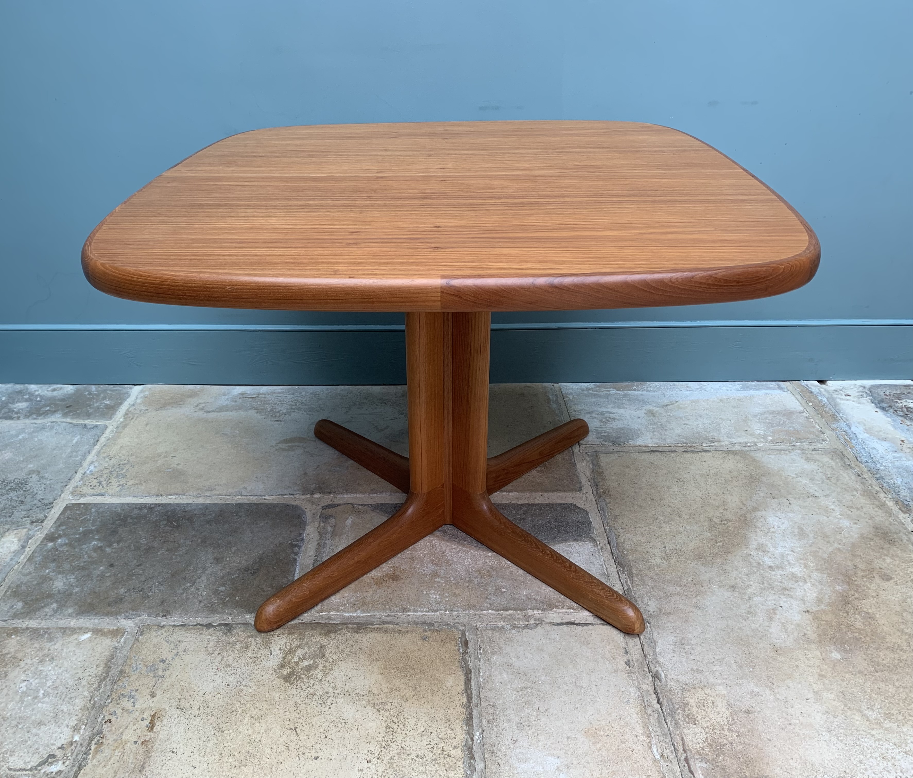 This handsome and unique shaped mid century dining table was designed and manufactured by Danish furniture makers Skovby during the 1960s. It has been beautifully crafted from teak wood and features the iconic and ever so stylish angled feet. This vintage dining table is ideal for the modern home, as when not extended it is a very compact square size seating up to 4 people (see pictures) and when extended with a centre additional leaf, is a generous size to seat 8 family and friends (dimensions listed below). The table is in superb condition for its age, with no damage and is structurally sound. We have kept the wood in its original condition and simply applied a layer of beeswax to enhance and protect it. It also features the Skovby makers mark on the underside. Price £1490