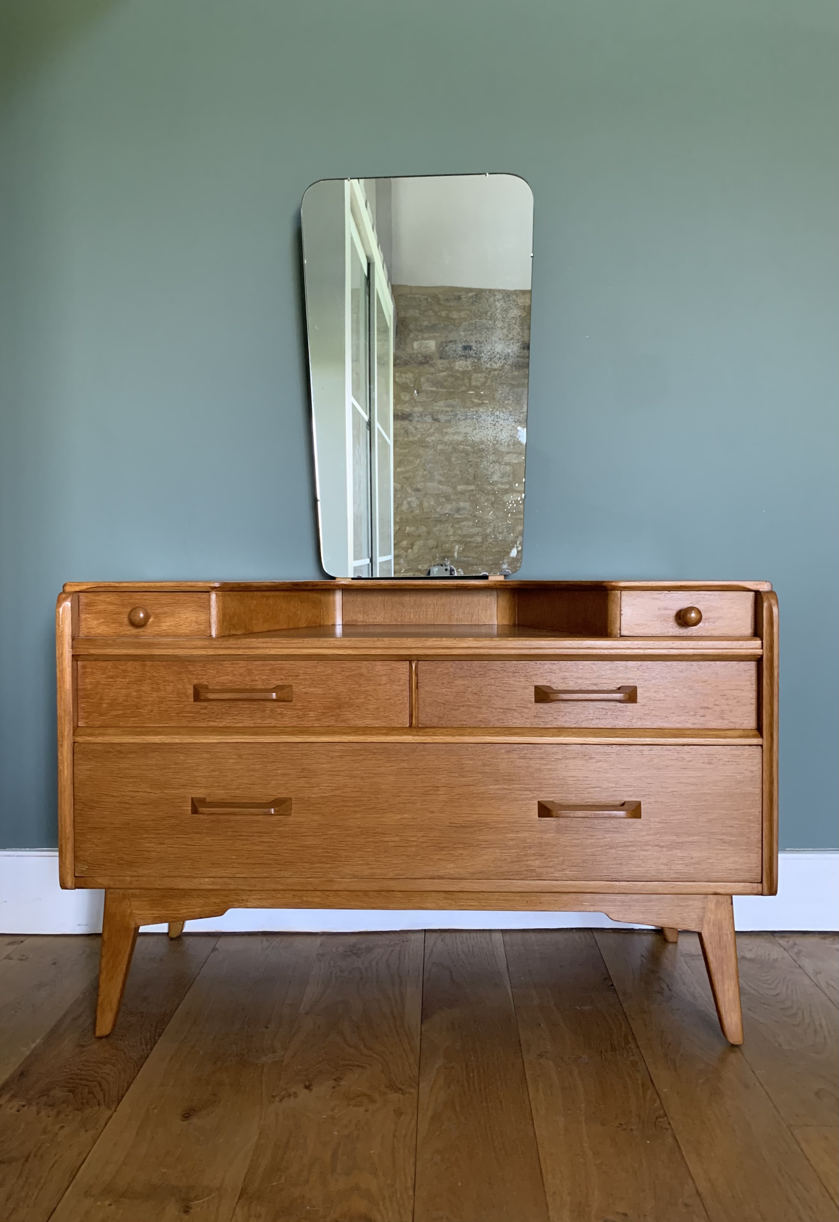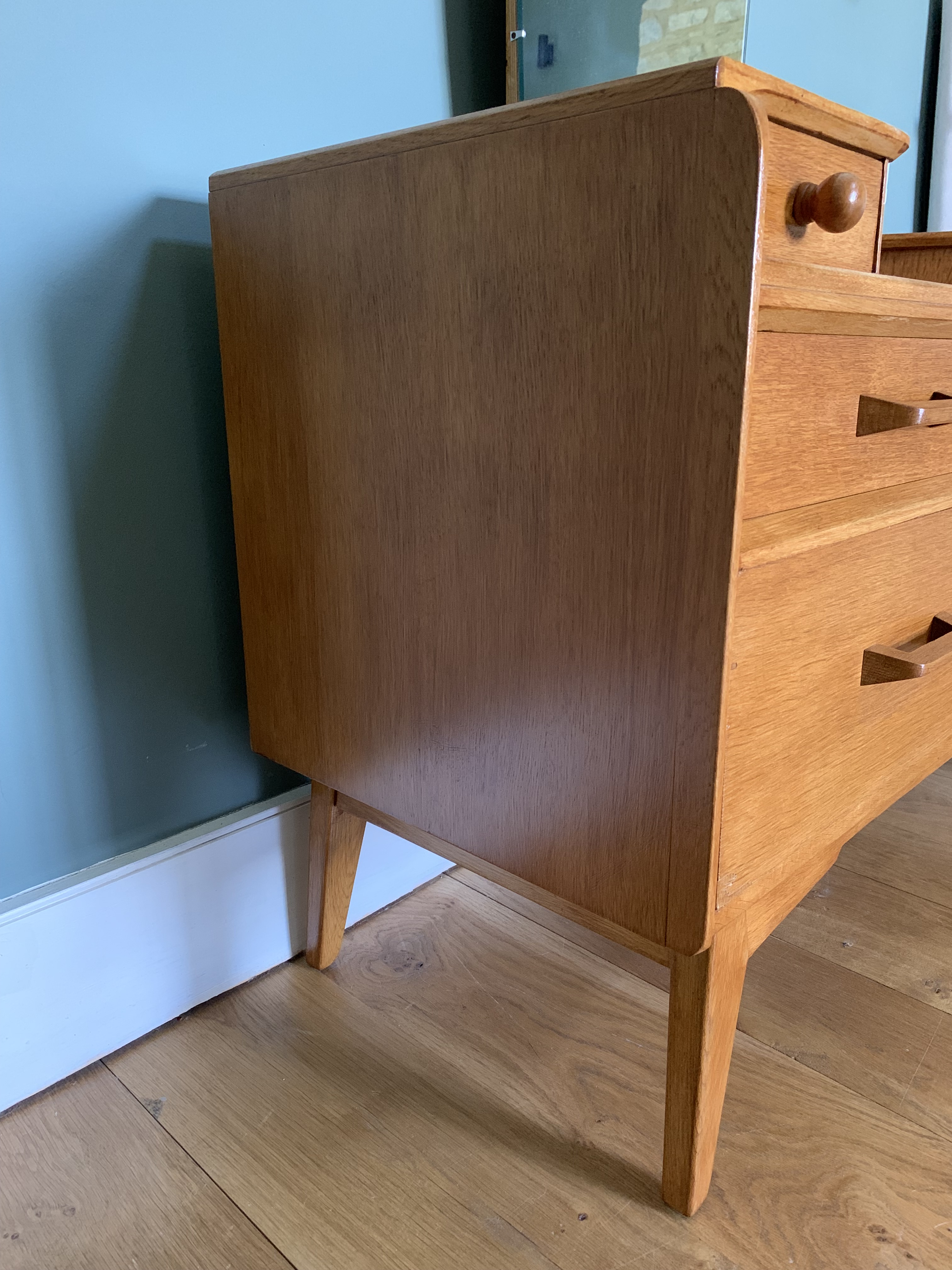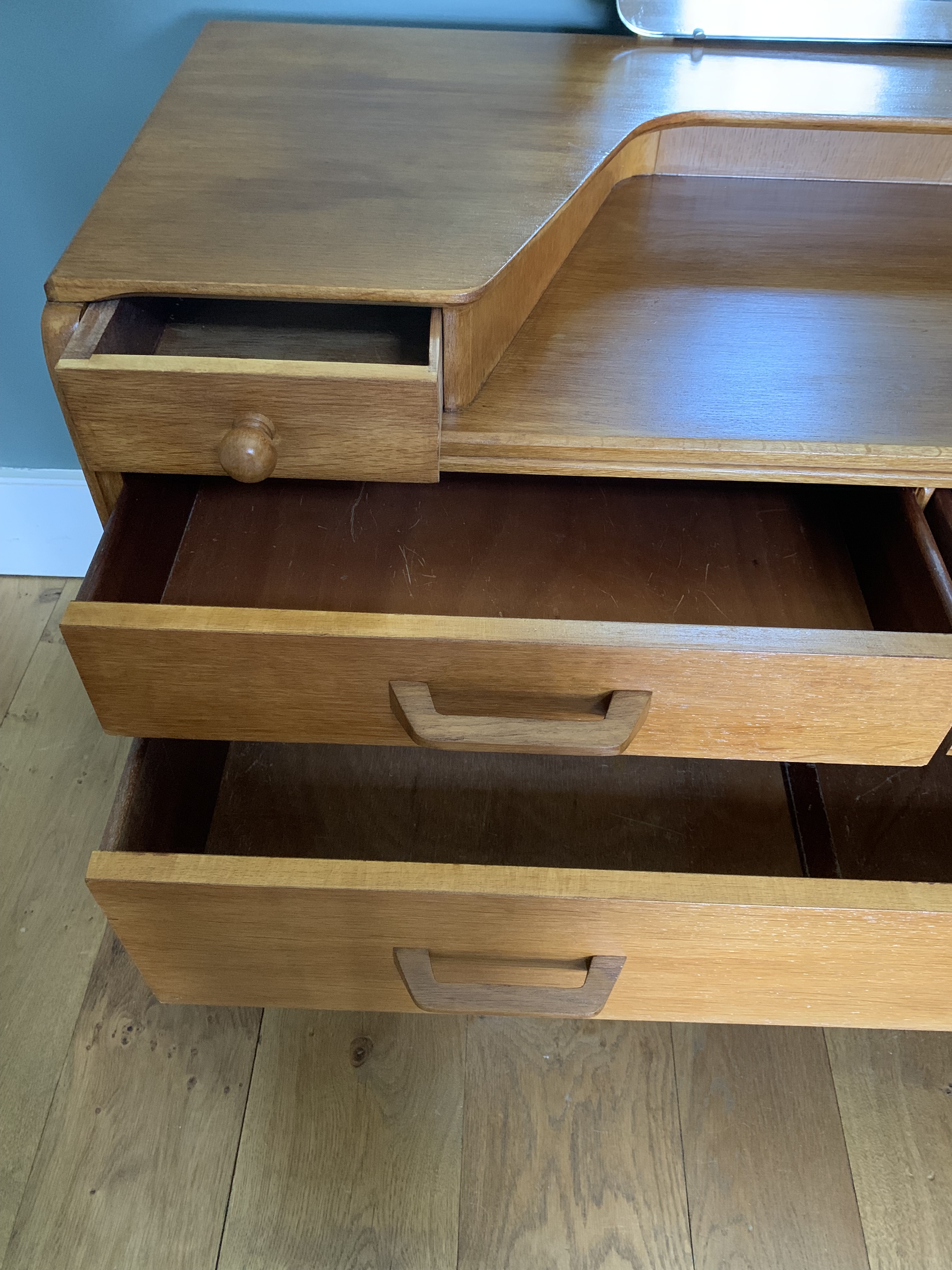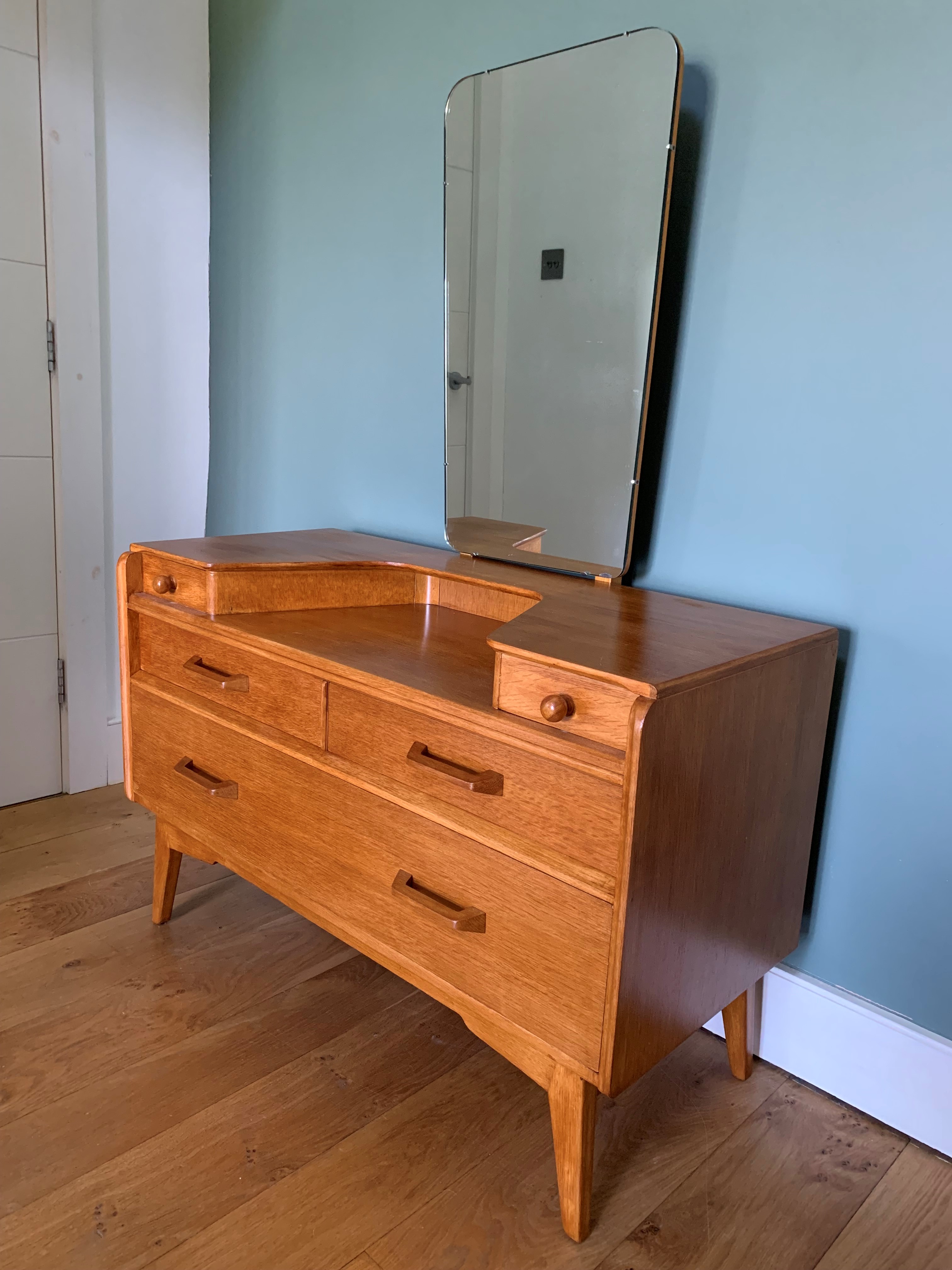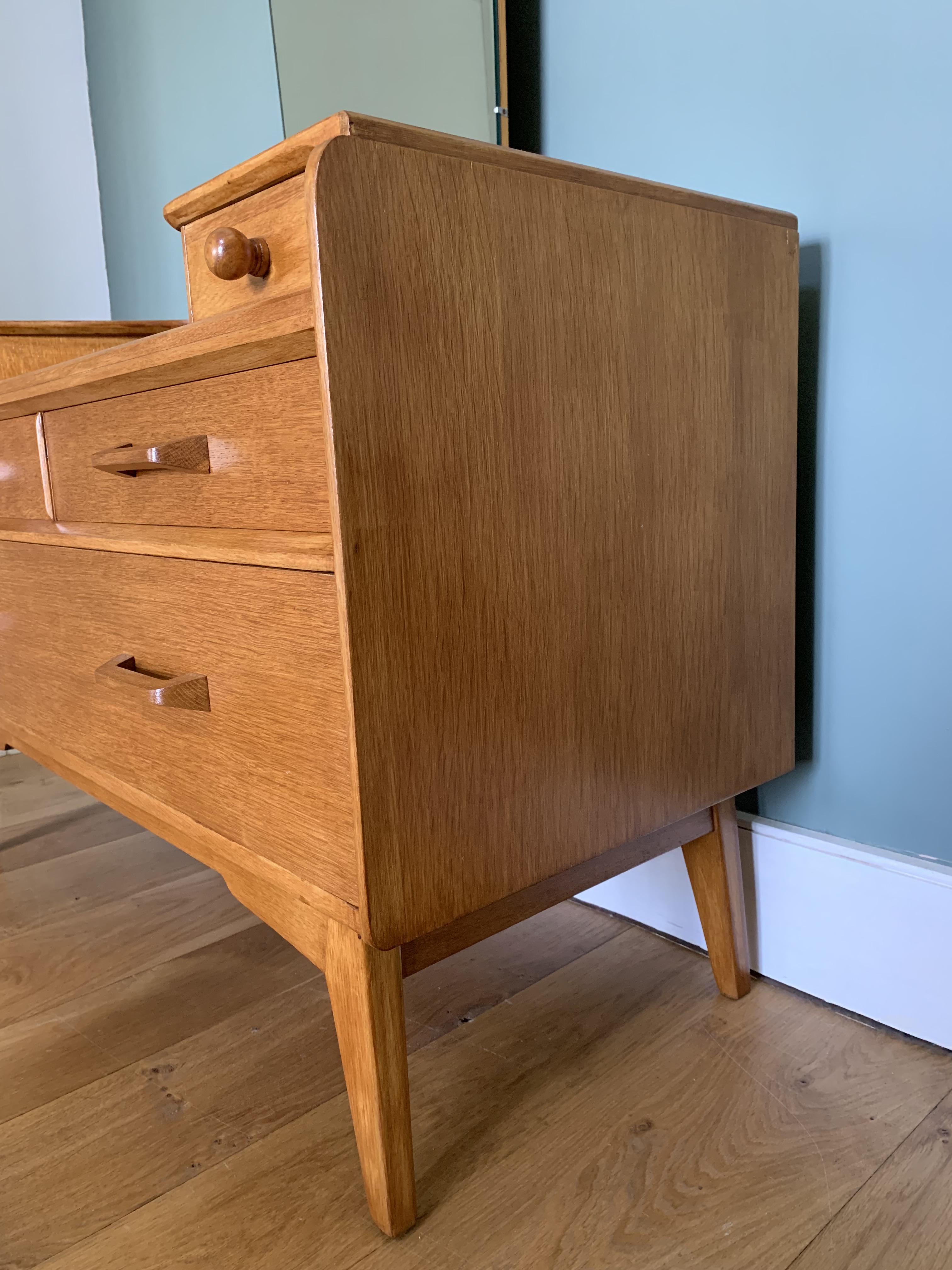 We have given this light oak vintage G Plan dressing table with detachable mirror a new lease of life for the modern home. This G Plan dressing table was cherished and beautifully cared for by one loving owner in Cheltenham, but when we acquired it, the wood looked a bit dull and tired, so we have sanded it down and re-varnished the entire unit with a lovely light yet rich varnish, for a sleek and chic finish. We have kept the mirror in its original condition with its lovely patina and natural mirror ageing, refurbished the wooden mirror attachments and replaced the two small drawer handles. There is a huge amount of storage space with one extra large bottom drawer, two large drawers above this and two small hinged drawers at the top which open fully on the diagonal. The dressing table also features the G Plan makers mark. This mid century dressing table is from the G Plan Brandon range and dates back to 1950s and we can’t wait for it to find its new modern home. SOLD