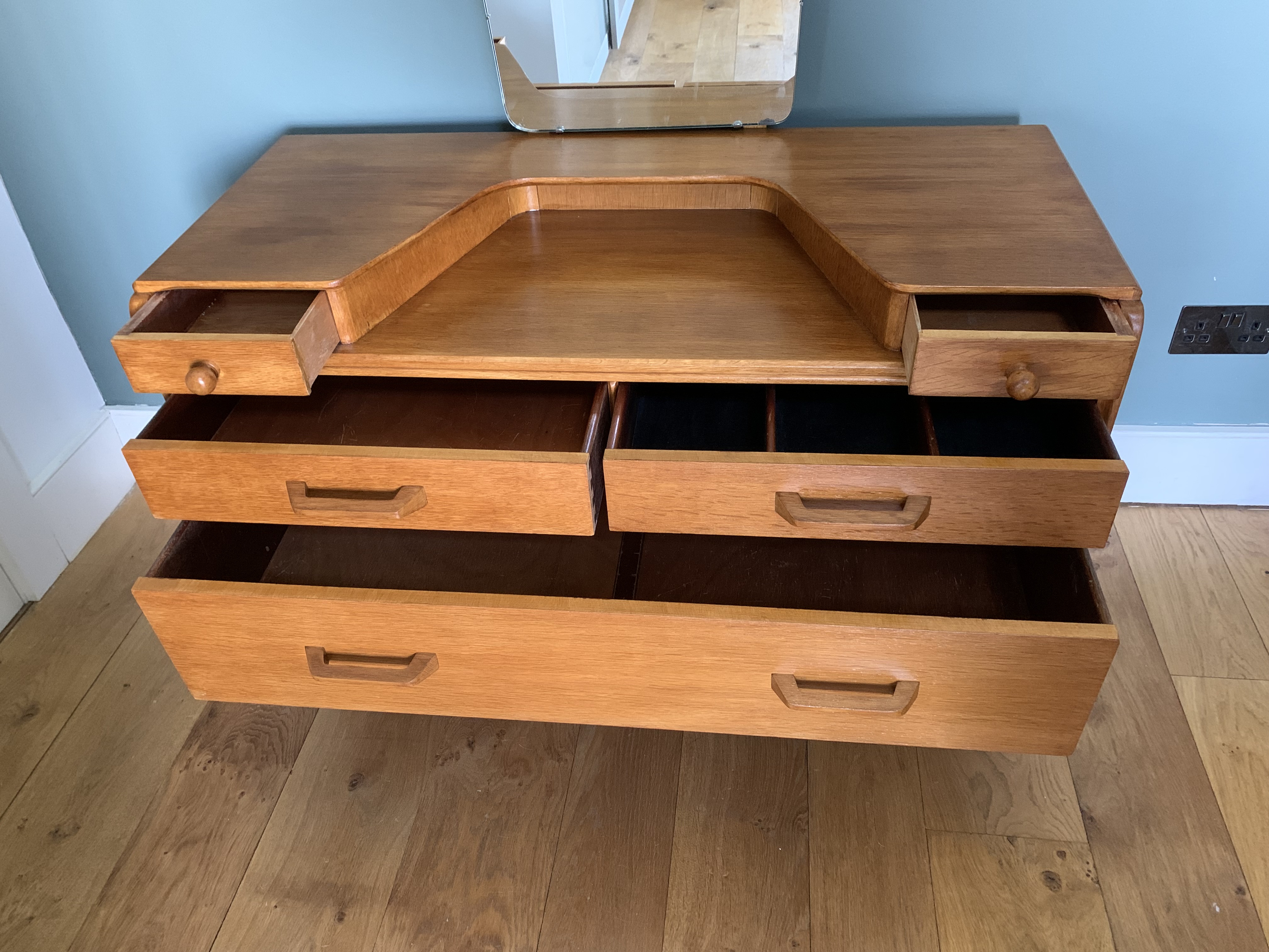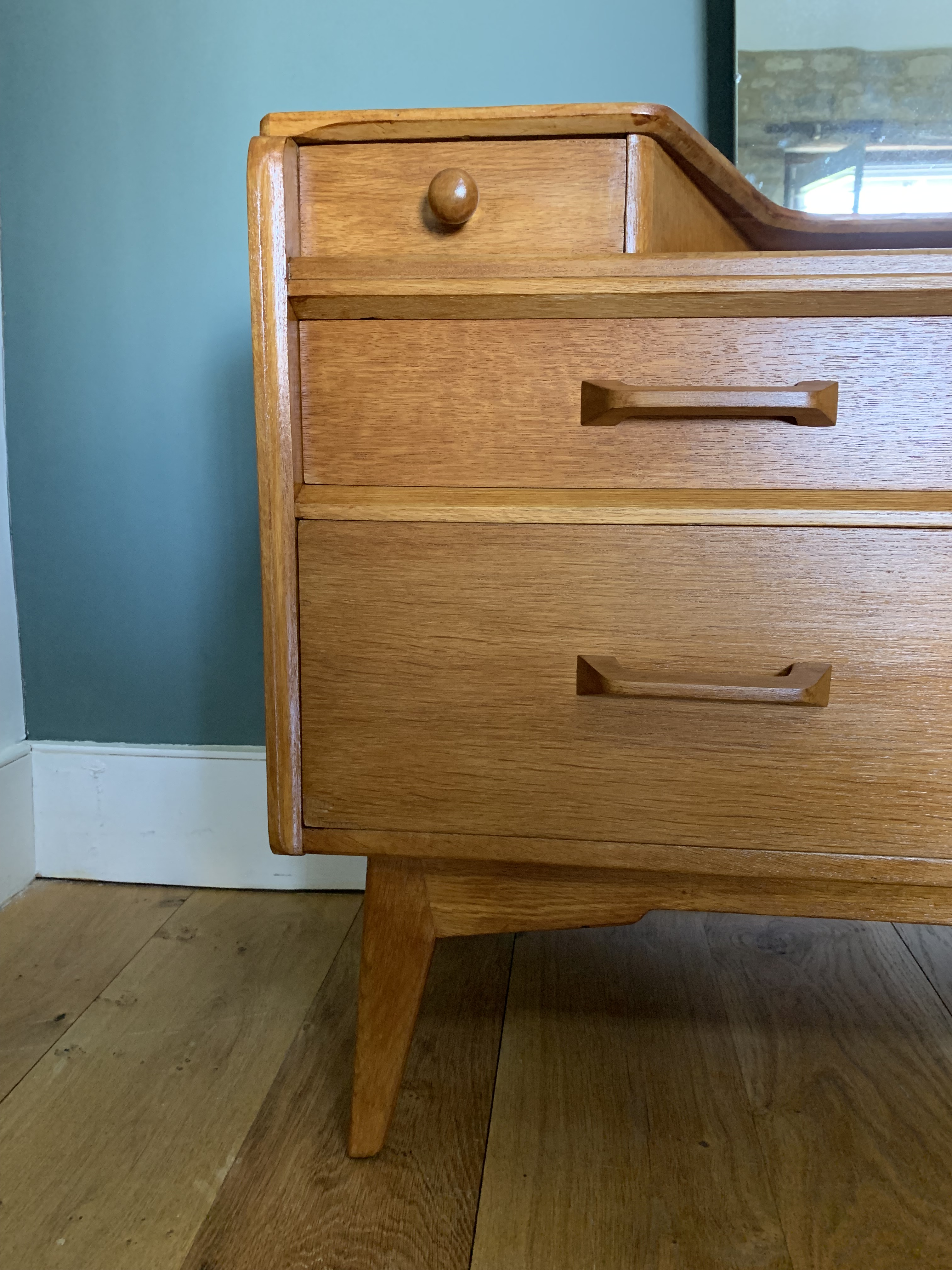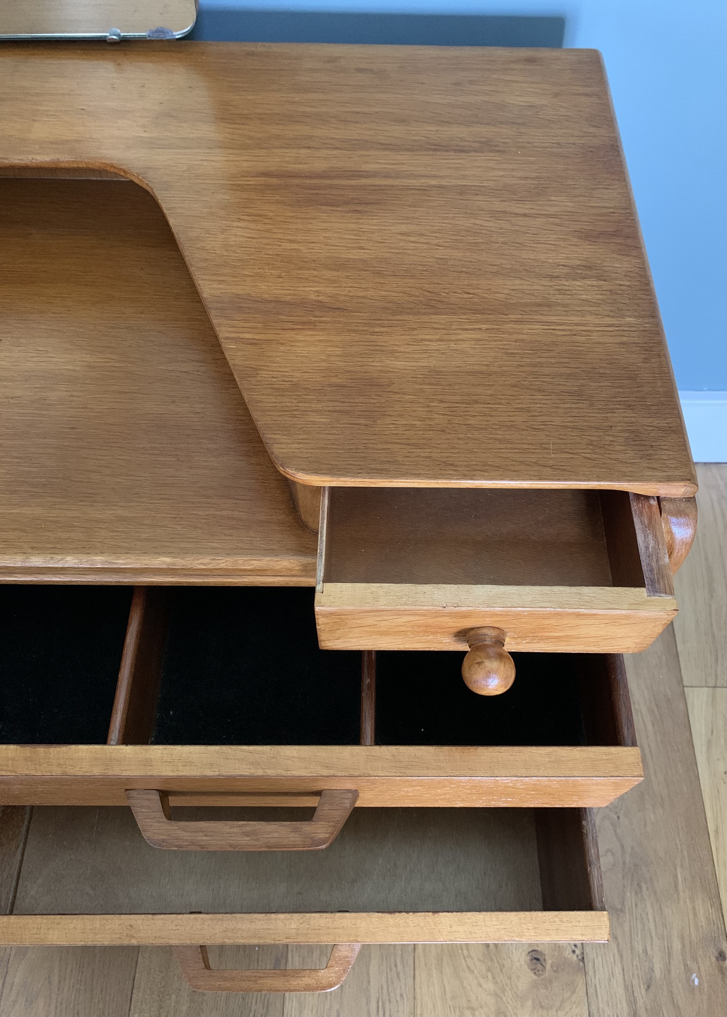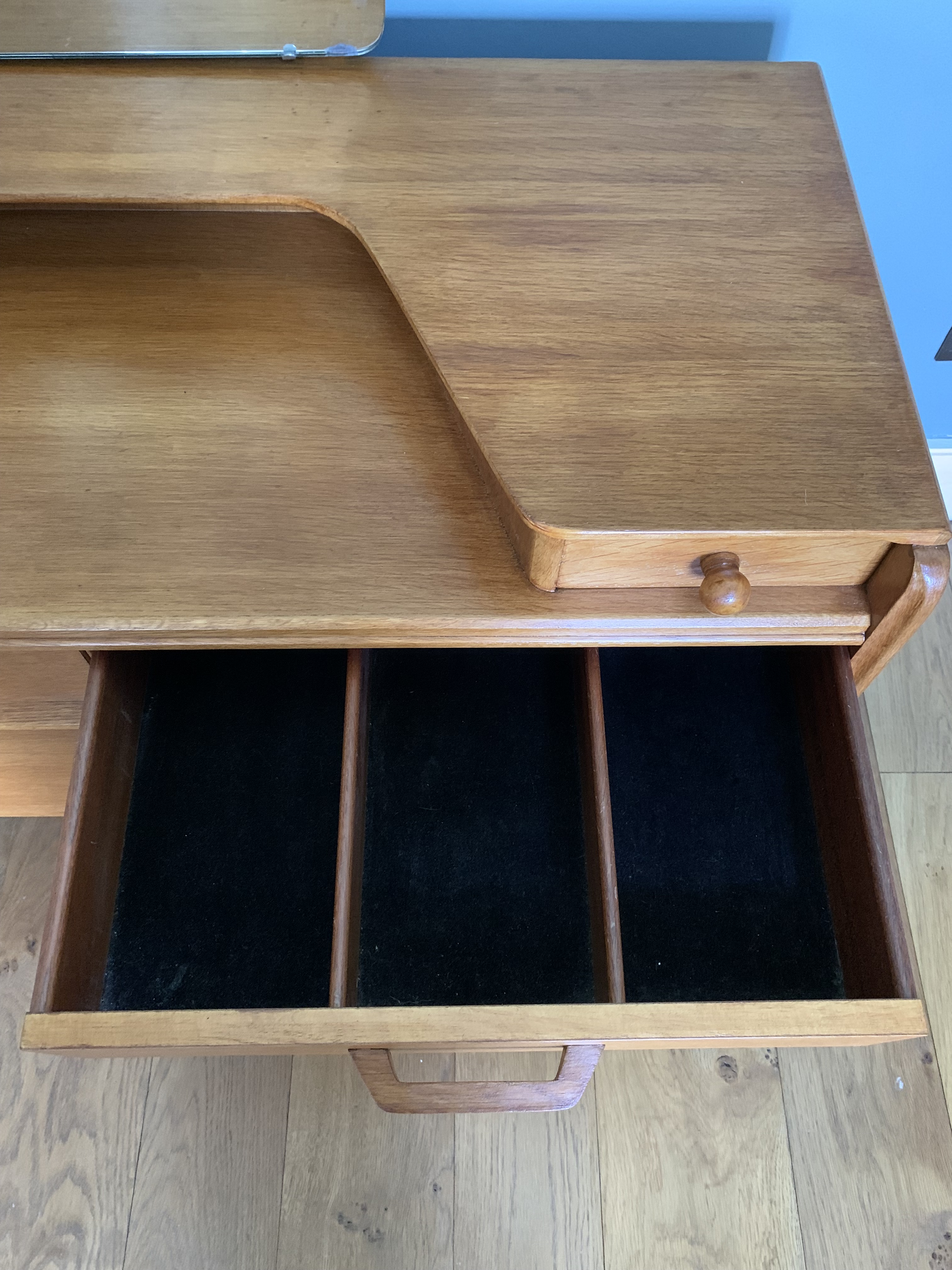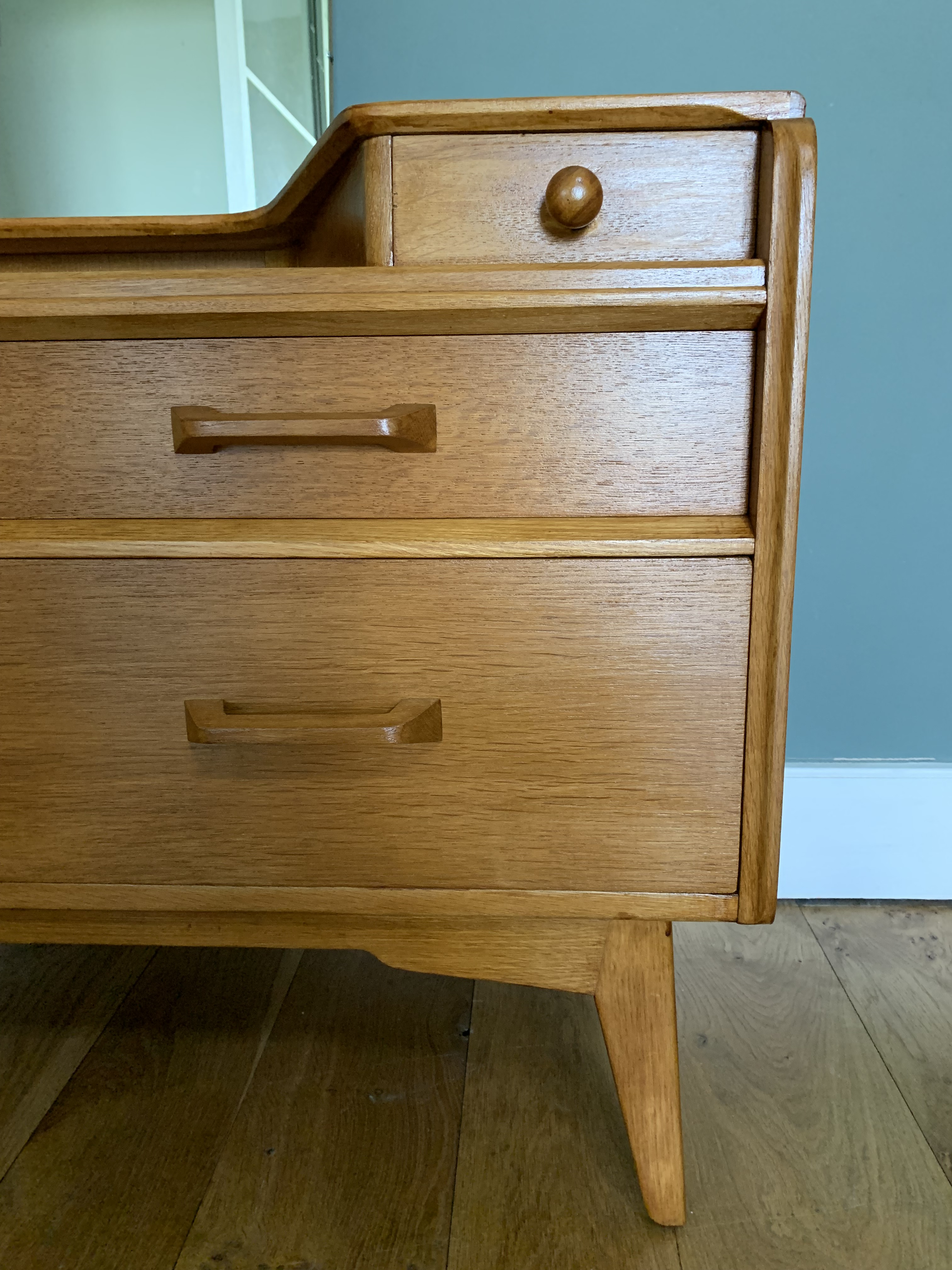 We have given this light oak vintage G Plan dressing table with detachable mirror a new lease of life for the modern home. This G Plan dressing table was cherished and beautifully cared for by one loving owner in Cheltenham, but when we acquired it, the wood looked a bit dull and tired, so we have sanded it down and re-varnished the entire unit with a lovely light yet rich varnish, for a sleek and chic finish. We have kept the mirror in its original condition with its lovely patina and natural mirror ageing, refurbished the wooden mirror attachments and replaced the two small drawer handles. There is a huge amount of storage space with one extra large bottom drawer, two large drawers above this and two small hinged drawers at the top which open fully on the diagonal. The dressing table also features the G Plan makers mark. This mid century dressing table is from the G Plan Brandon range and dates back to 1950s and we can’t wait for it to find its new modern home. SOLD