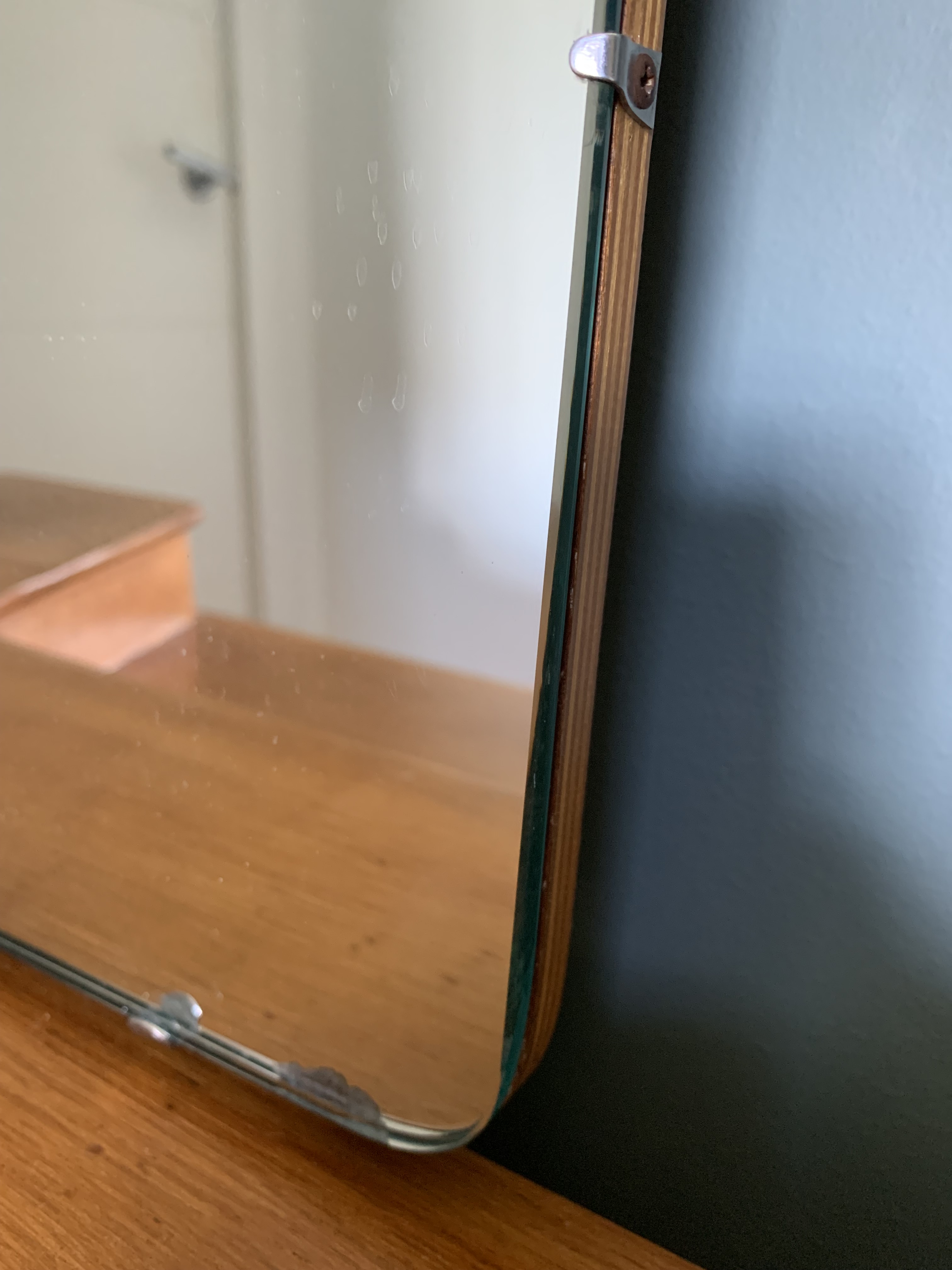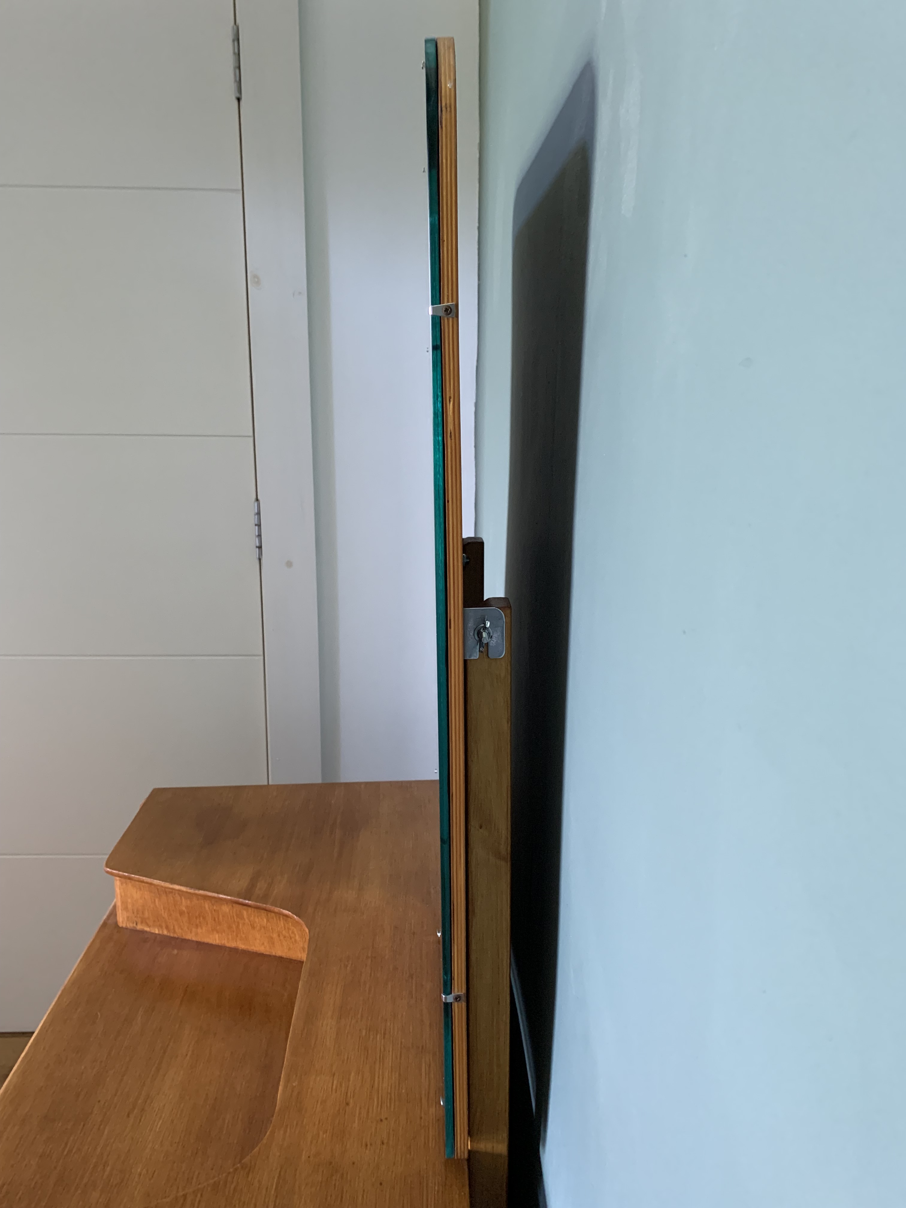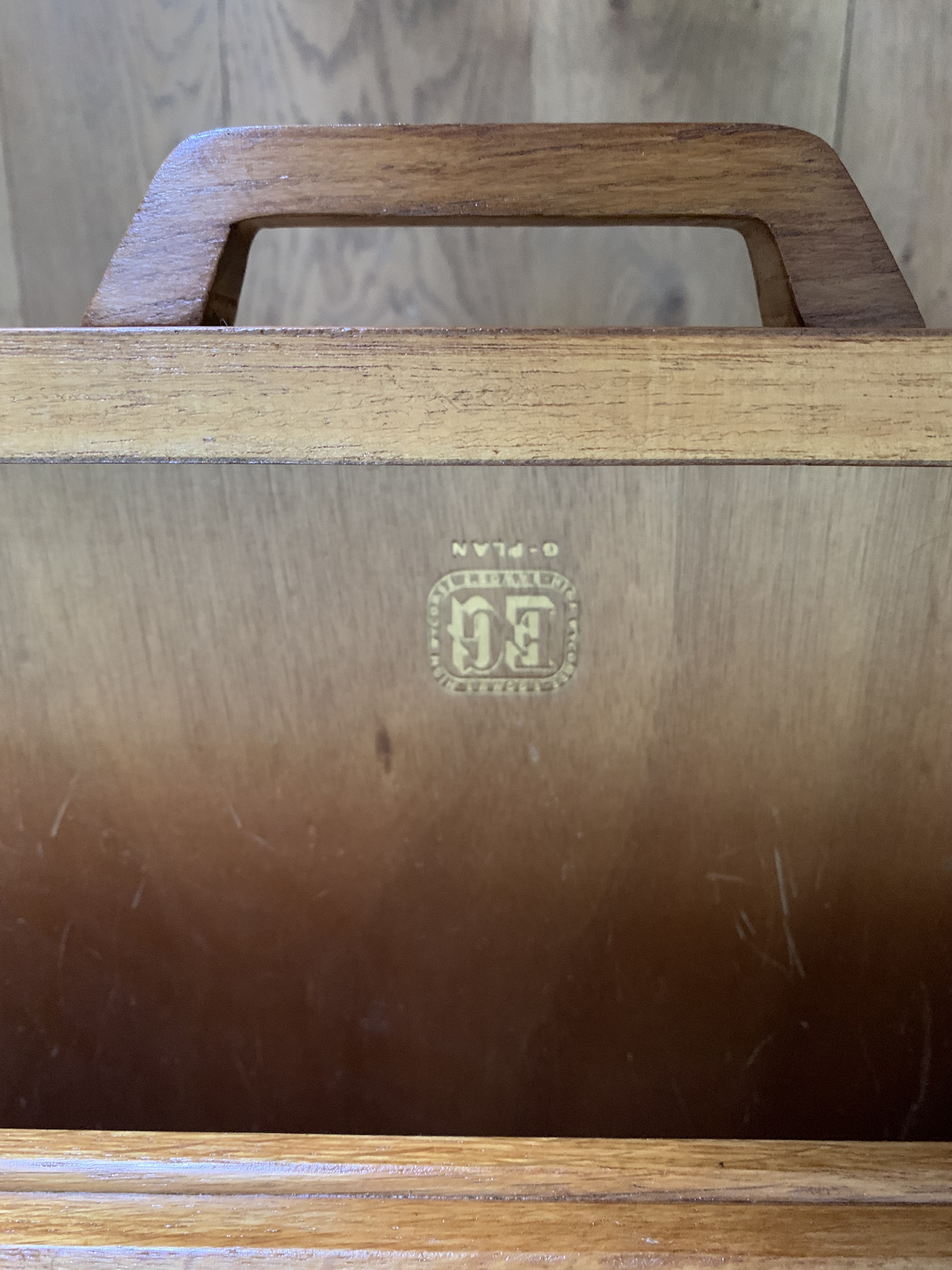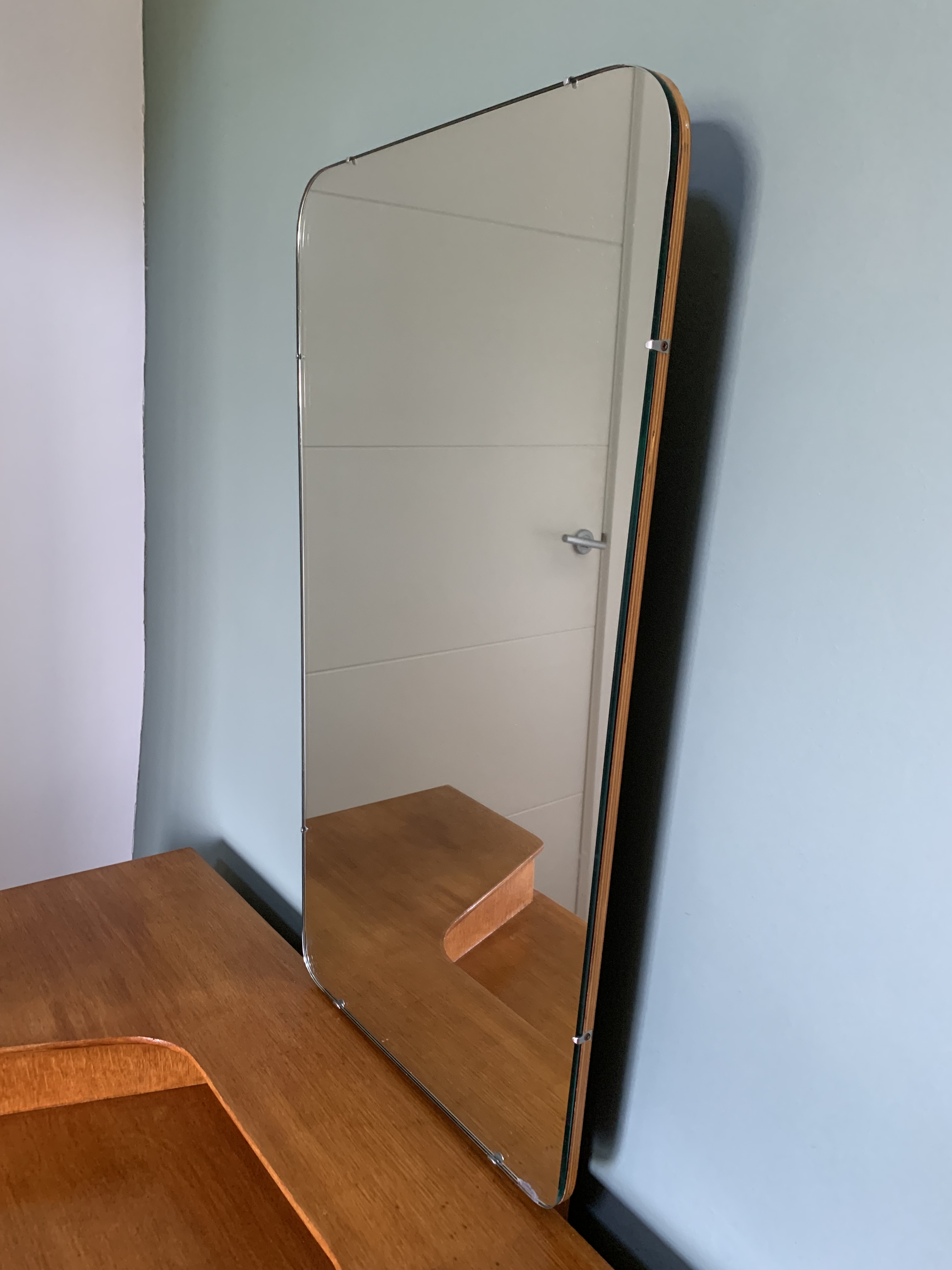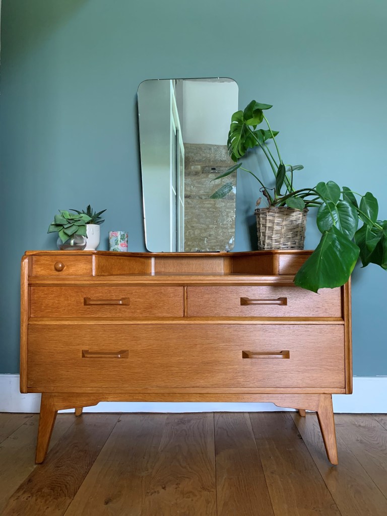 We have given this light oak vintage G Plan dressing table with detachable mirror a new lease of life for the modern home. This G Plan dressing table was cherished and beautifully cared for by one loving owner in Cheltenham, but when we acquired it, the wood looked a bit dull and tired, so we have sanded it down and re-varnished the entire unit with a lovely light yet rich varnish, for a sleek and chic finish. We have kept the mirror in its original condition with its lovely patina and natural mirror ageing, refurbished the wooden mirror attachments and replaced the two small drawer handles. There is a huge amount of storage space with one extra large bottom drawer, two large drawers above this and two small hinged drawers at the top which open fully on the diagonal. The dressing table also features the G Plan makers mark. This mid century dressing table is from the G Plan Brandon range and dates back to 1950s and we can’t wait for it to find its new modern home. SOLD