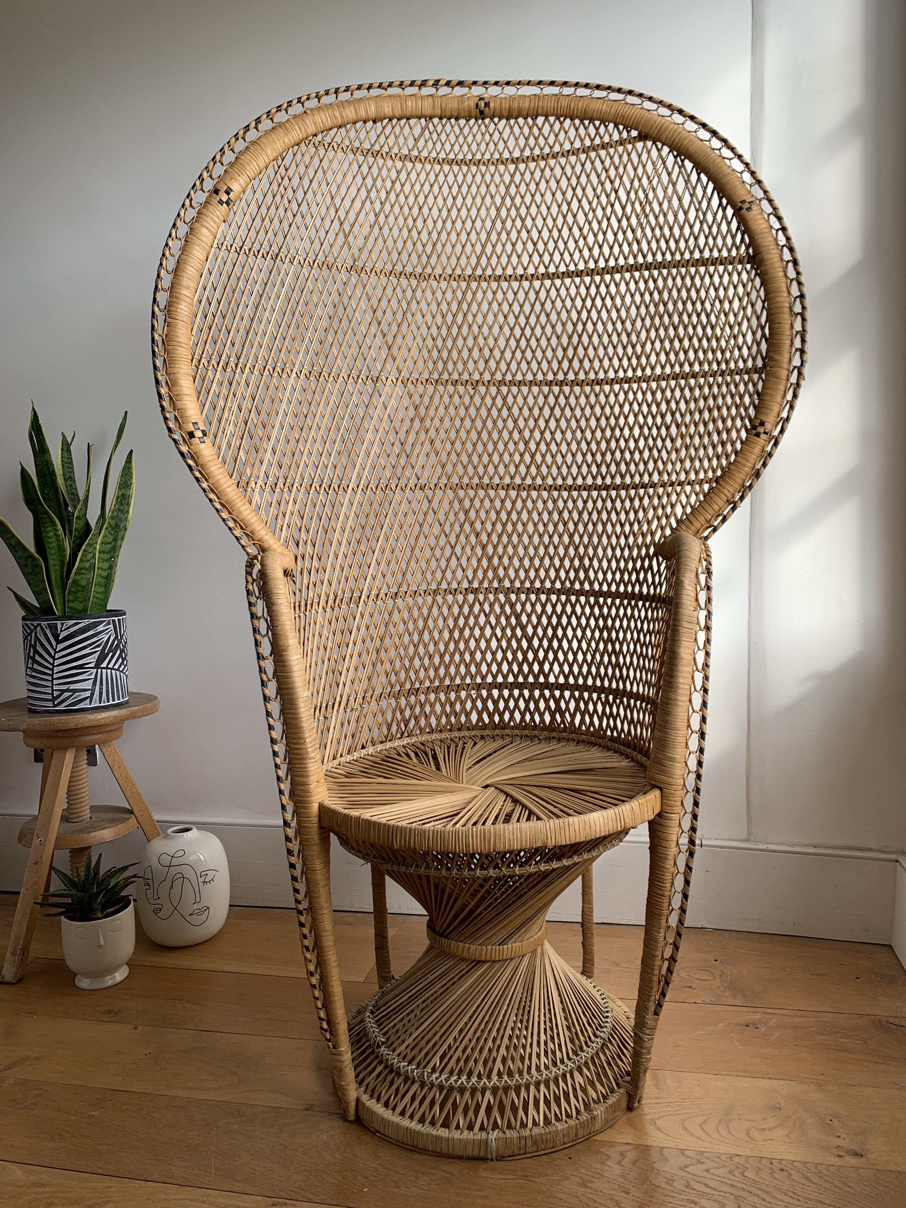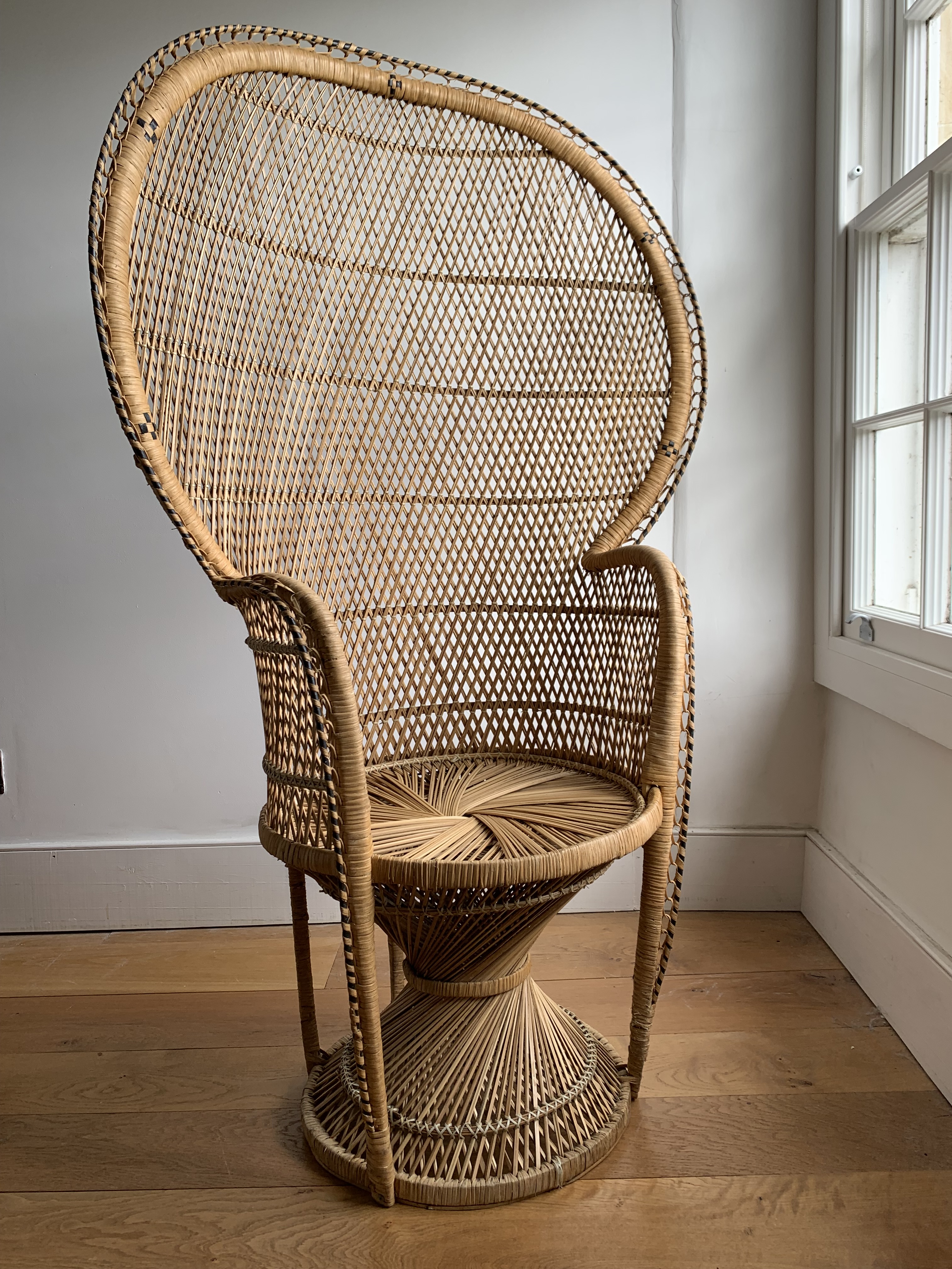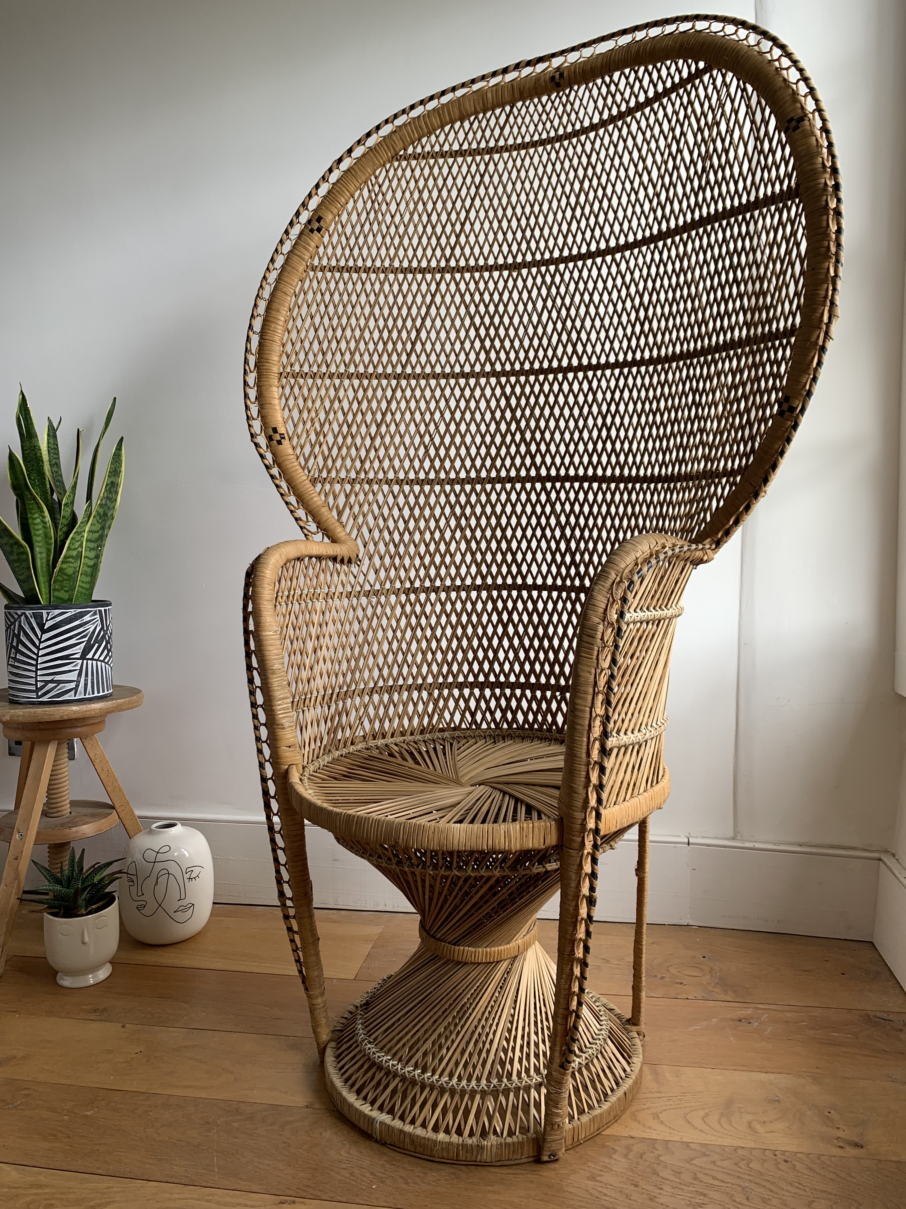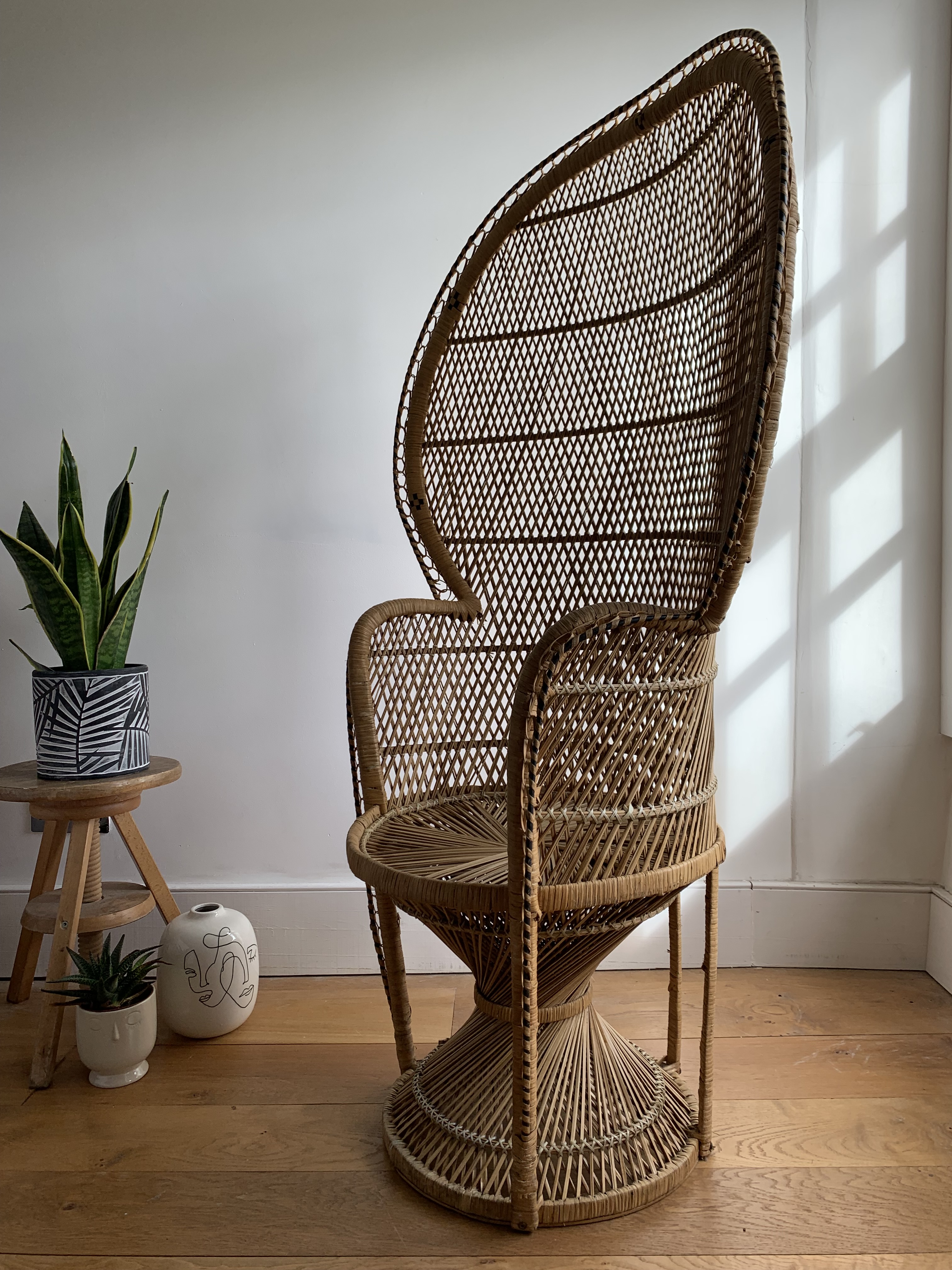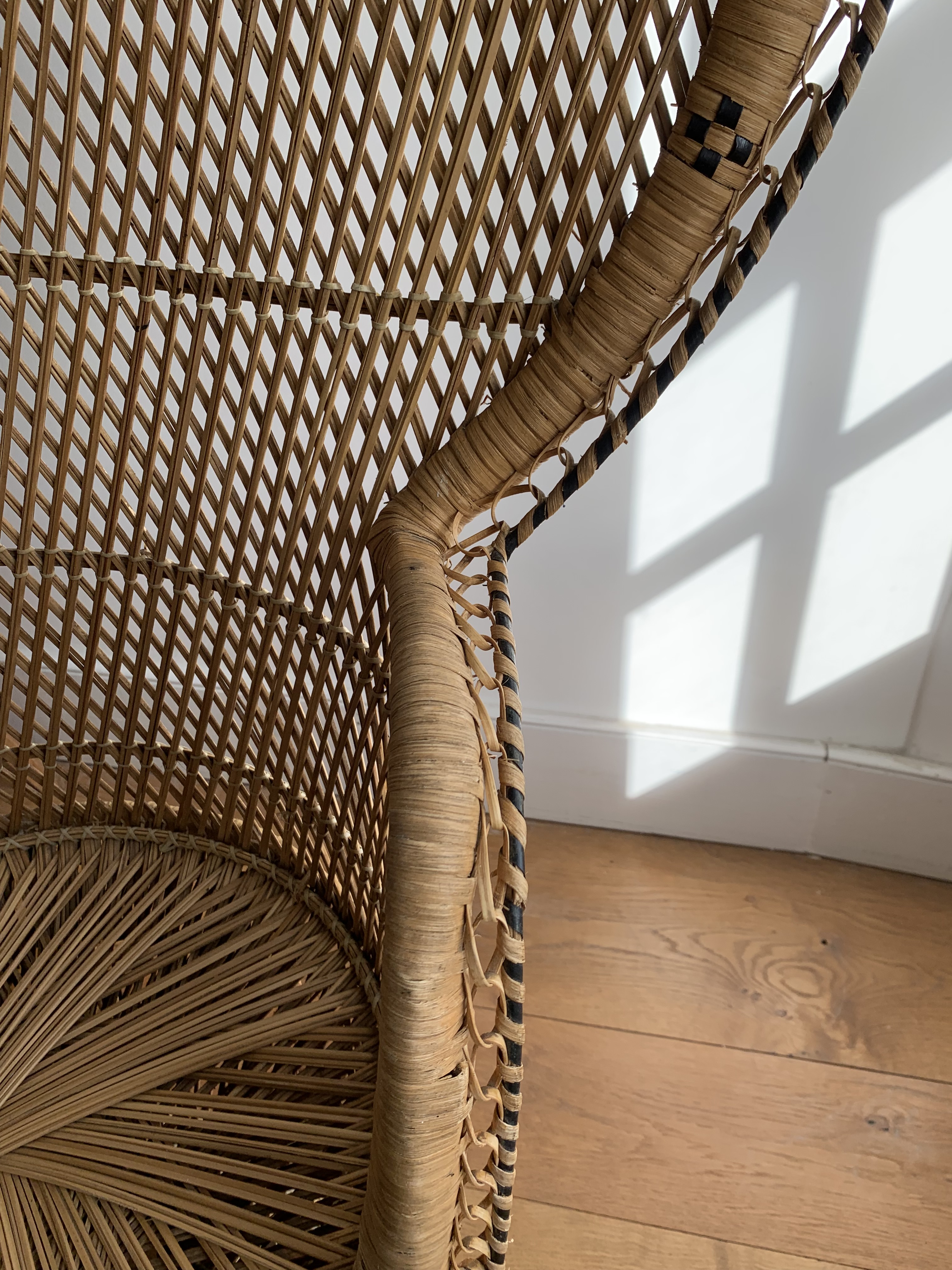 An original 1970s peacock chair in great condition crafted from cane and with subtle black detailing and trim. This is such a beauty which has been treasured for over 60 years by one owner in the Cotswolds and which we have cleaned and given a new lease of life ready for its new life in your home. The chair is in amazing condition for its age. It is structurally sound and you can sit on it without a worry – the cane on the seat and overall is in excellent condition. There are just a few minor signs of age related wear to a few areas of the cane as you can see from the pictures. It would make a great addition to so many modern interiors, adding a luxe bohemian or elegant retro feel. Price £295
