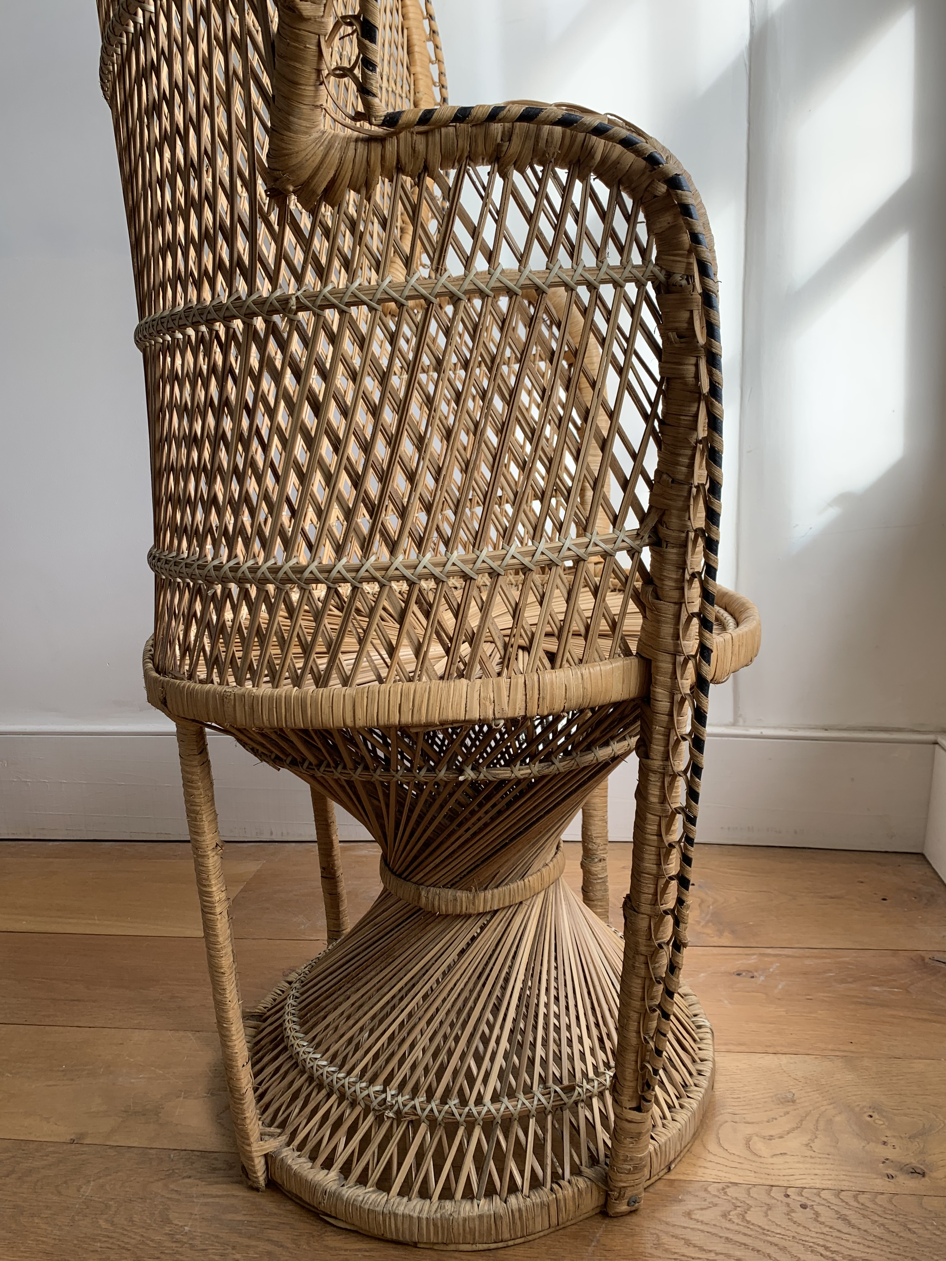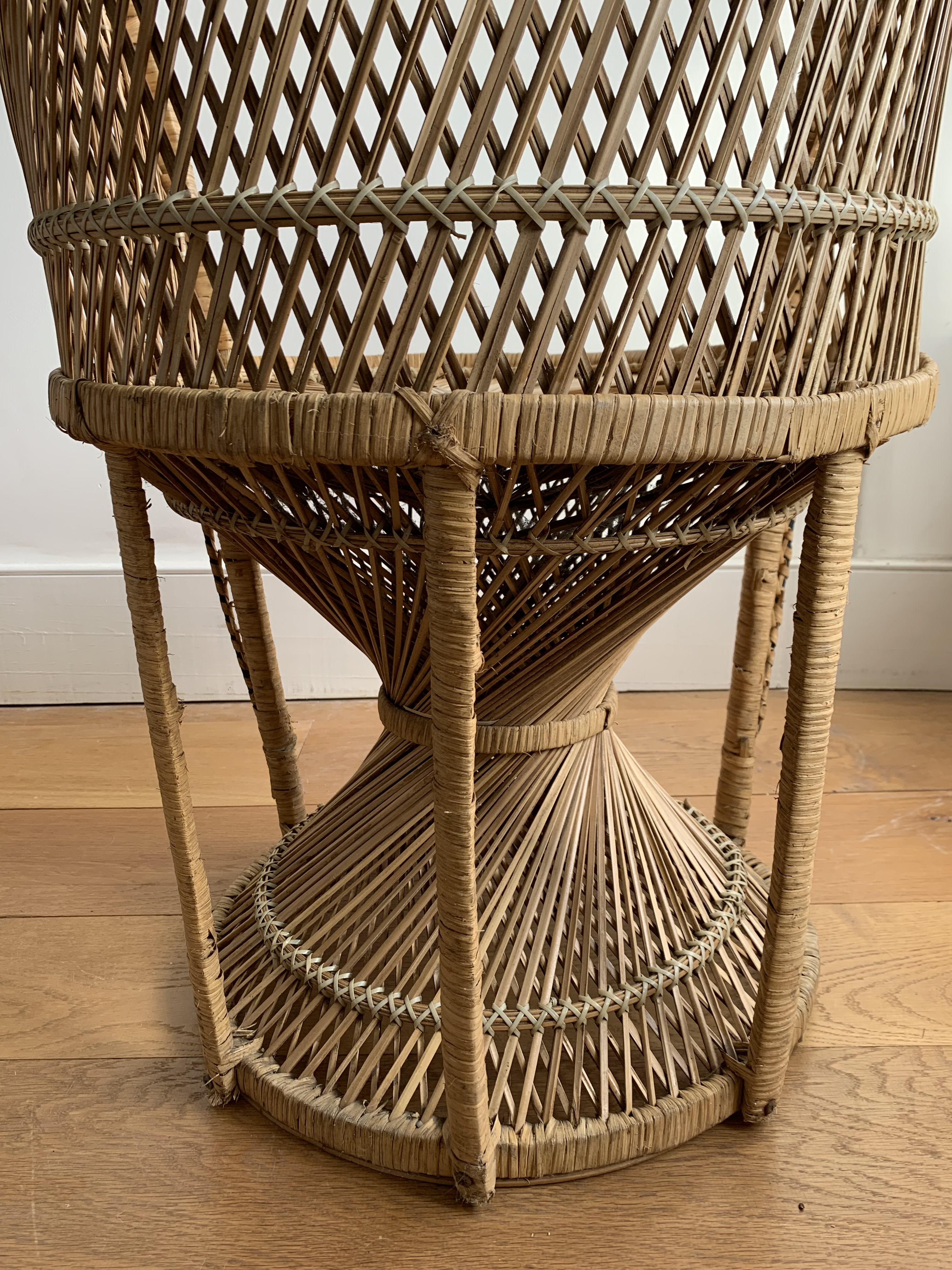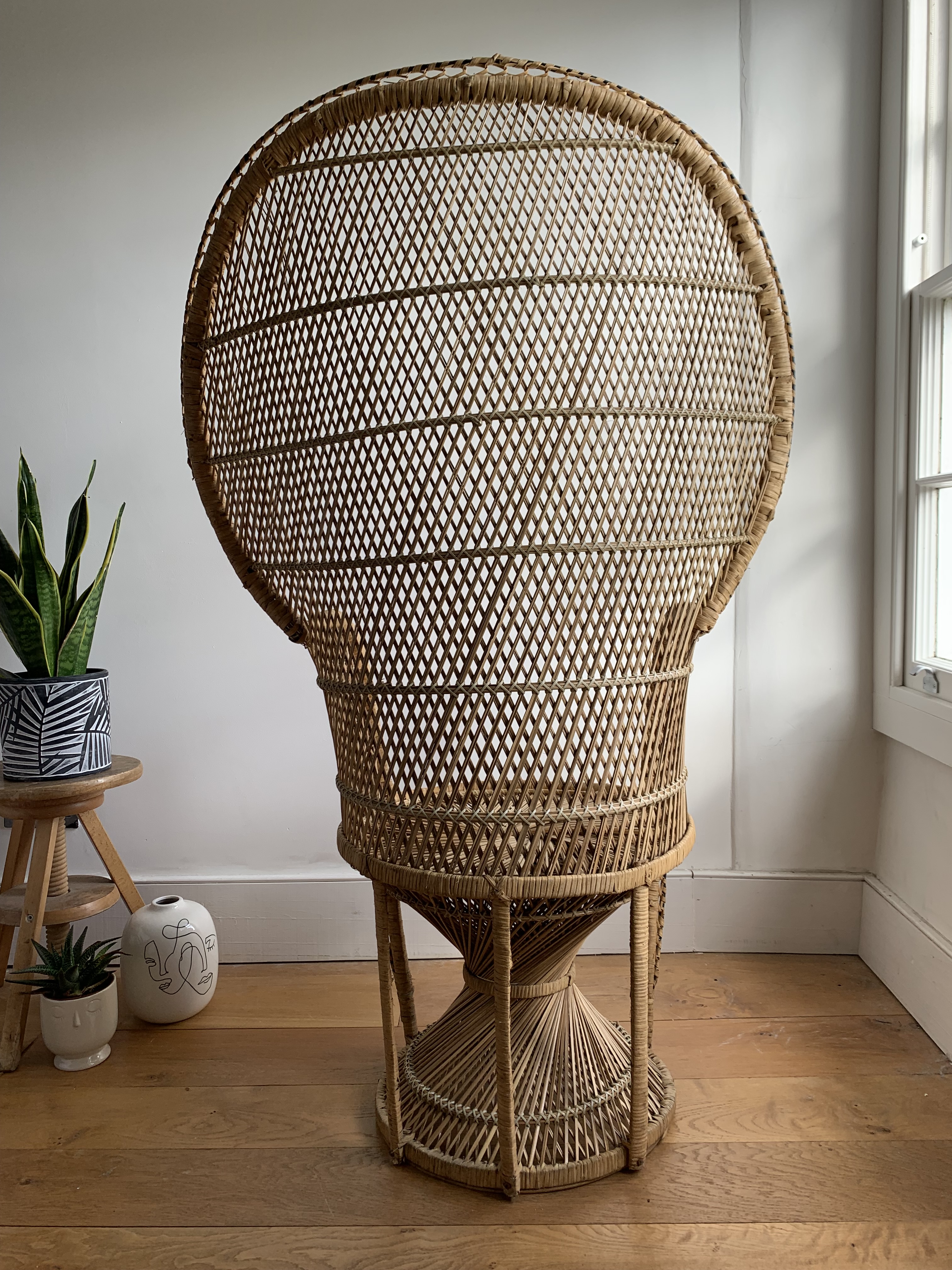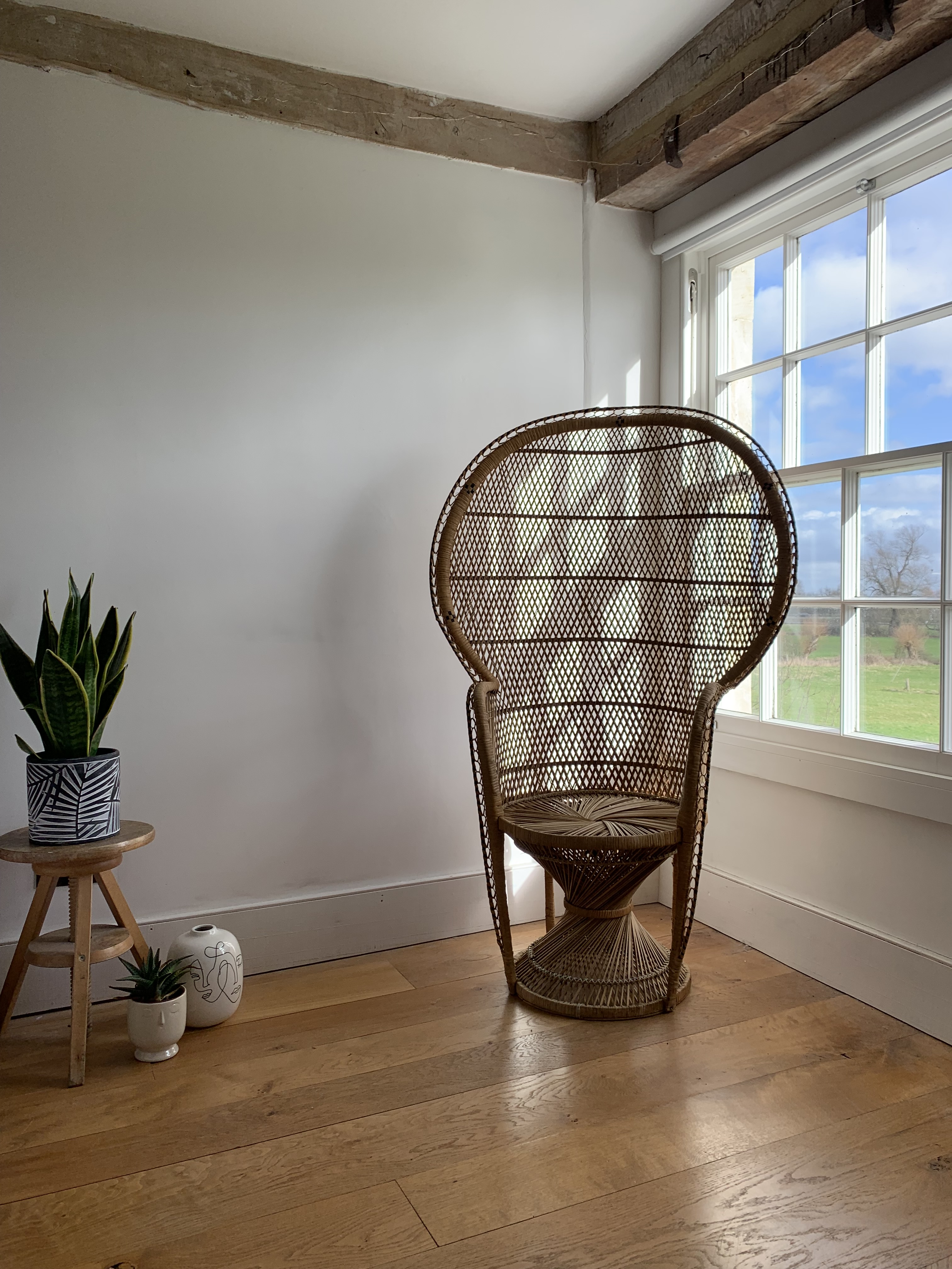An original 1970s peacock chair in great condition crafted from cane and with subtle black detailing and trim. This is such a beauty which has been treasured for over 60 years by one owner in the Cotswolds and which we have cleaned and given a new lease of life ready for its new life in your home. The chair is in amazing condition for its age. It is structurally sound and you can sit on it without a worry – the cane on the seat and overall is in excellent condition. There are just a few minor signs of age related wear to a few areas of the cane as you can see from the pictures. It would make a great addition to so many modern interiors, adding a luxe bohemian or elegant retro feel. Price £295