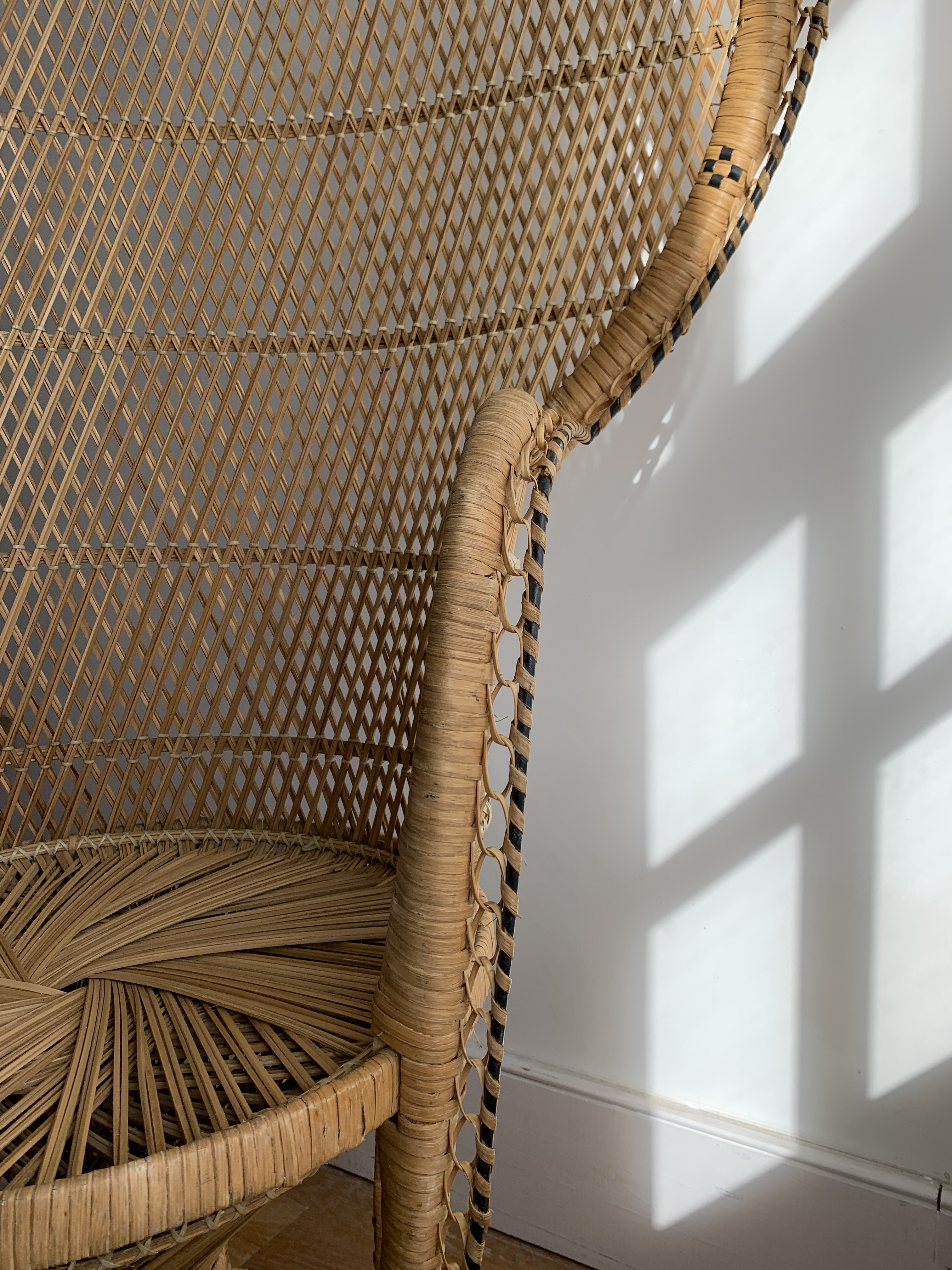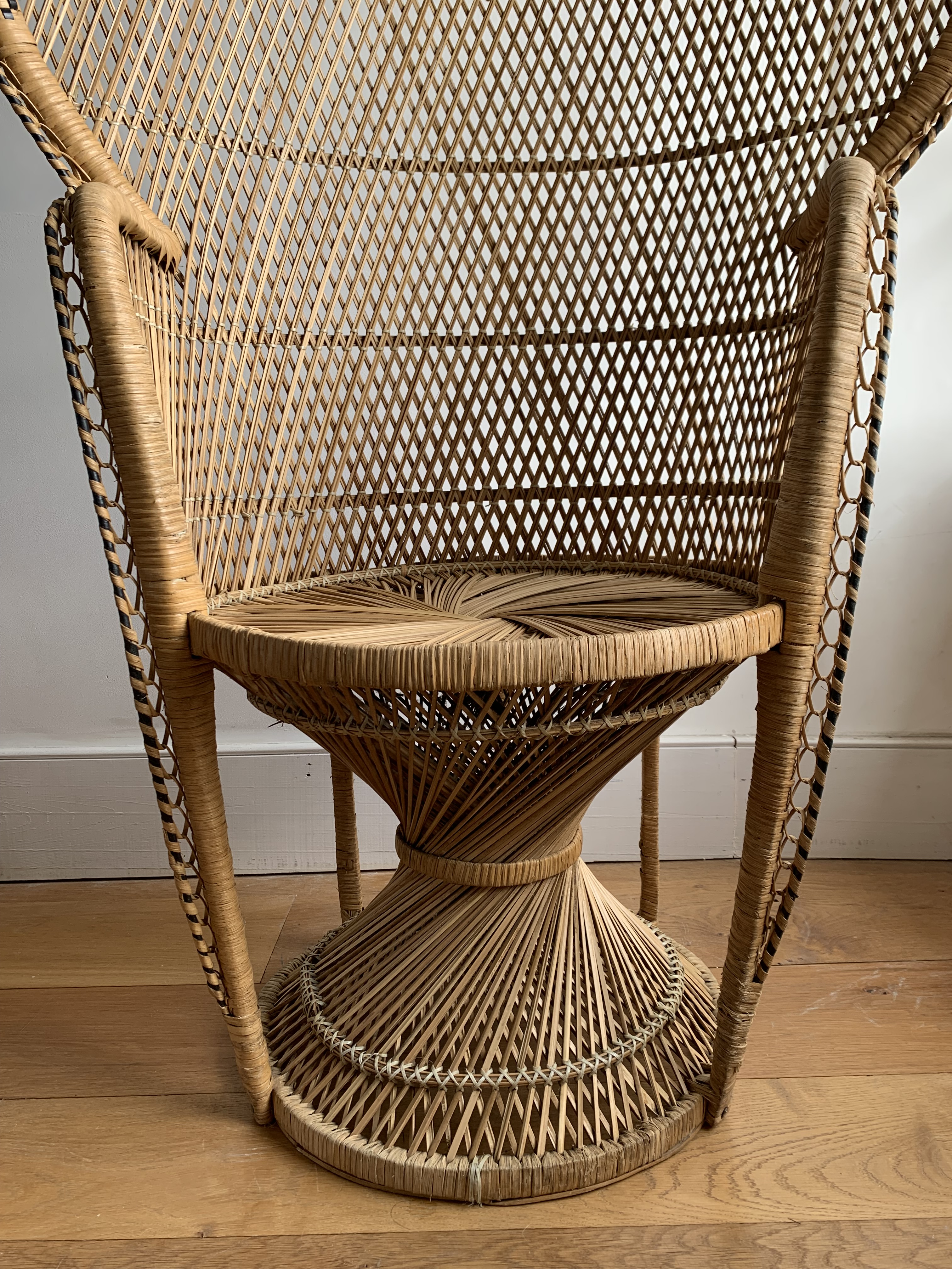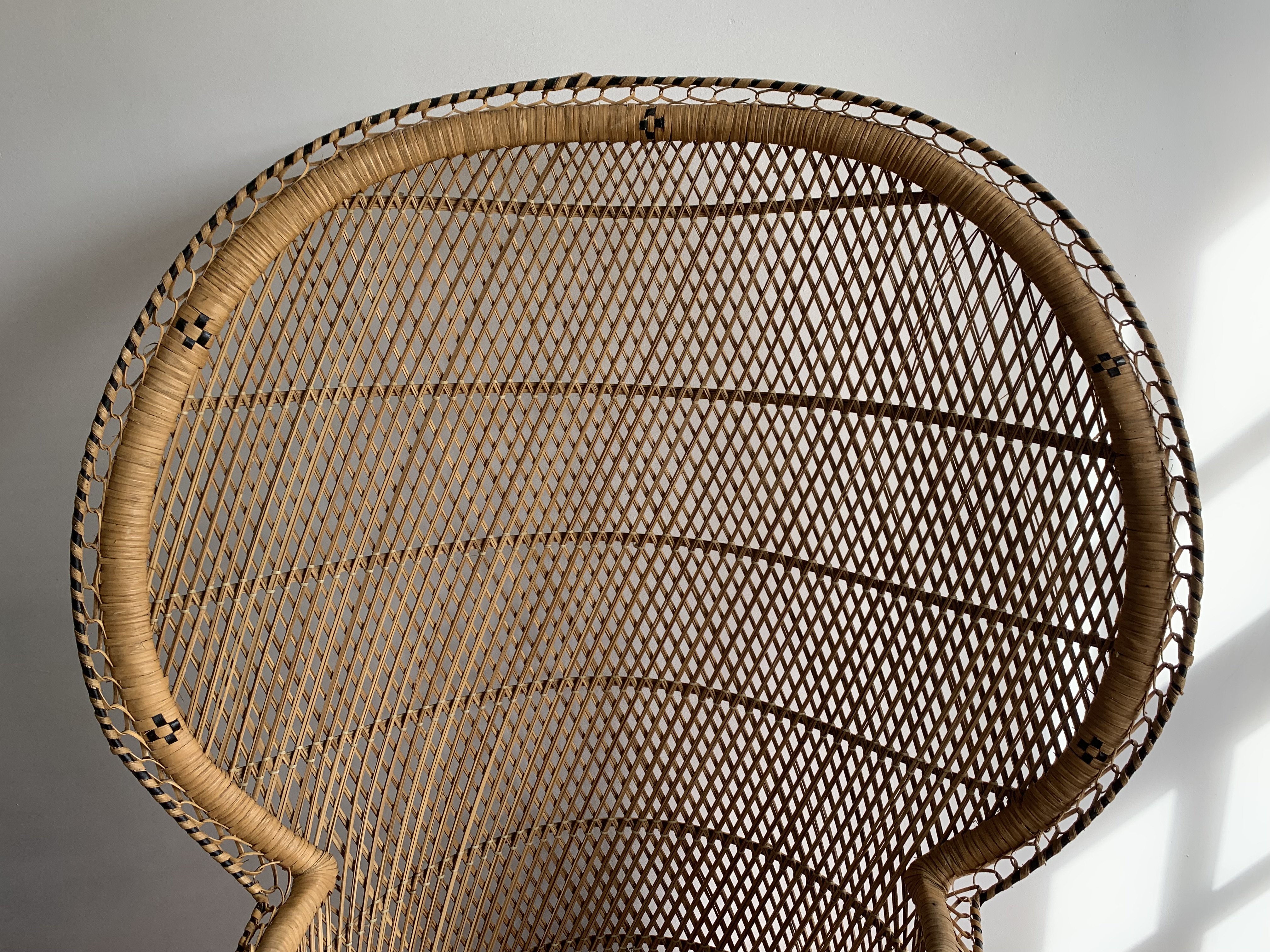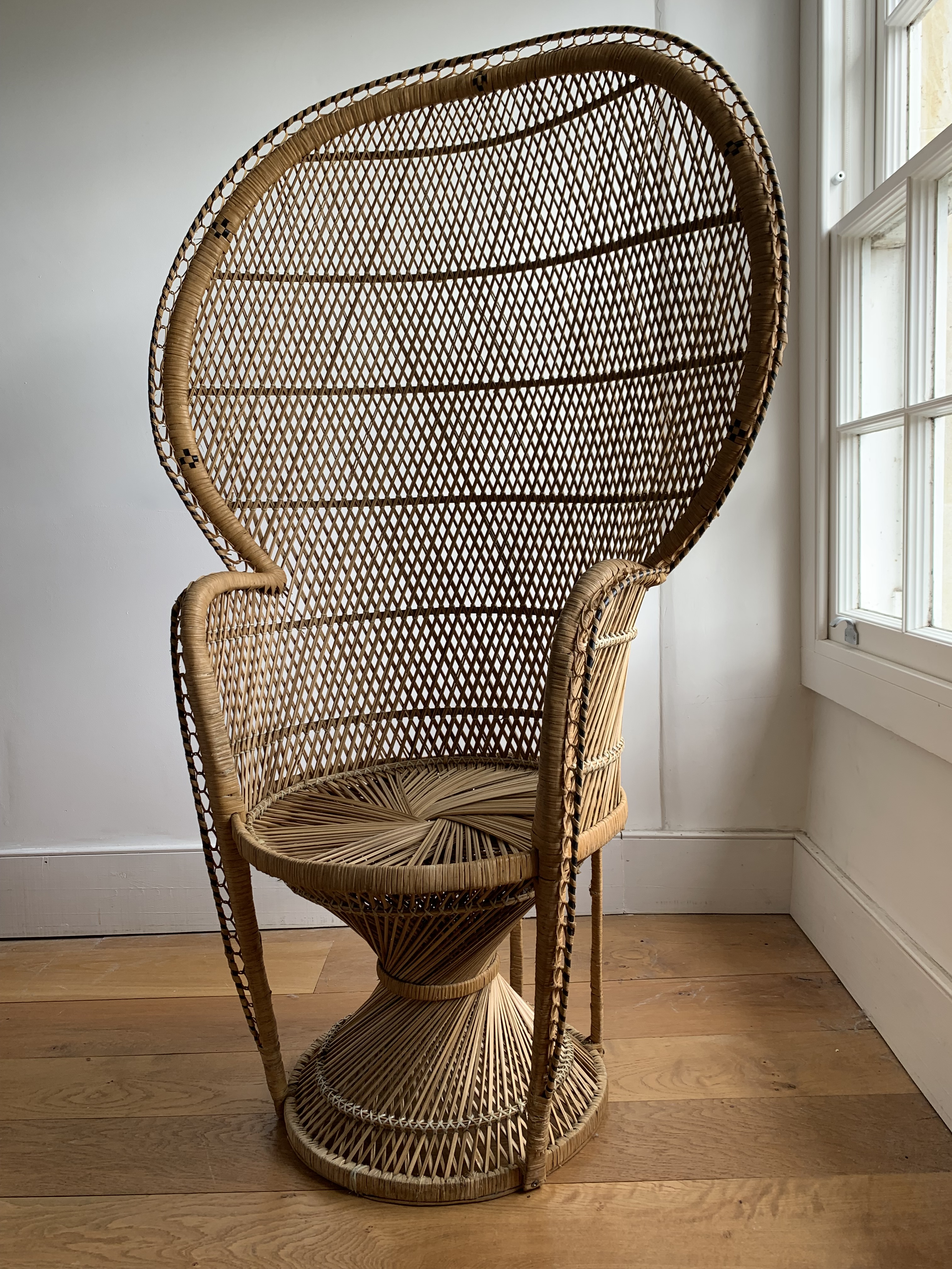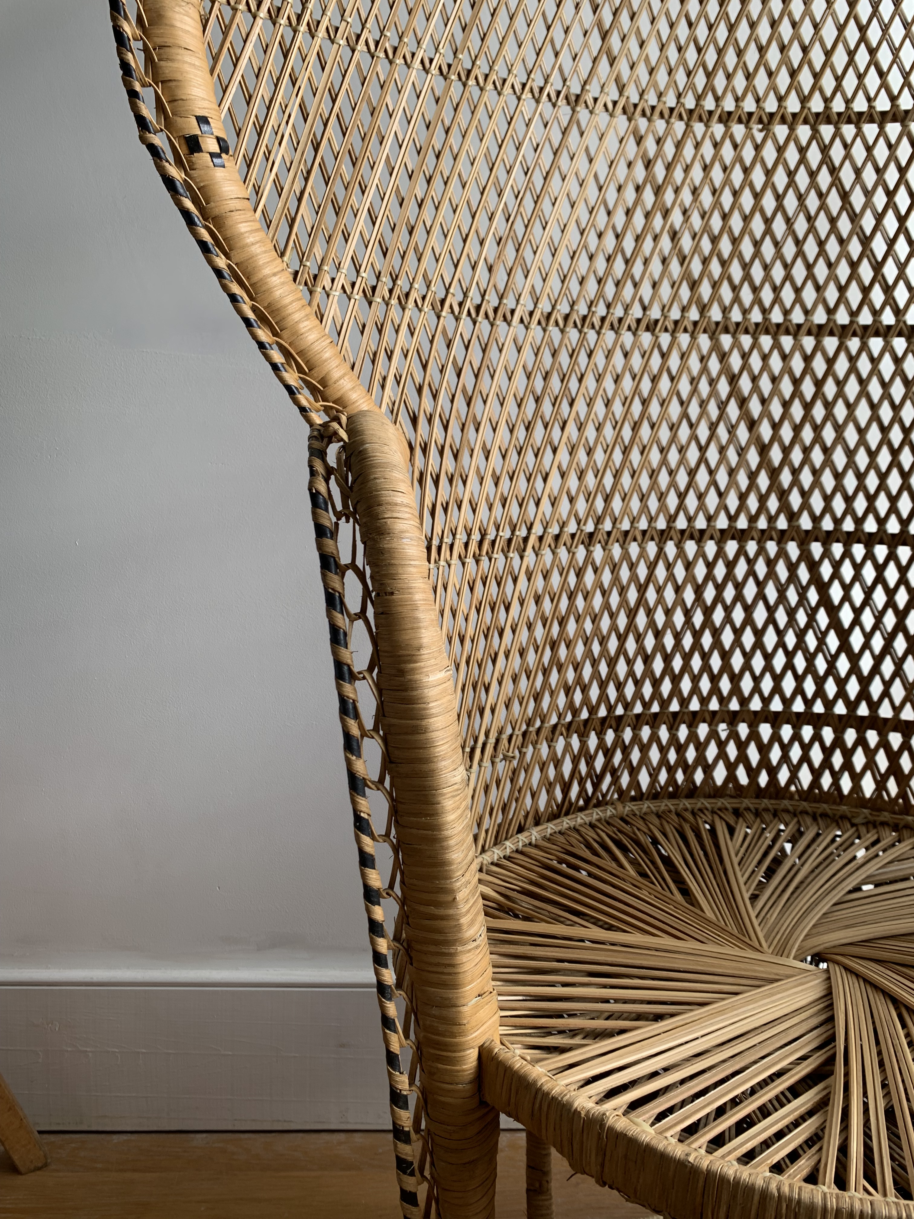 An original 1970s peacock chair in great condition crafted from cane and with subtle black detailing and trim. This is such a beauty which has been treasured for over 60 years by one owner in the Cotswolds and which we have cleaned and given a new lease of life ready for its new life in your home. The chair is in amazing condition for its age. It is structurally sound and you can sit on it without a worry – the cane on the seat and overall is in excellent condition. There are just a few minor signs of age related wear to a few areas of the cane as you can see from the pictures. It would make a great addition to so many modern interiors, adding a luxe bohemian or elegant retro feel. Price £295